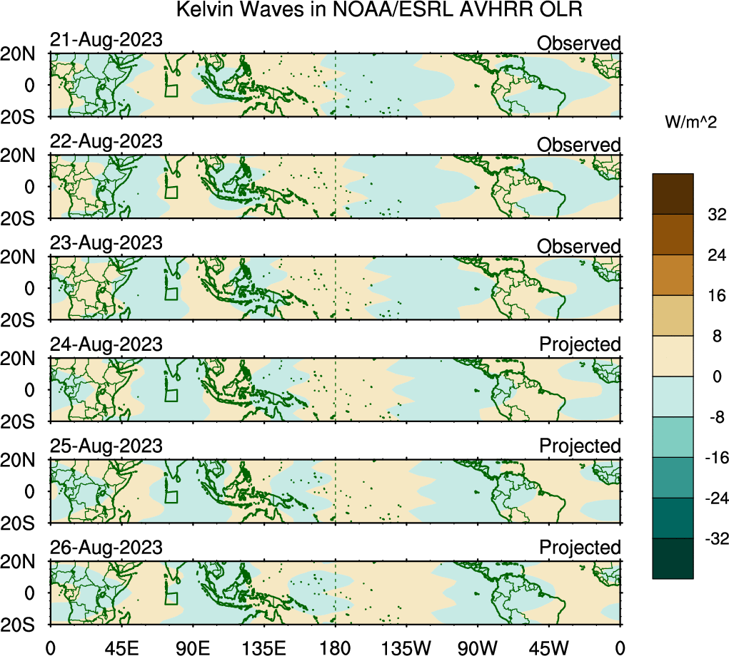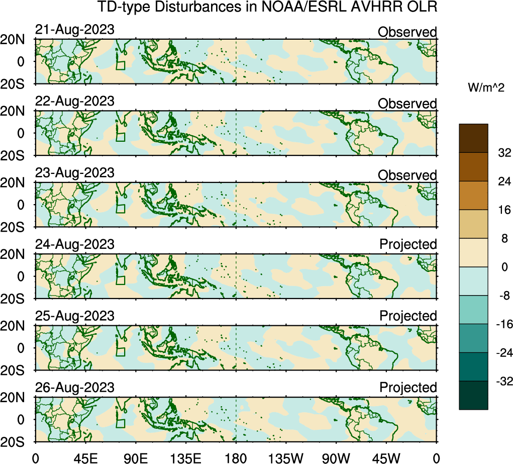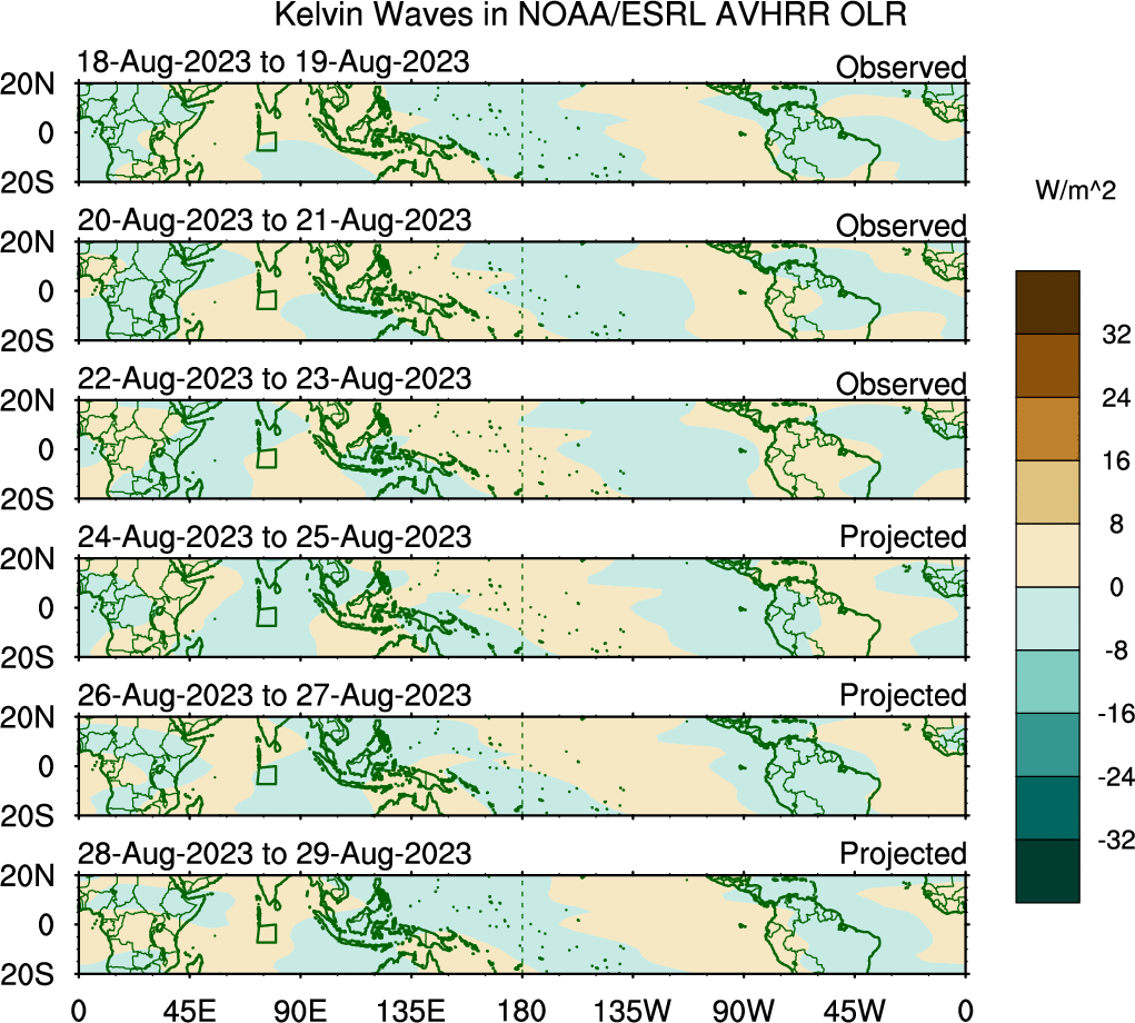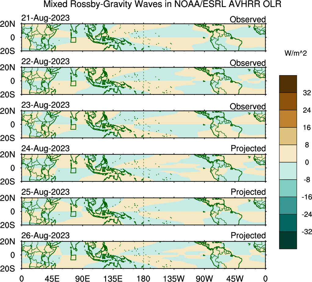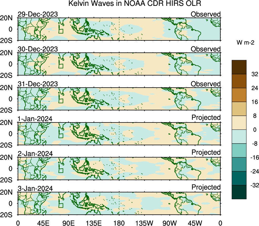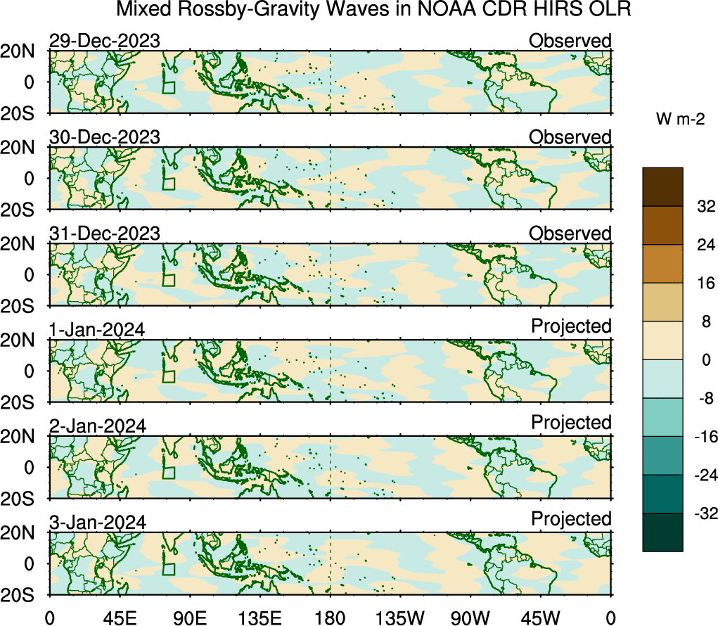 To identify tropical waves in near real-time, the OLR and UTWV data are filtered following Wheeler & Weickmann (2001 MWR). The daily anomalies are calculated using the first 3 harmonics of the seasonal cycle for 1979–2009. Missing values are then filled using linear interpolation in space and time. The most recent 365 days of anomalies are padded with 659 days of zeroes, and the result is filtered for each wave type.
