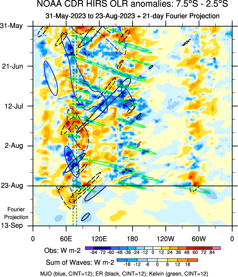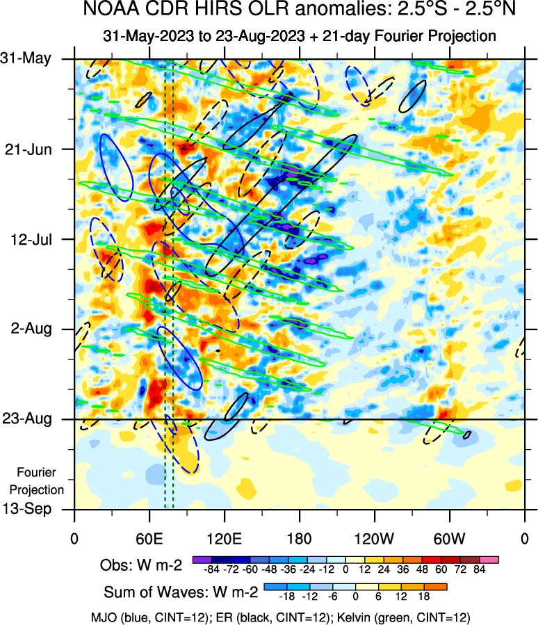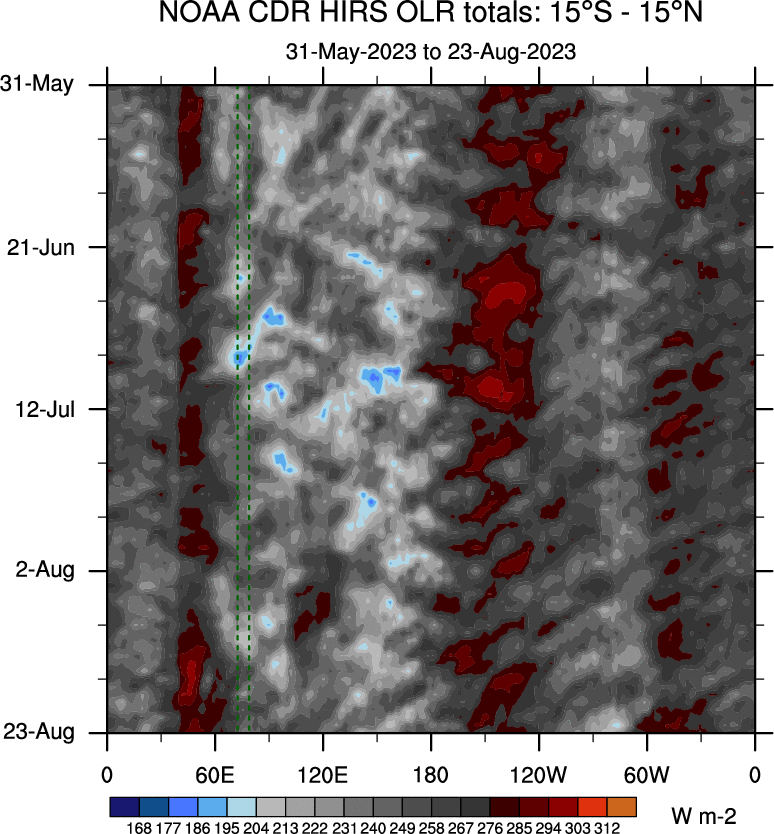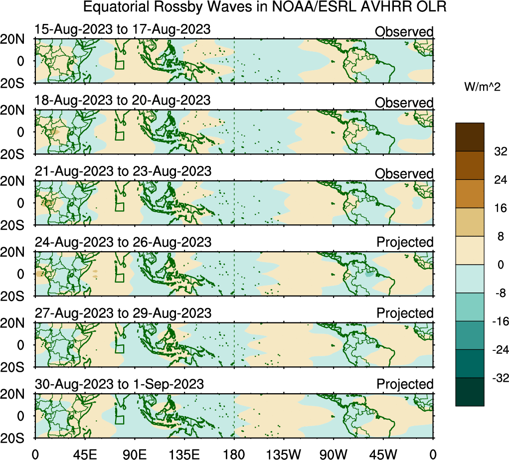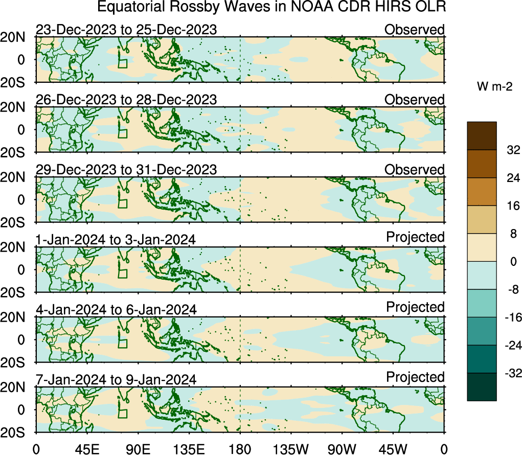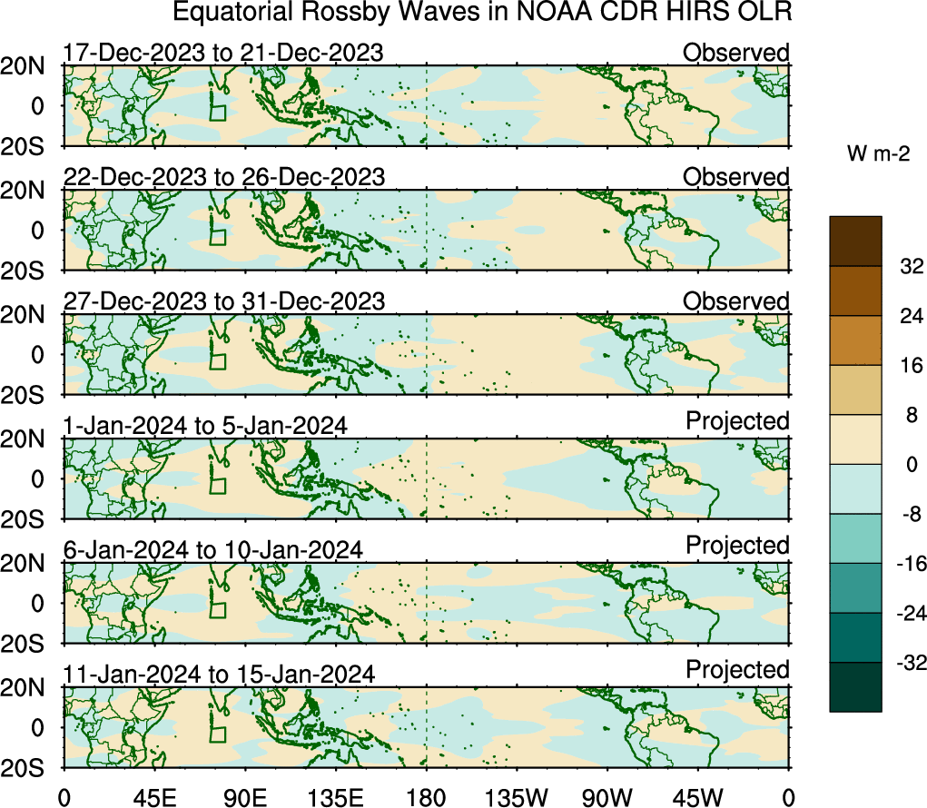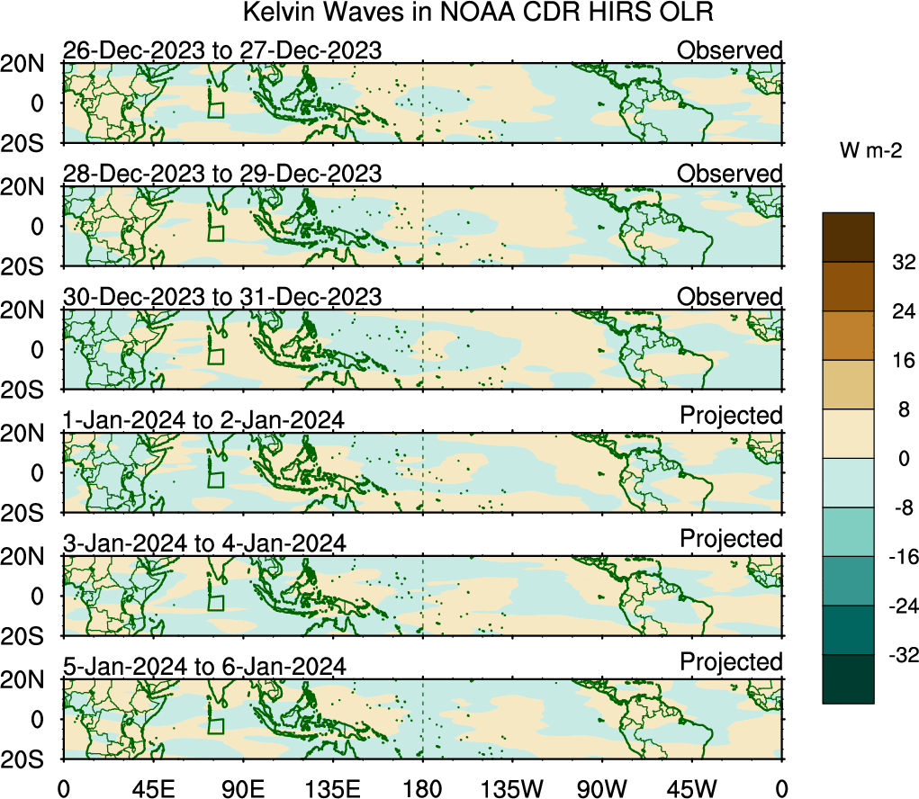 To identify tropical waves in near real-time, the OLR and UTWV data are filtered following Wheeler & Weickmann (2001 MWR). The daily anomalies are calculated using the first 3 harmonics of the seasonal cycle for 1979–2009. Missing values are then filled using linear interpolation in space and time. The most recent 365 days of anomalies are padded with 659 days of zeroes, and the result is filtered for each wave type.
