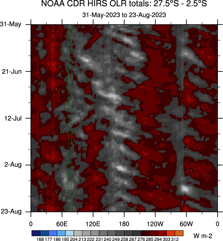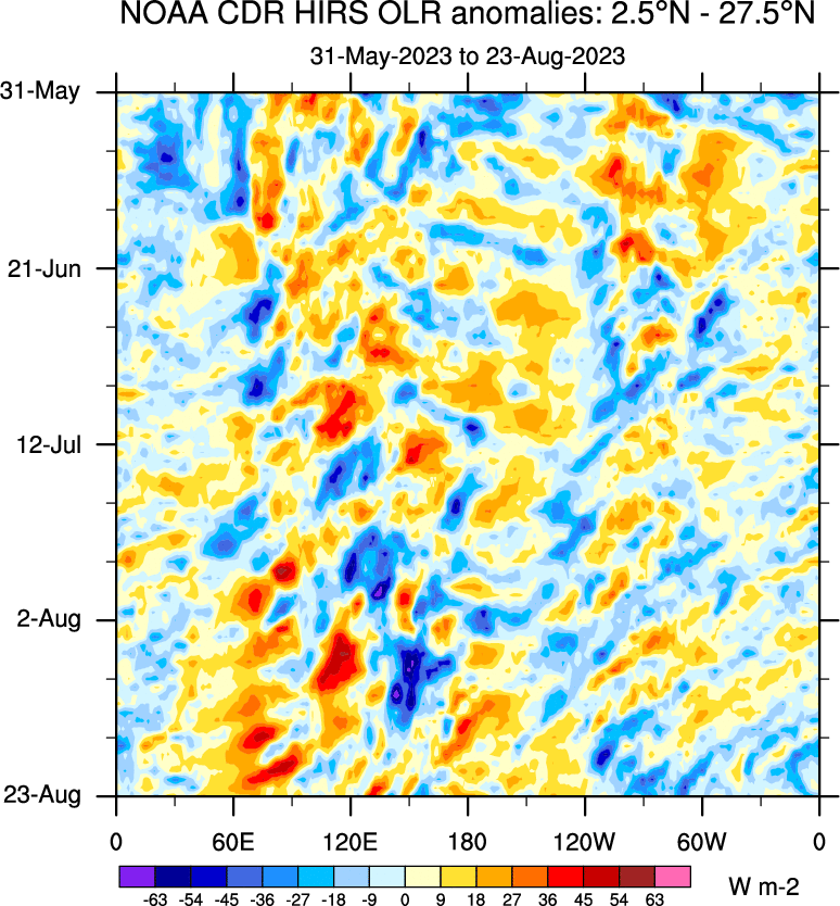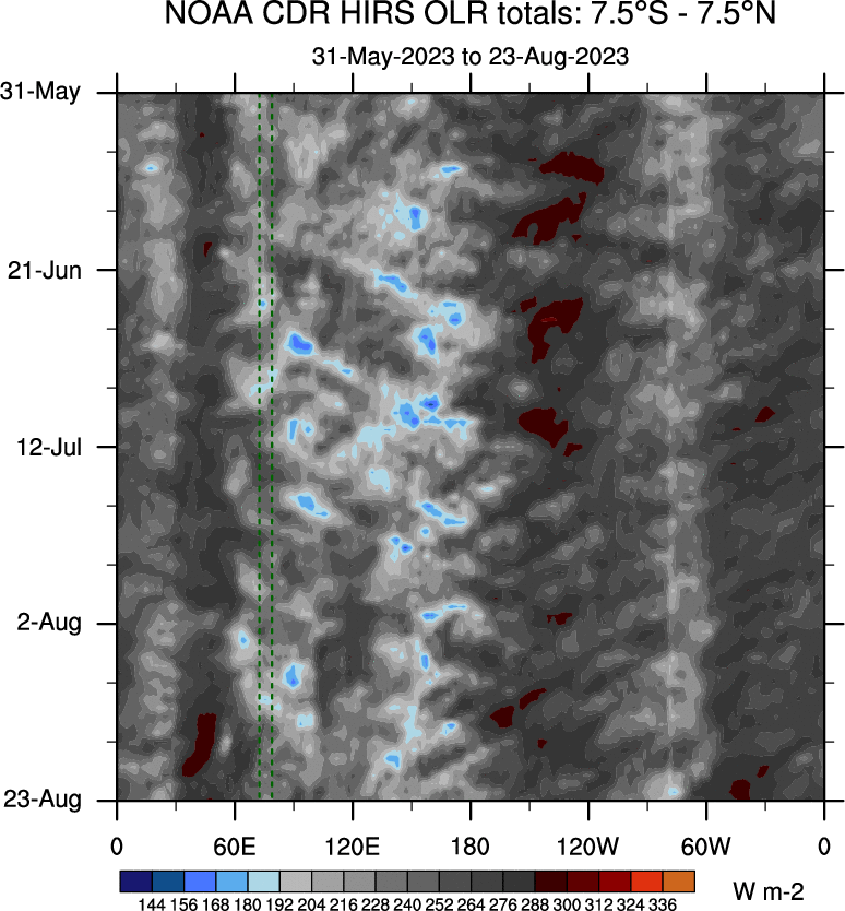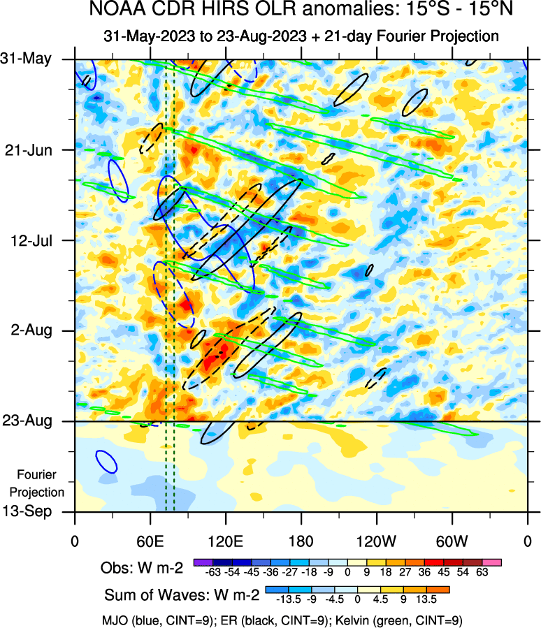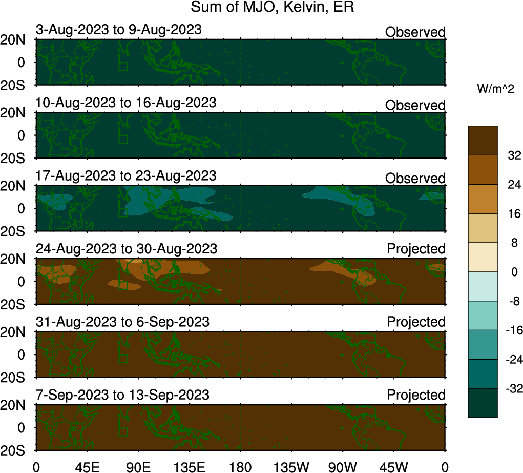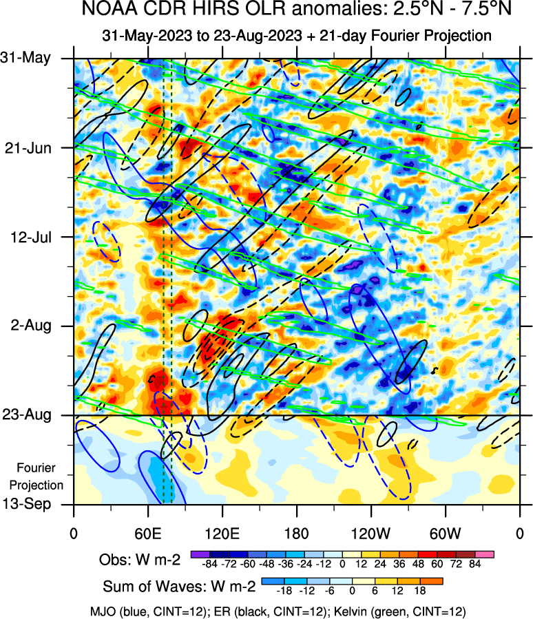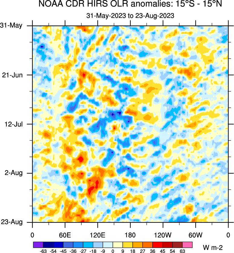 To identify tropical waves in near real-time, the OLR and UTWV data are filtered following Wheeler & Weickmann (2001 MWR). The daily anomalies are calculated using the first 3 harmonics of the seasonal cycle for 1979–2009. Missing values are then filled using linear interpolation in space and time. The most recent 365 days of anomalies are padded with 659 days of zeroes, and the result is filtered for each wave type.