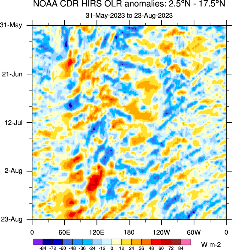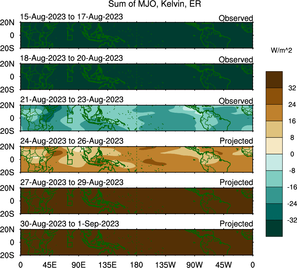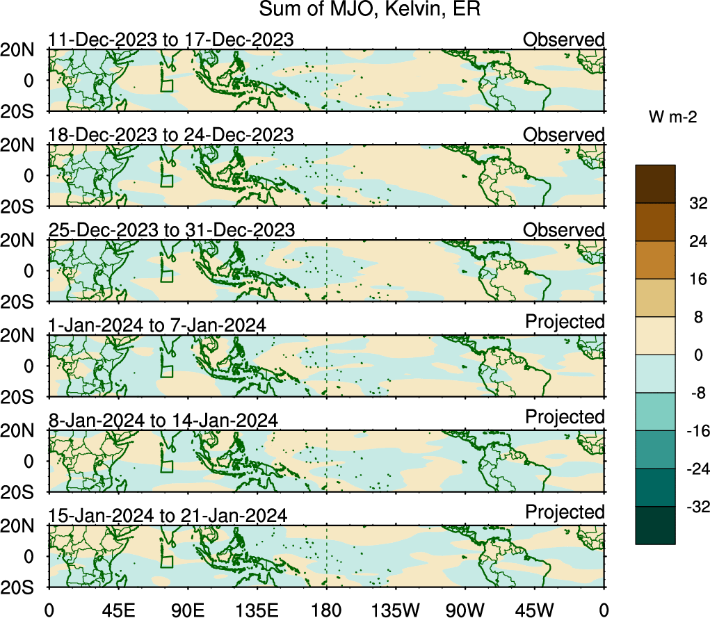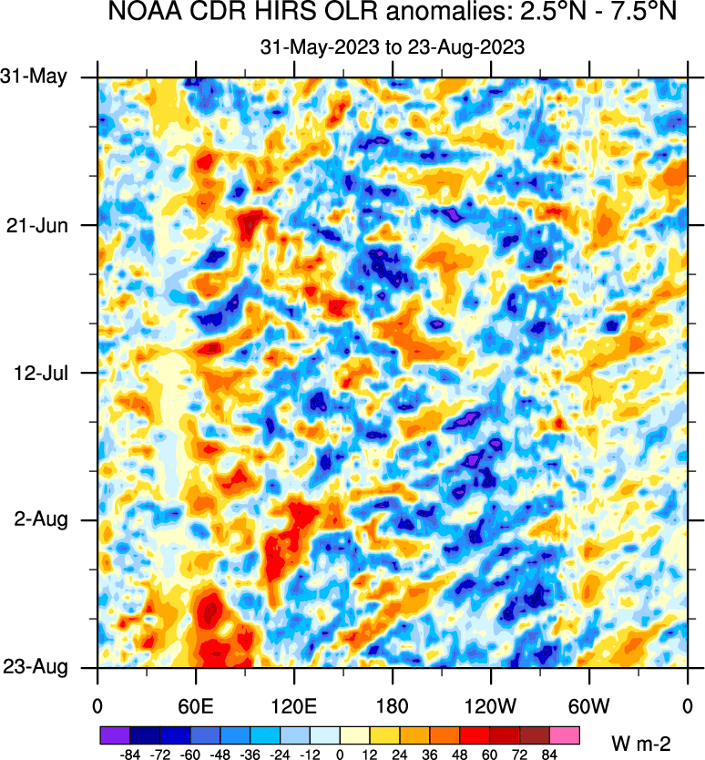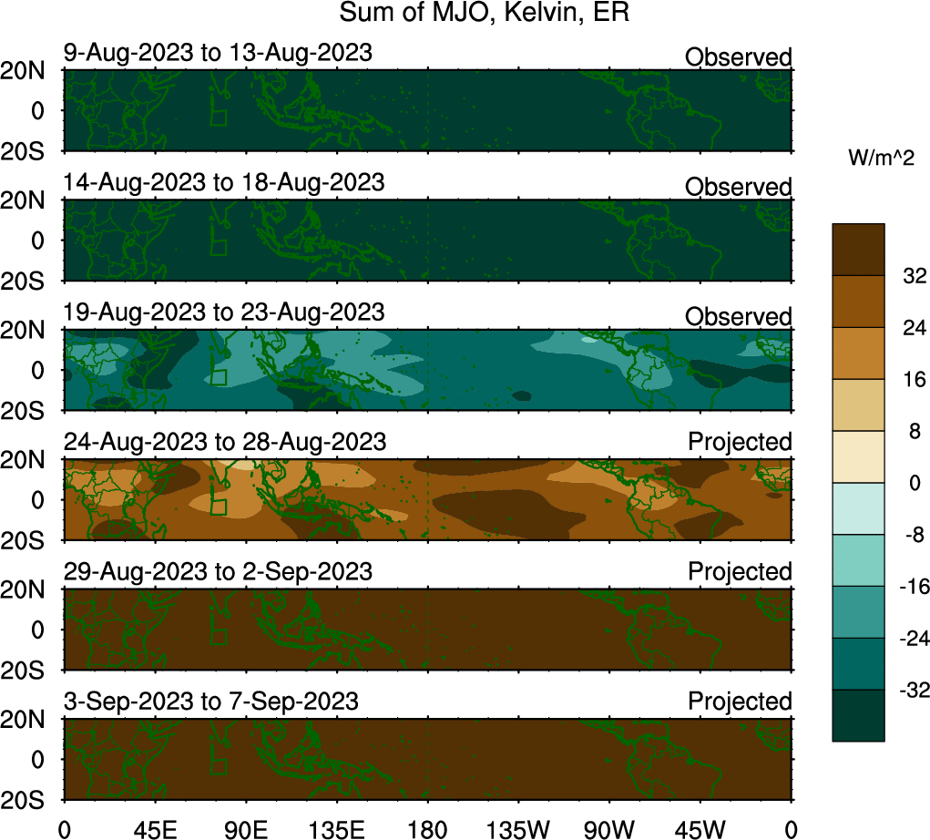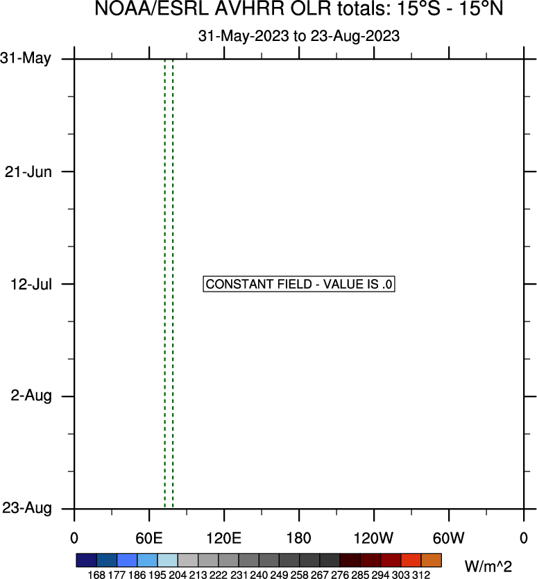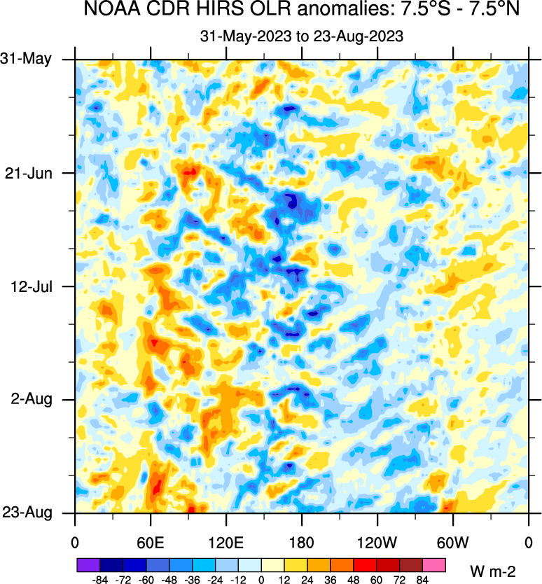 To identify tropical waves in near real-time, the OLR and UTWV data are filtered following Wheeler & Weickmann (2001 MWR). The daily anomalies are calculated using the first 3 harmonics of the seasonal cycle for 1979–2009. Missing values are then filled using linear interpolation in space and time. The most recent 365 days of anomalies are padded with 659 days of zeroes, and the result is filtered for each wave type.
