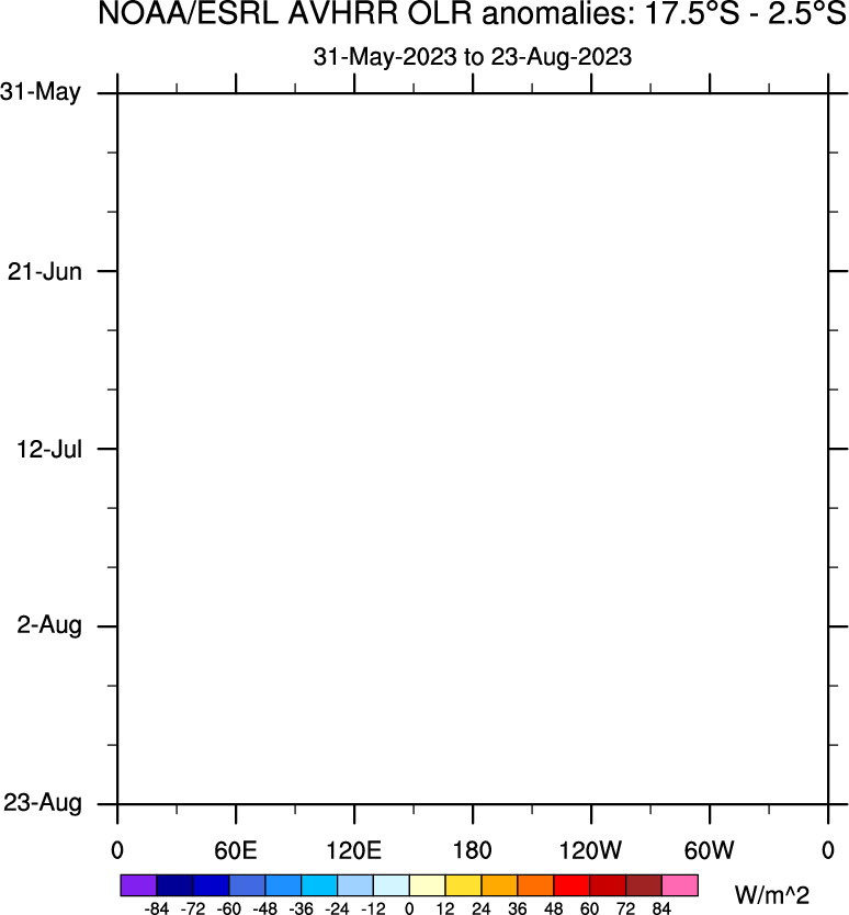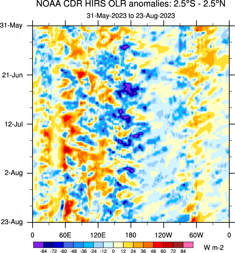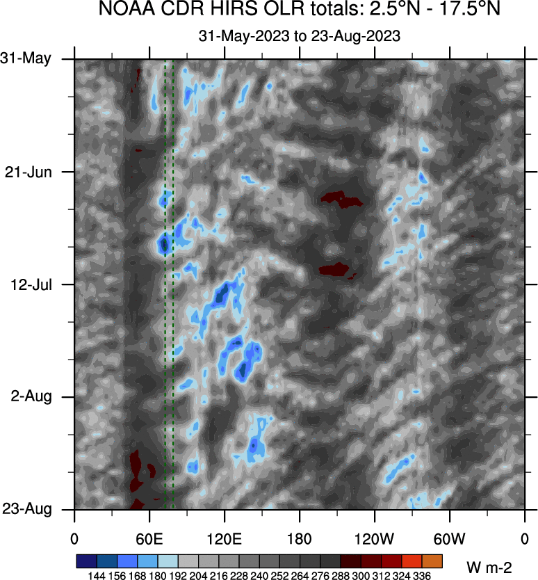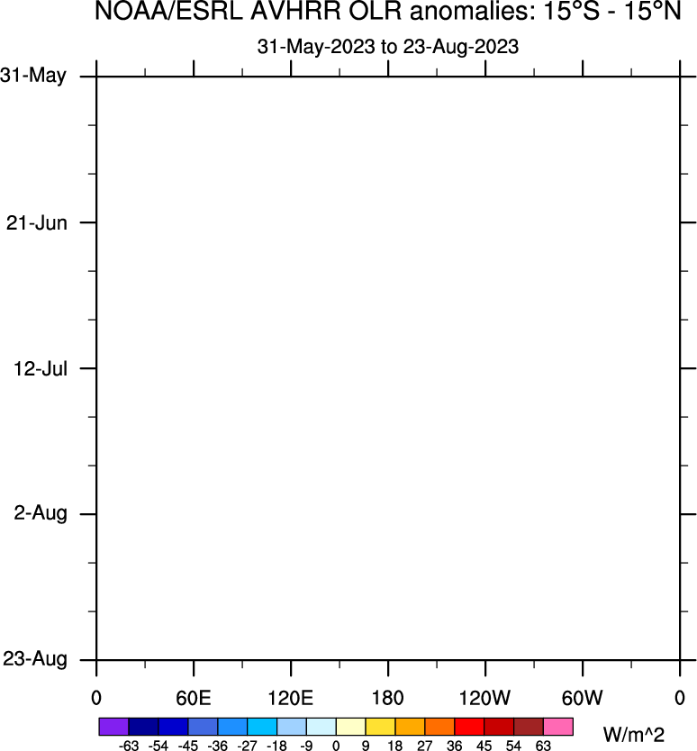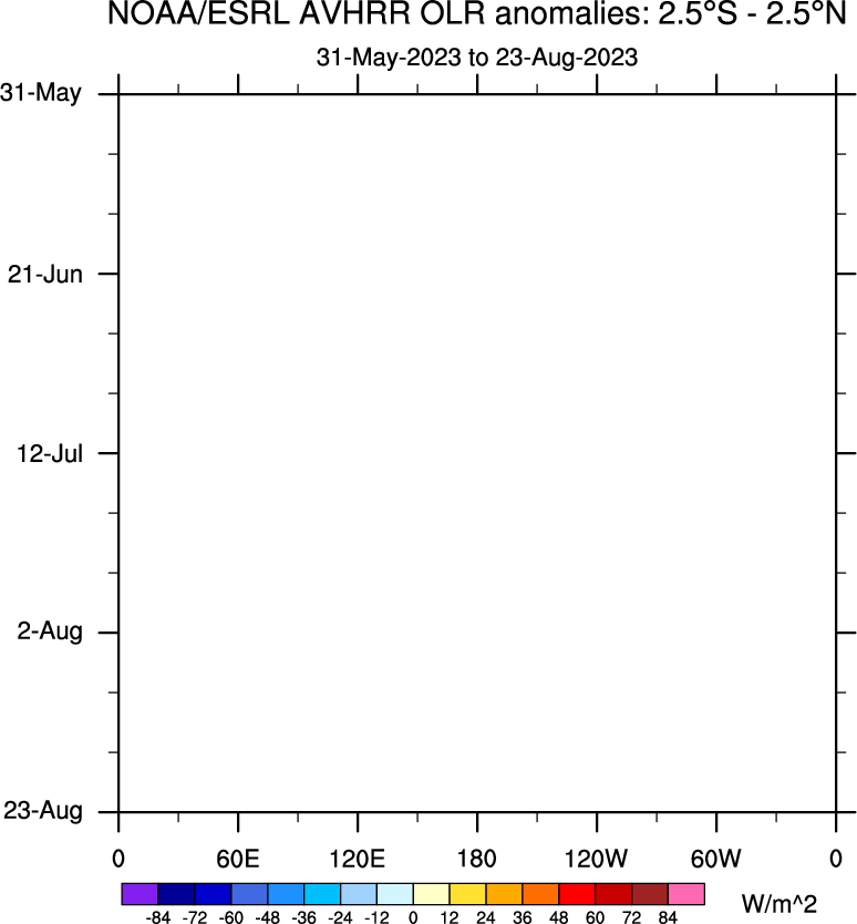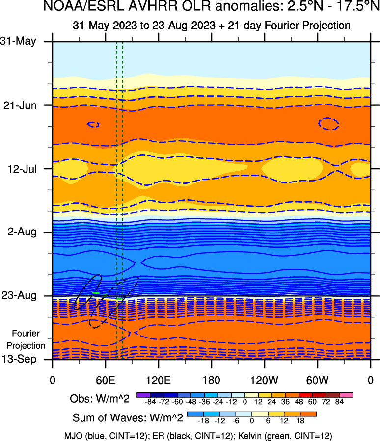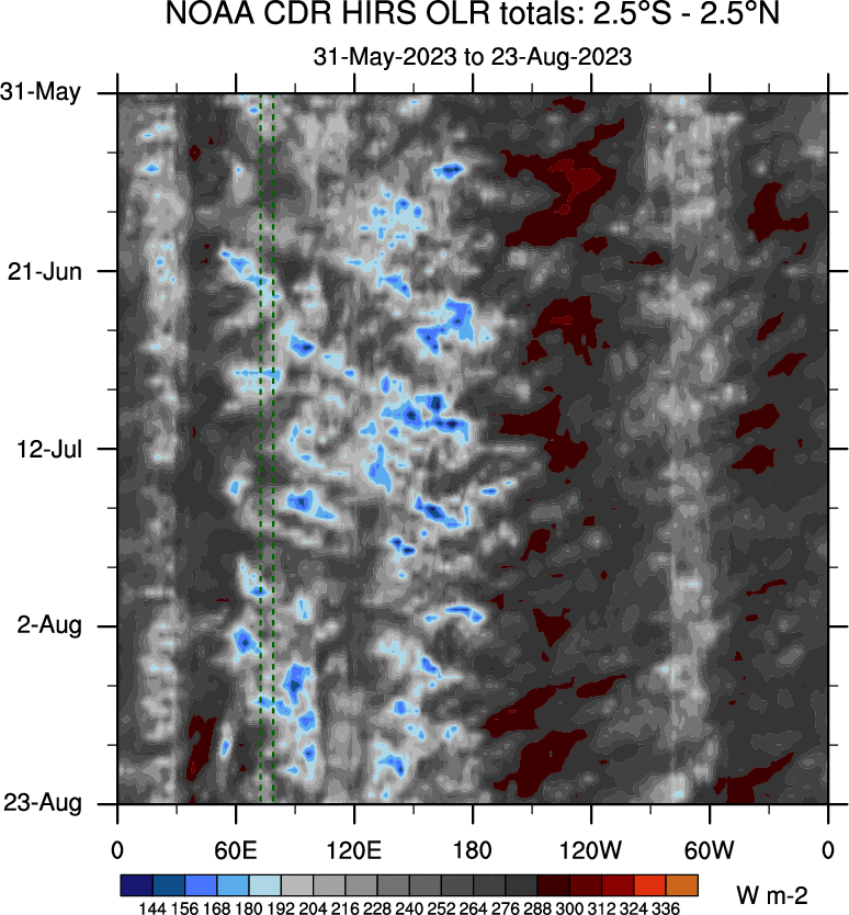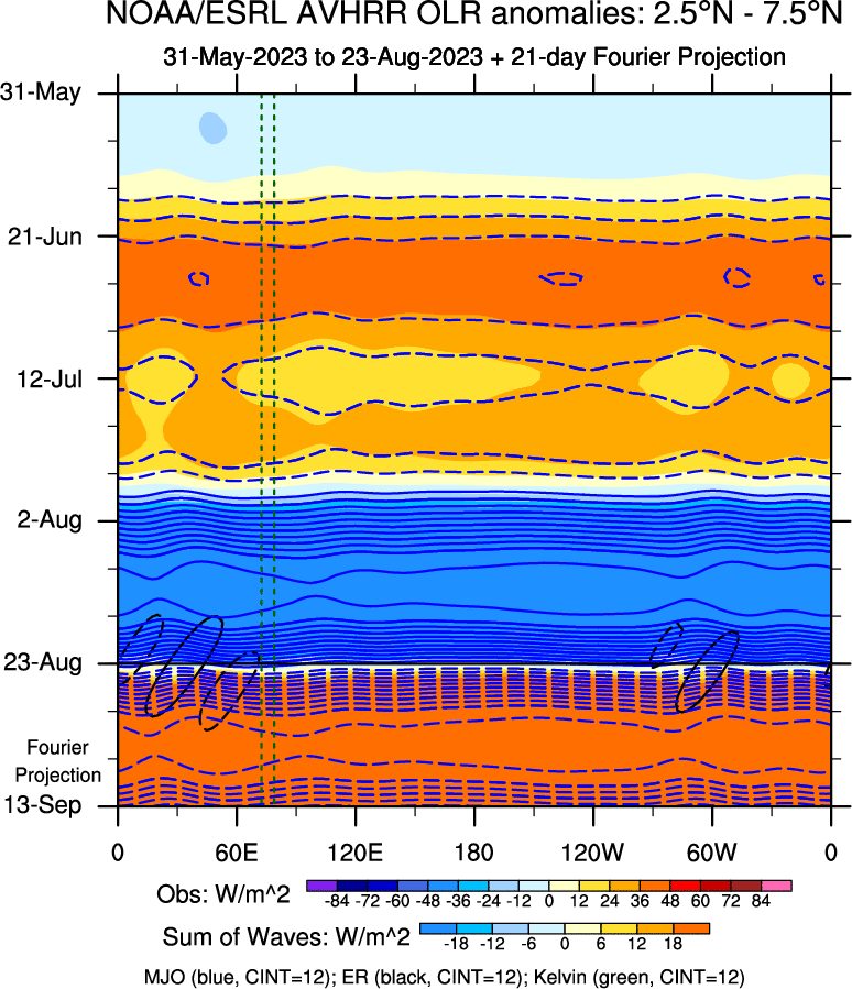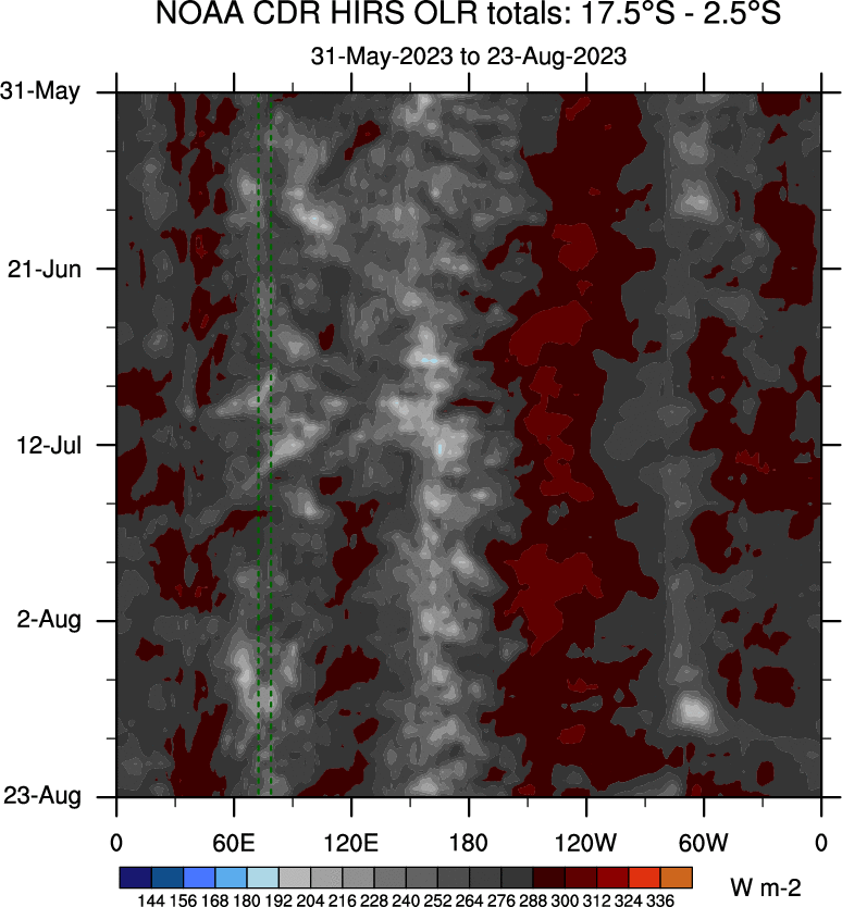 To identify tropical waves in near real-time, the OLR and UTWV data are filtered following Wheeler & Weickmann (2001 MWR). The daily anomalies are calculated using the first 3 harmonics of the seasonal cycle for 1979–2009. Missing values are then filled using linear interpolation in space and time. The most recent 365 days of anomalies are padded with 659 days of zeroes, and the result is filtered for each wave type.