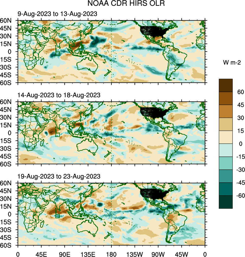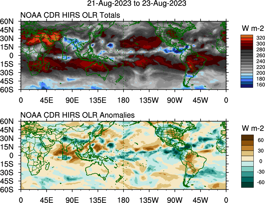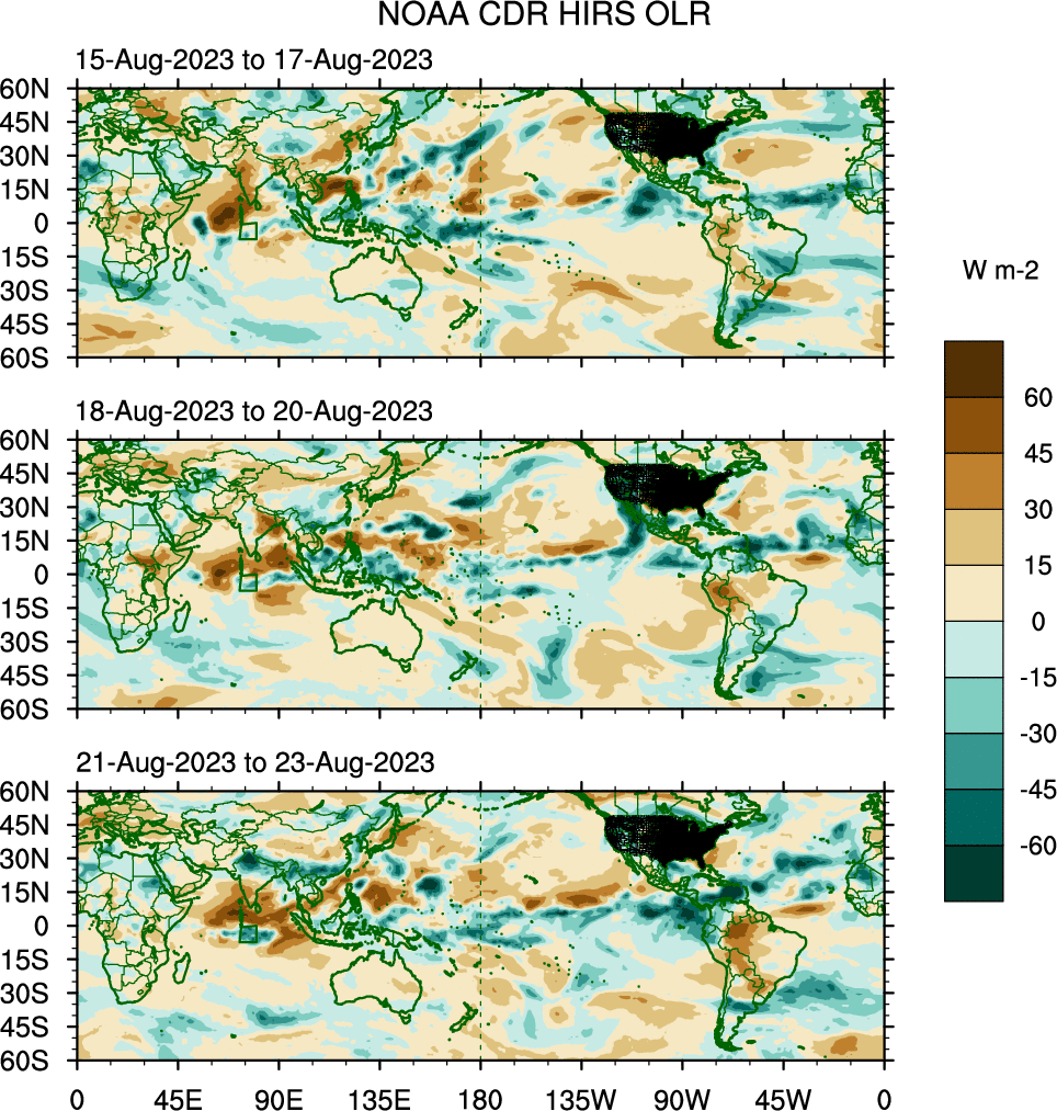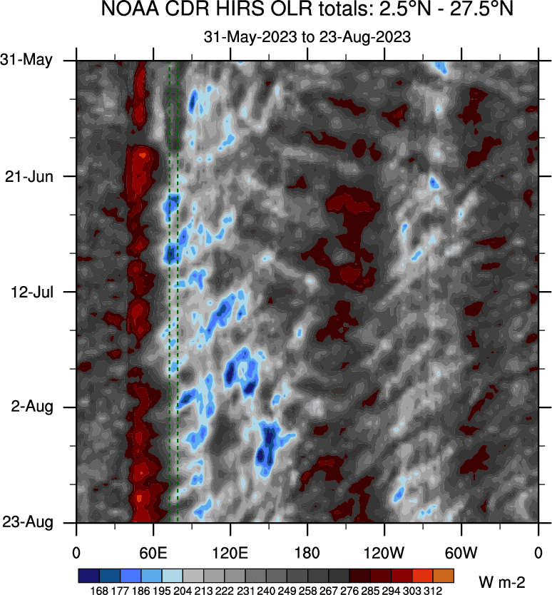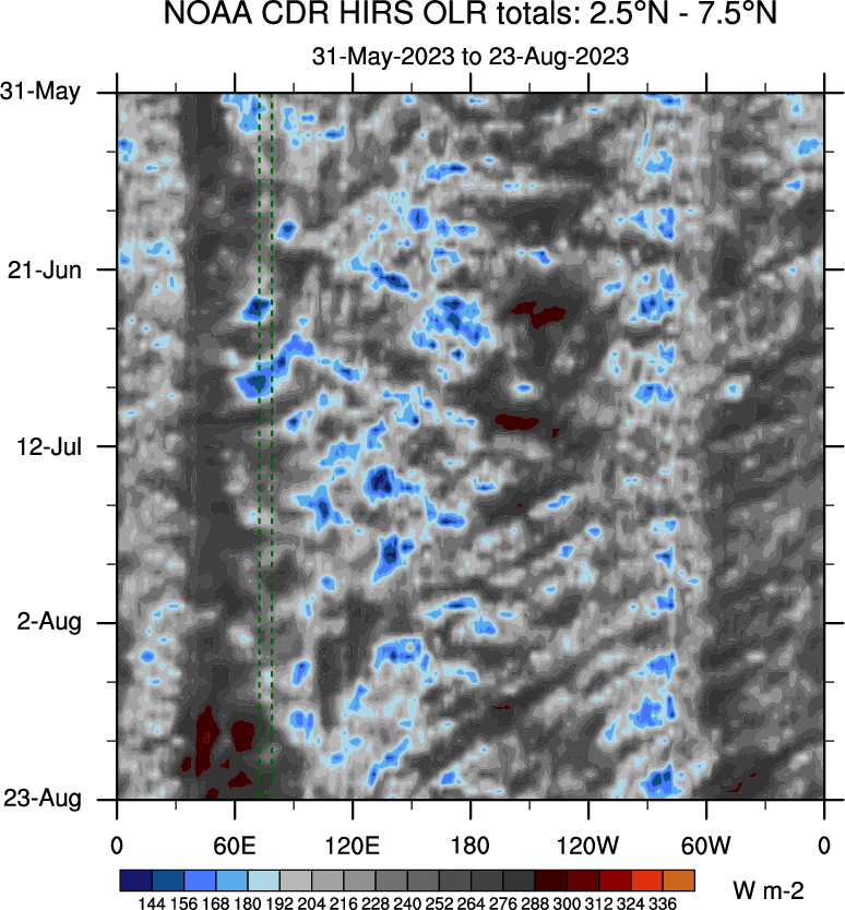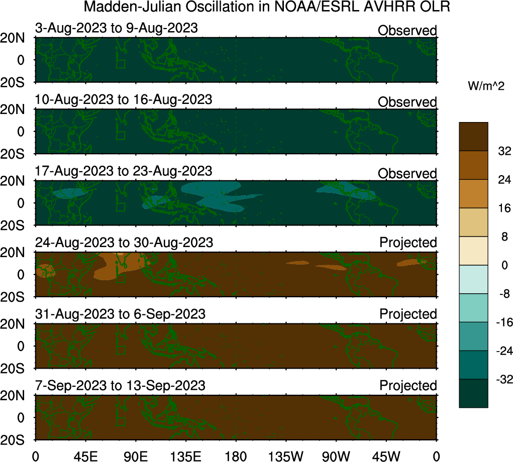 To identify tropical waves in near real-time, the OLR and UTWV data are filtered following Wheeler & Weickmann (2001 MWR). The daily anomalies are calculated using the first 3 harmonics of the seasonal cycle for 1979–2009. Missing values are then filled using linear interpolation in space and time. The most recent 365 days of anomalies are padded with 659 days of zeroes, and the result is filtered for each wave type.