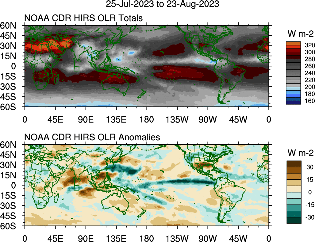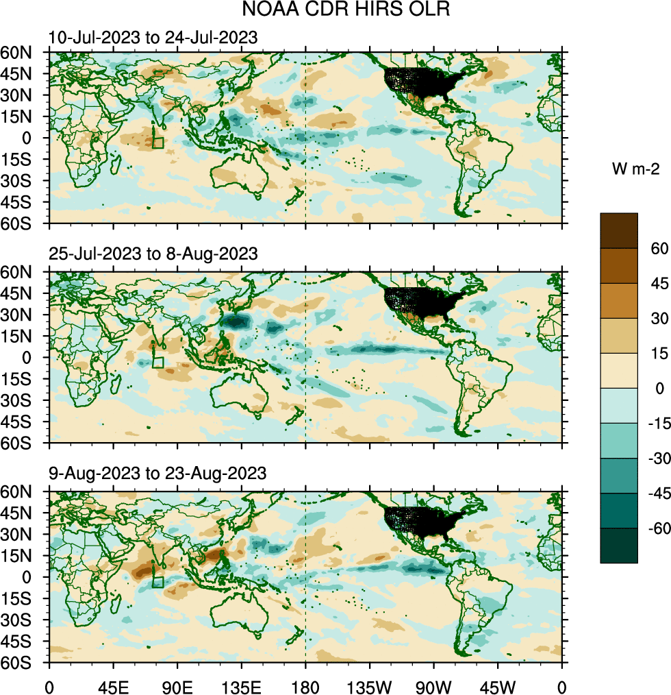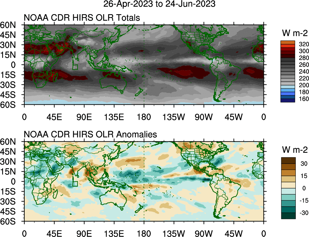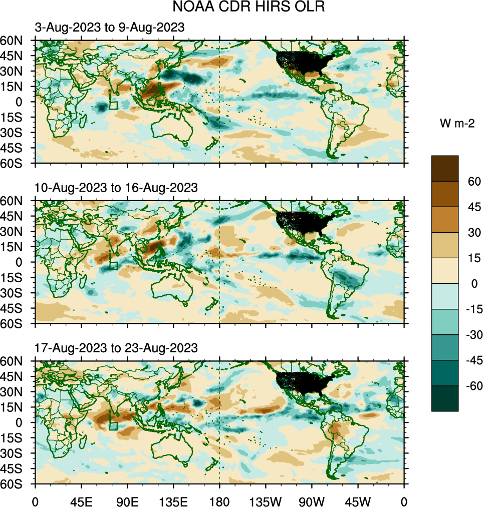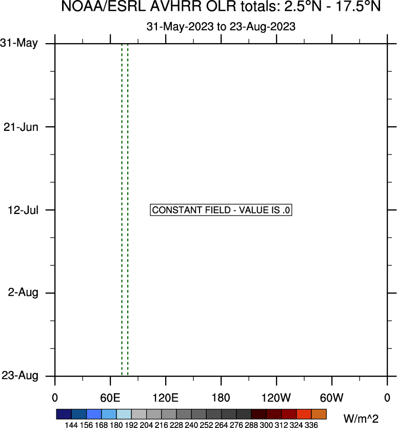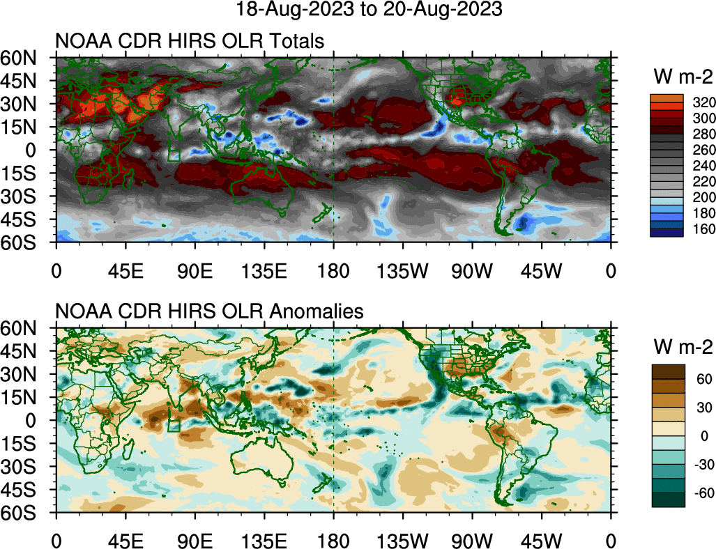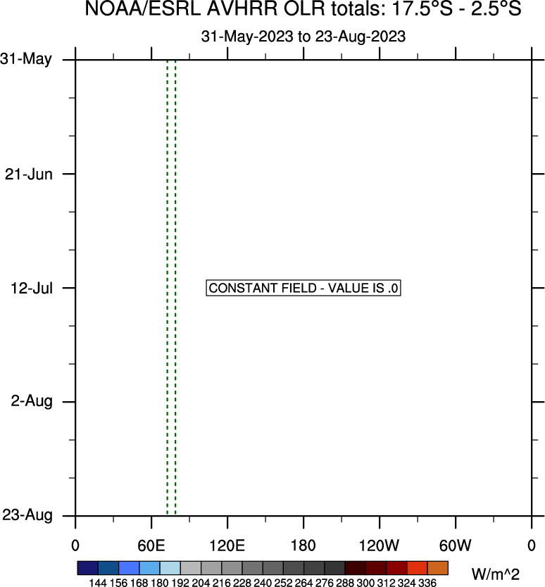To identify tropical waves in near real-time, the OLR and UTWV data are filtered following Wheeler & Weickmann (2001 MWR). The daily anomalies are calculated using the first 3 harmonics of the seasonal cycle for 1979–2009. Missing values are then filled using linear interpolation in space and time. The most recent 365 days of anomalies are padded with 659 days of zeroes, and the result is filtered for each wave type.
