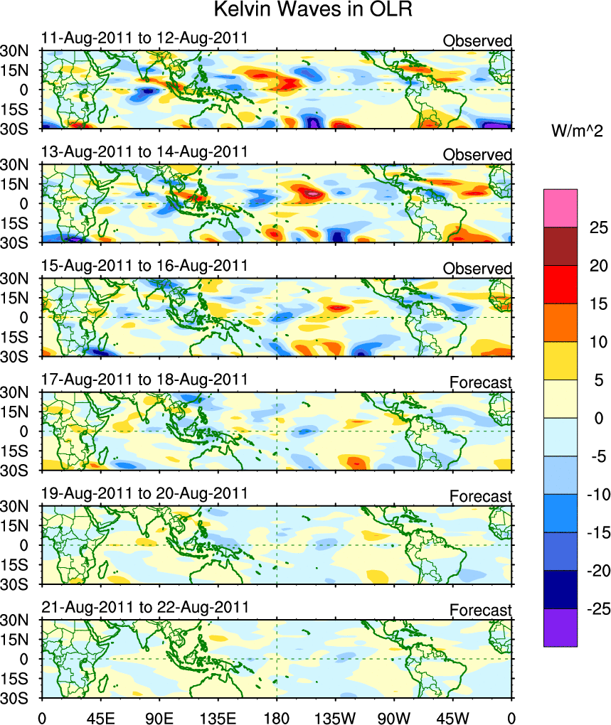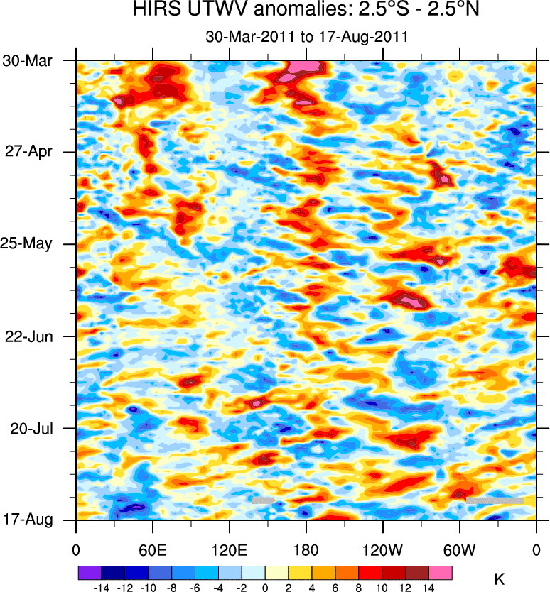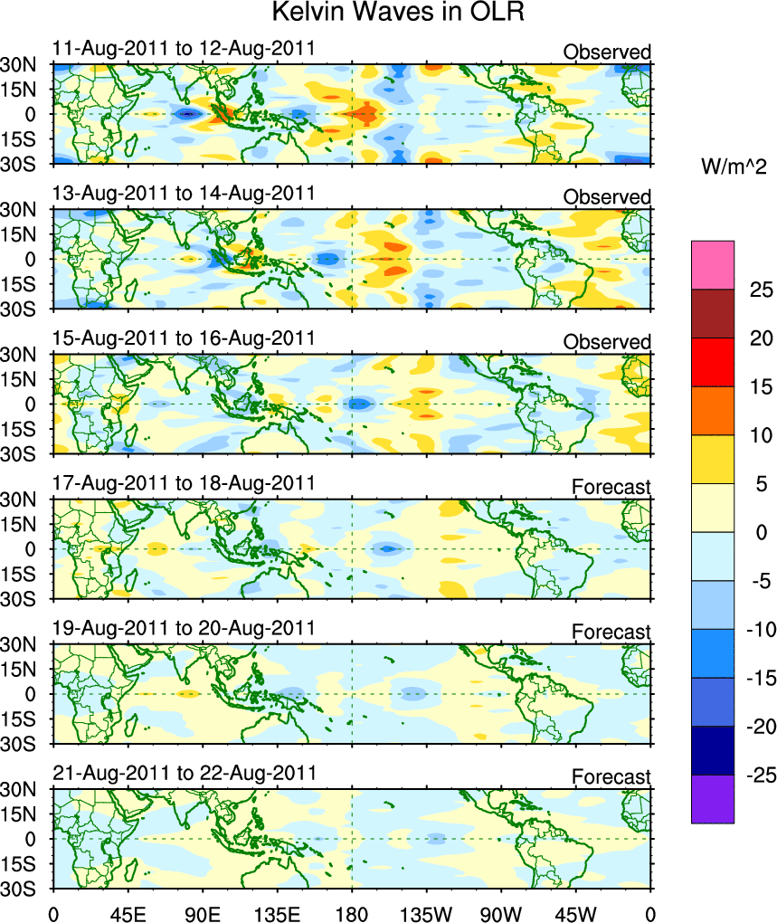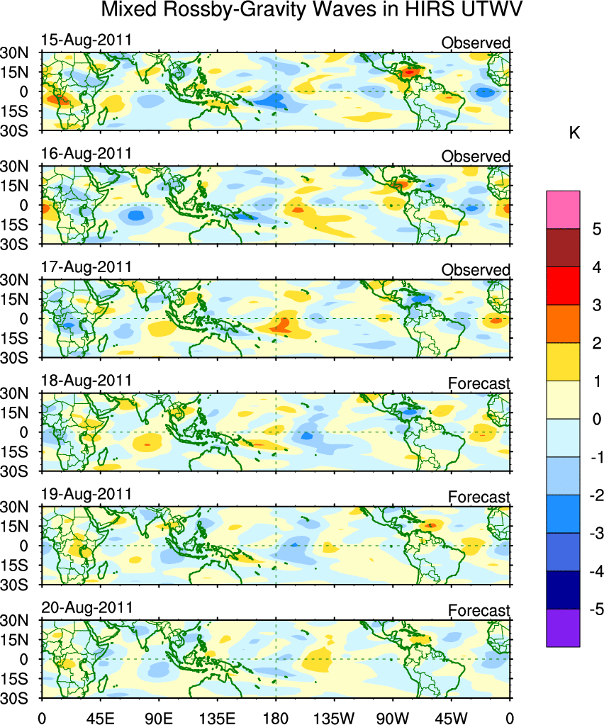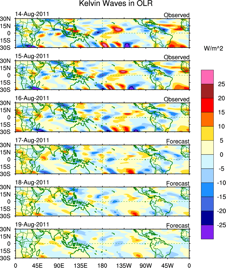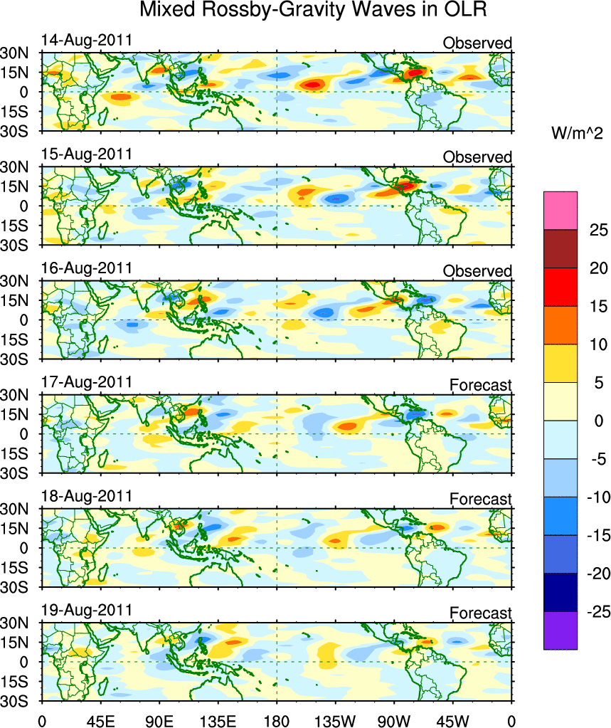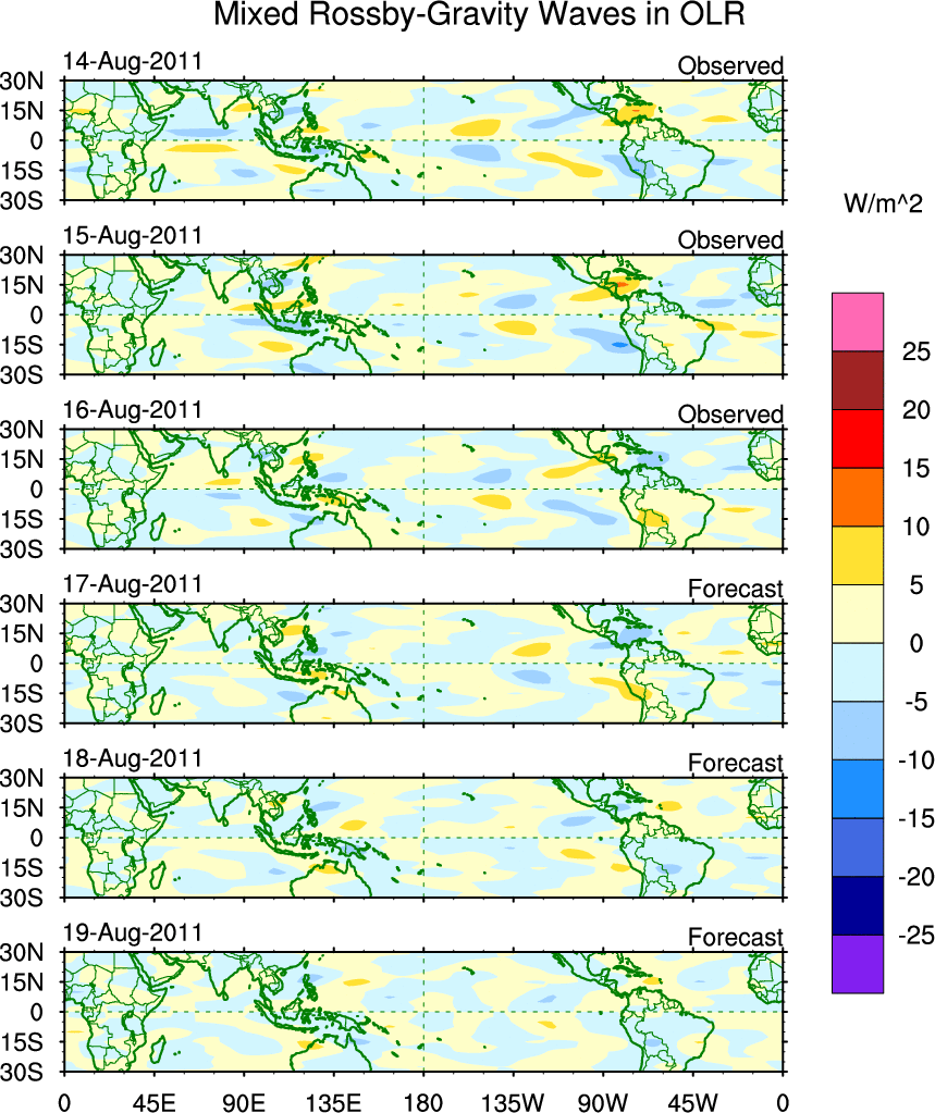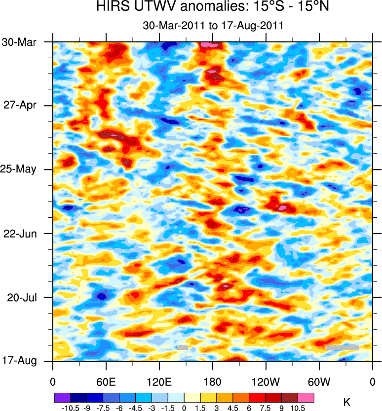 To identify tropical waves in near real-time, the OLR and UTWV data are filtered following Wheeler & Weickmann (2001 MWR). The daily anomalies are calculated using the first 3 harmonics of the seasonal cycle for 1979–2009. Missing values are then filled using linear interpolation in space and time. The most recent 365 days of anomalies are padded with 659 days of zeroes, and the result is filtered for each wave type.