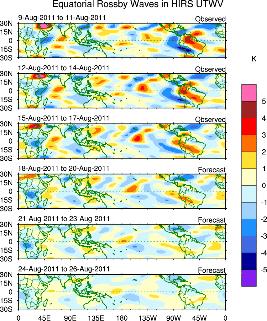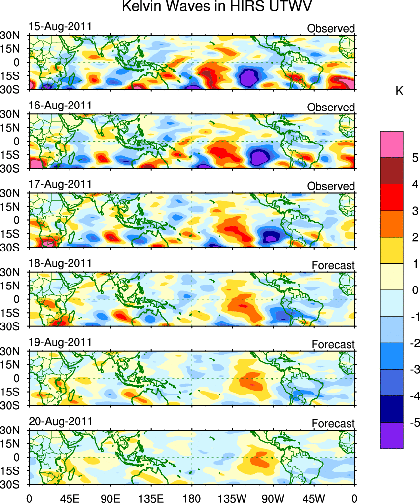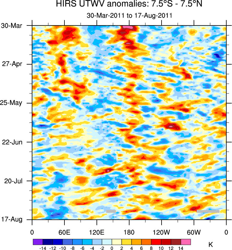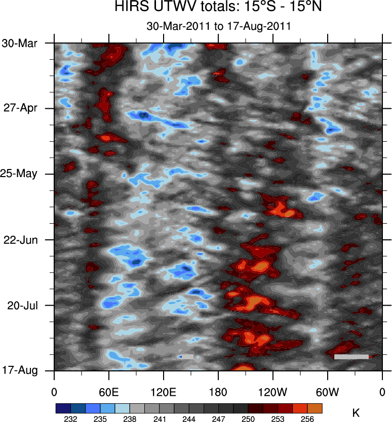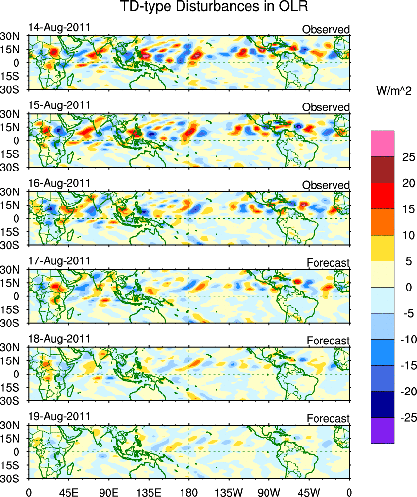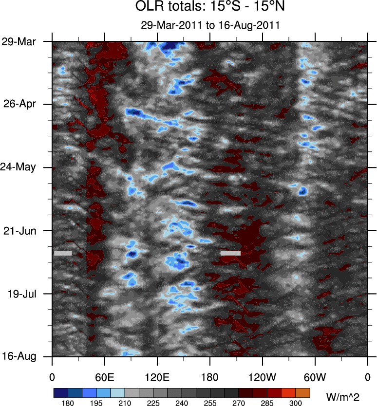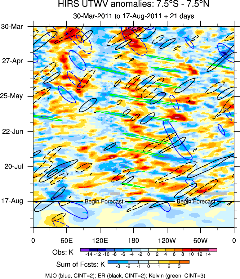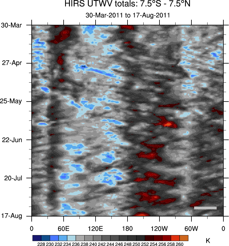 To identify tropical waves in near real-time, the OLR and UTWV data are filtered following Wheeler & Weickmann (2001 MWR). The daily anomalies are calculated using the first 3 harmonics of the seasonal cycle for 1979–2009. Missing values are then filled using linear interpolation in space and time. The most recent 365 days of anomalies are padded with 659 days of zeroes, and the result is filtered for each wave type.