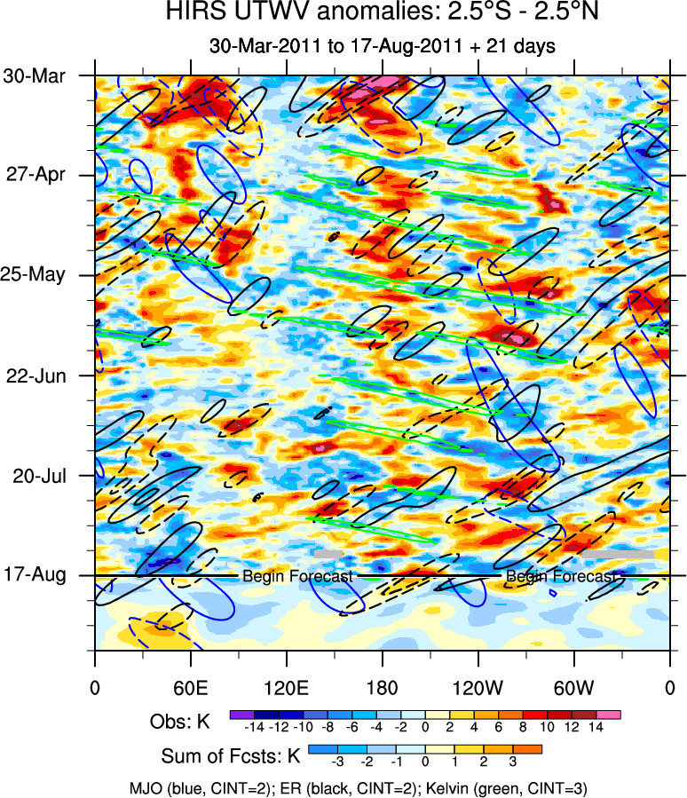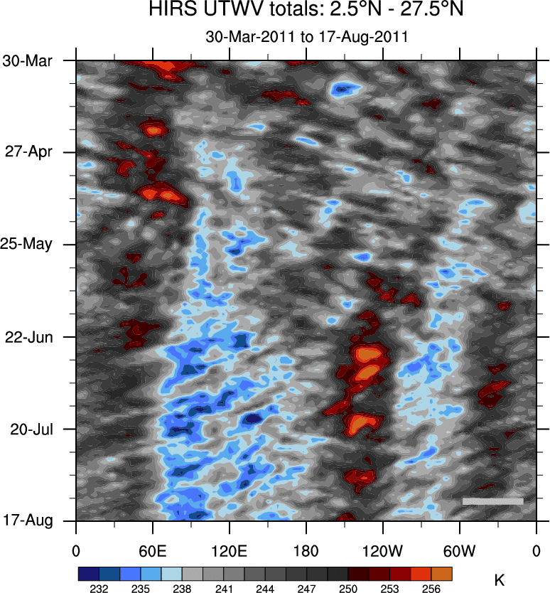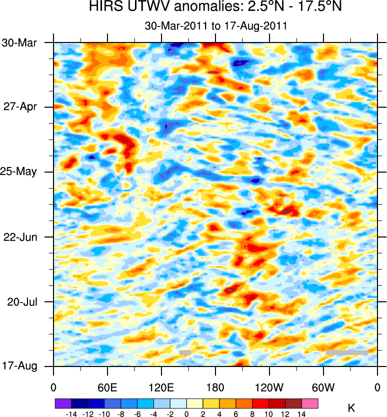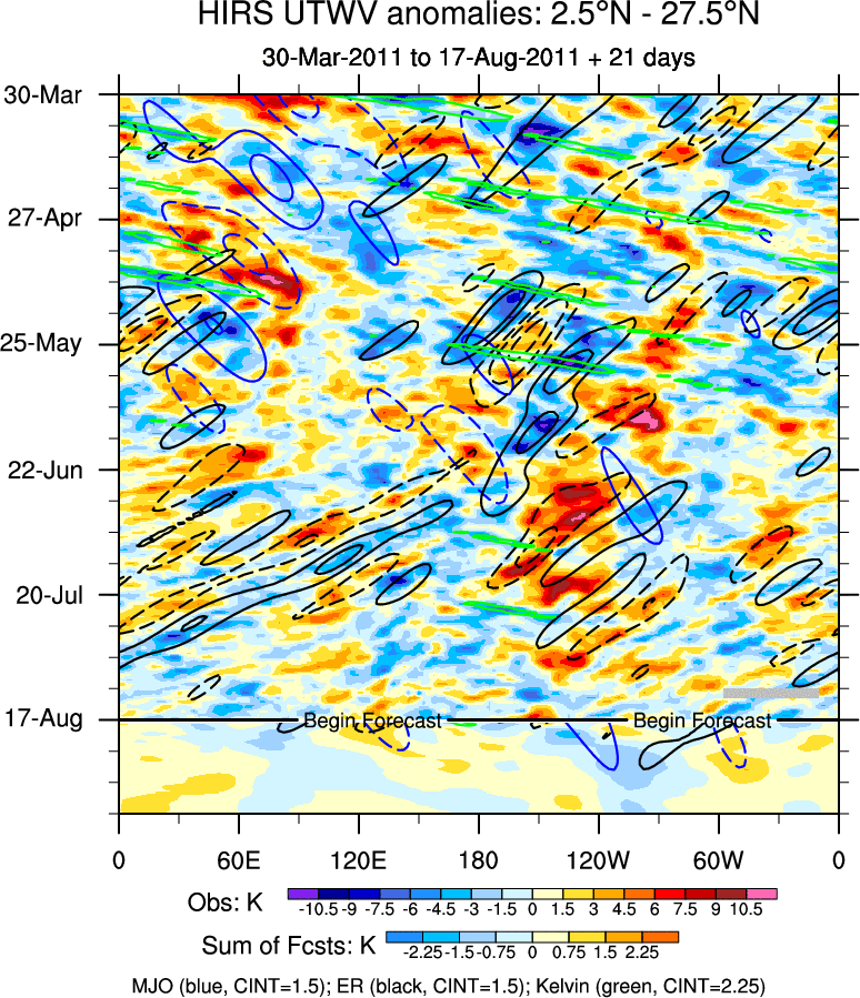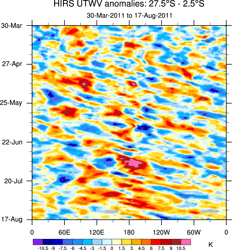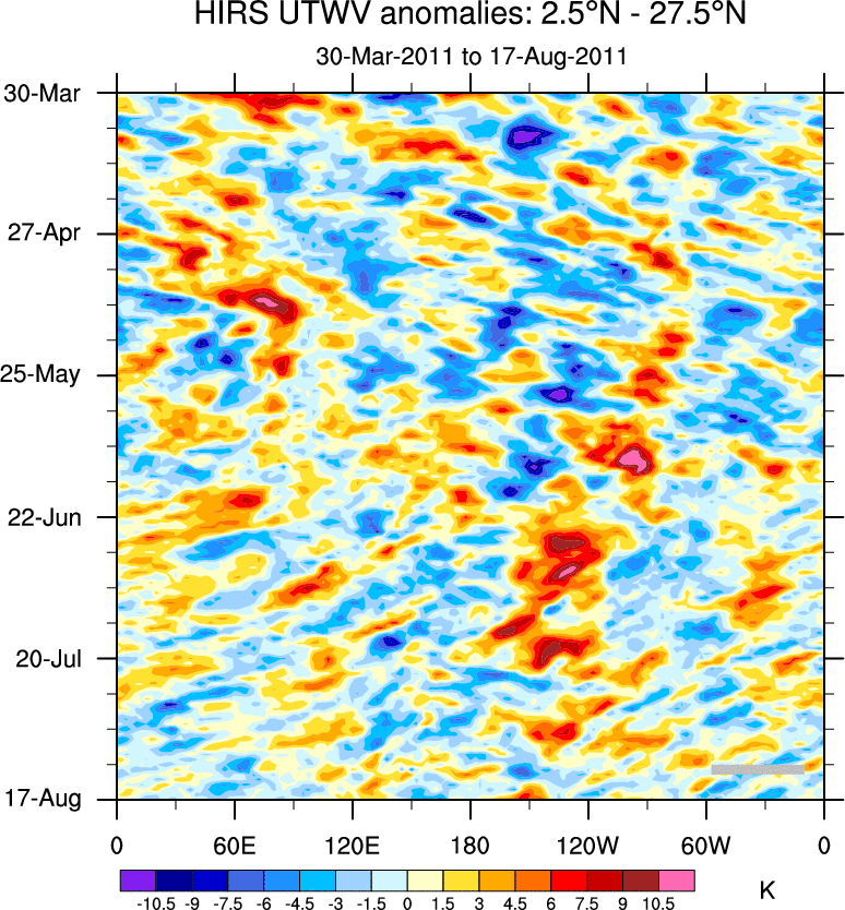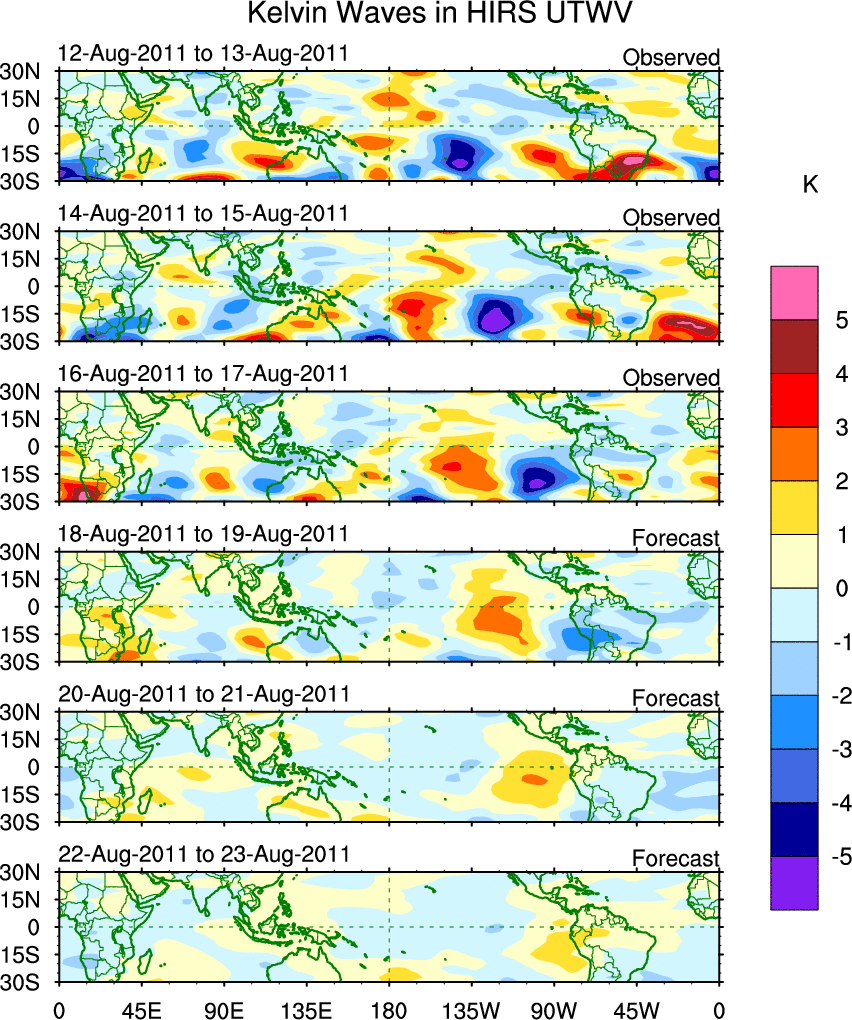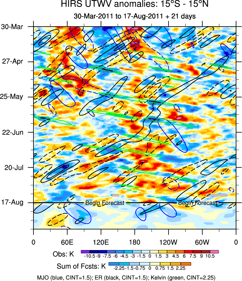 To identify tropical waves in near real-time, the OLR and UTWV data are filtered following Wheeler & Weickmann (2001 MWR). The daily anomalies are calculated using the first 3 harmonics of the seasonal cycle for 1979–2009. Missing values are then filled using linear interpolation in space and time. The most recent 365 days of anomalies are padded with 659 days of zeroes, and the result is filtered for each wave type.