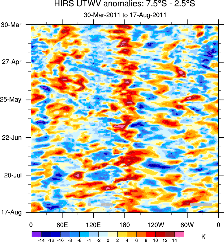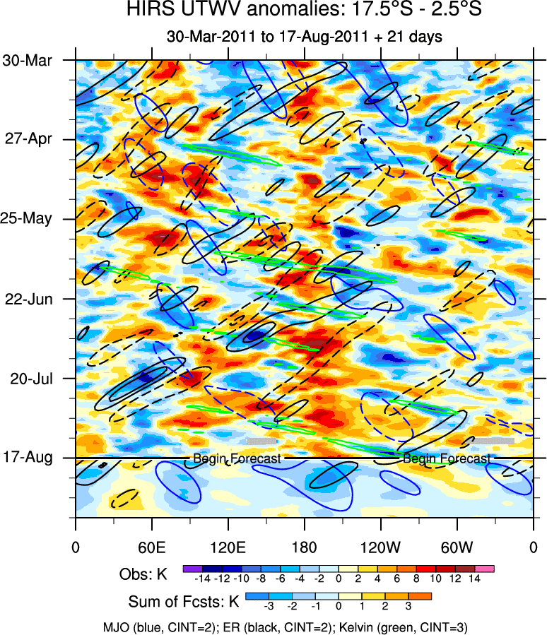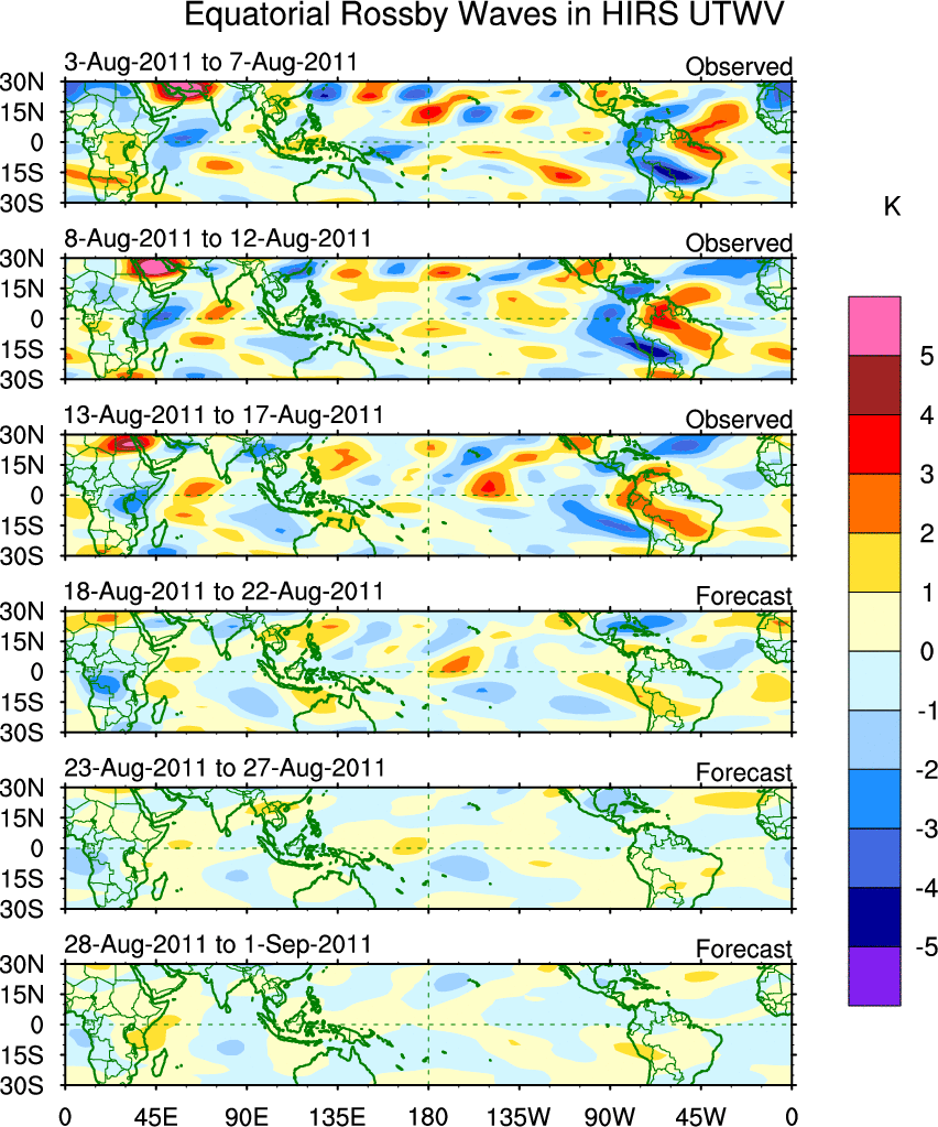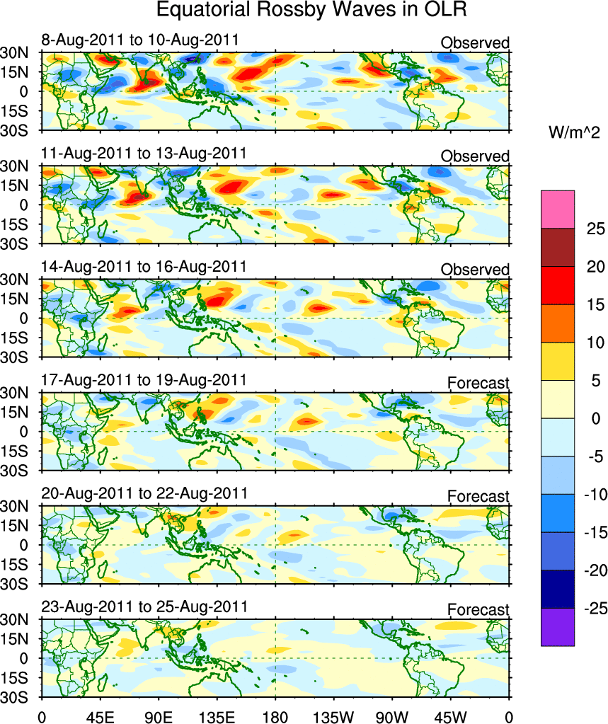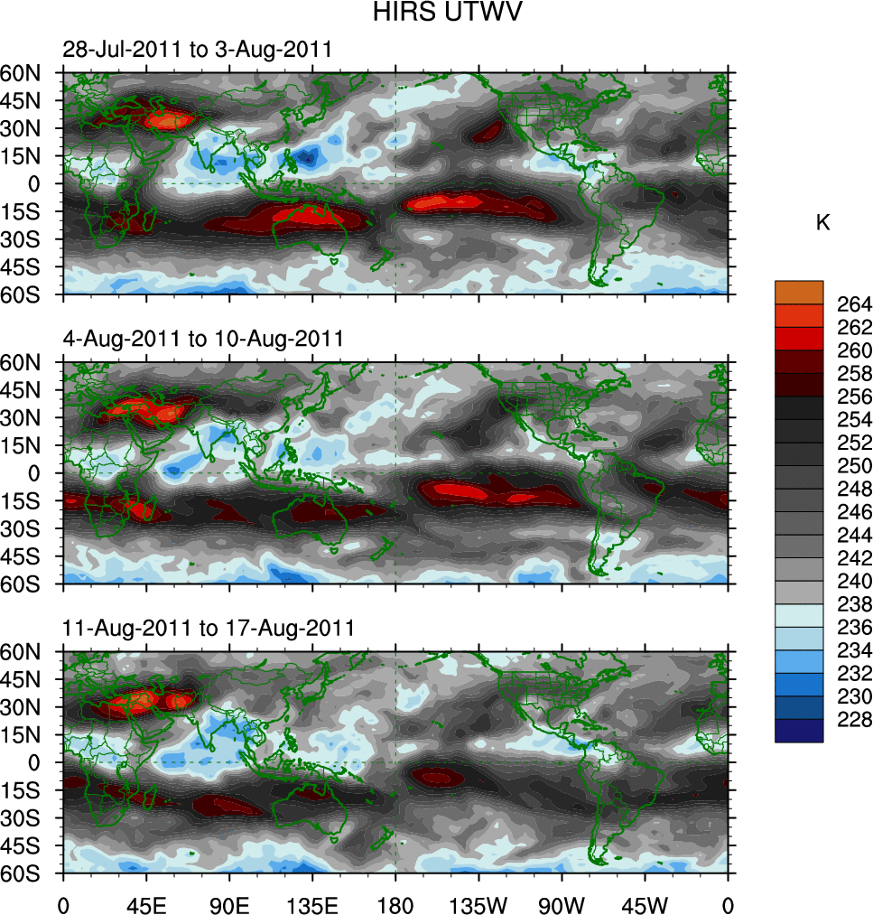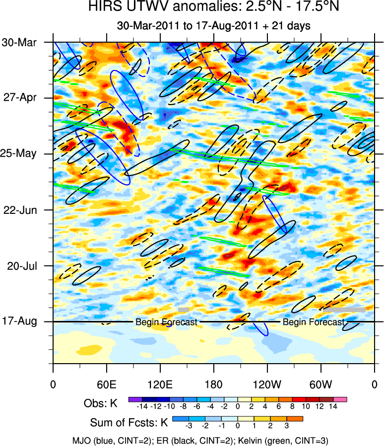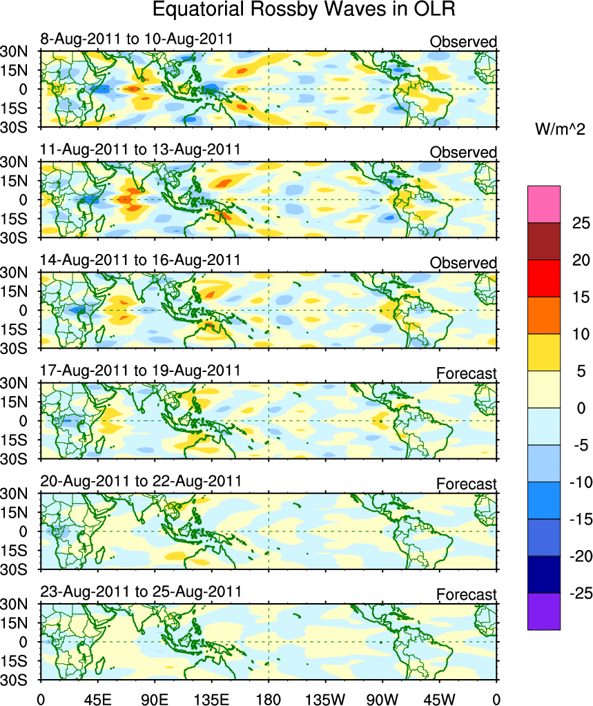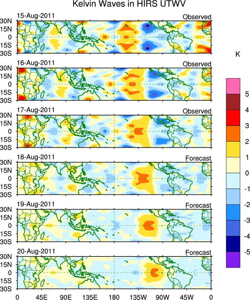 To identify tropical waves in near real-time, the OLR and UTWV data are filtered following Wheeler & Weickmann (2001 MWR). The daily anomalies are calculated using the first 3 harmonics of the seasonal cycle for 1979–2009. Missing values are then filled using linear interpolation in space and time. The most recent 365 days of anomalies are padded with 659 days of zeroes, and the result is filtered for each wave type.