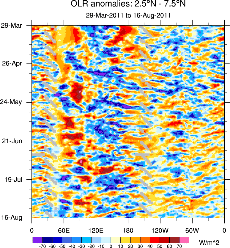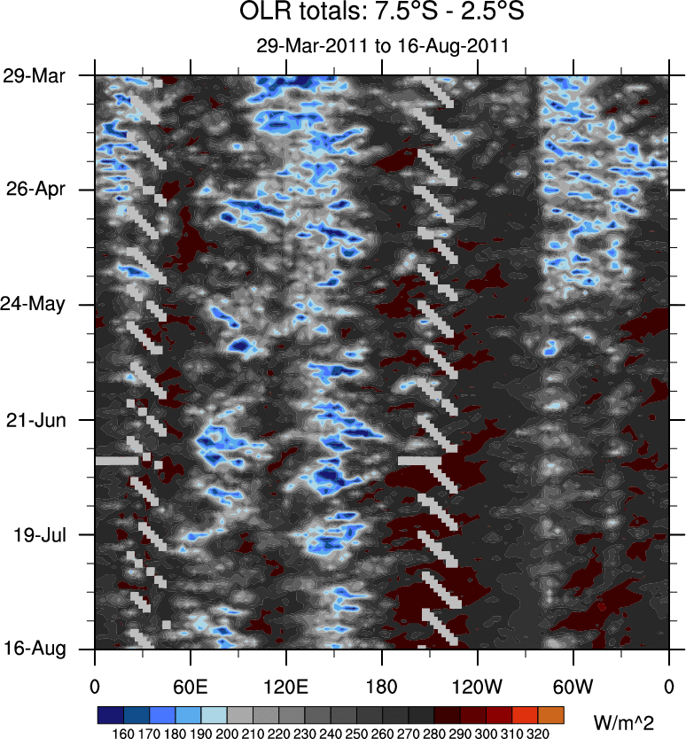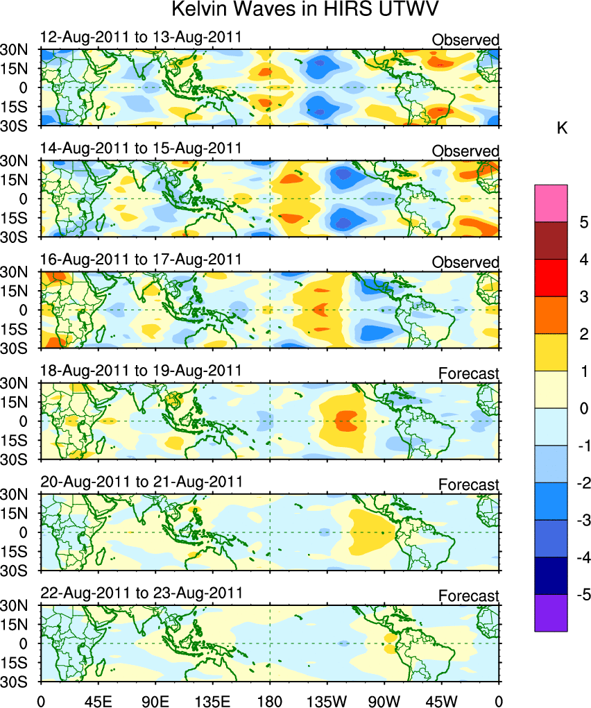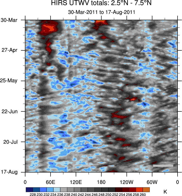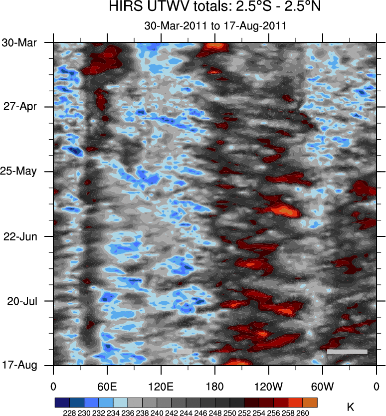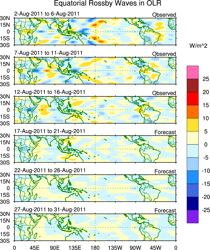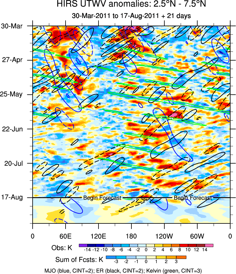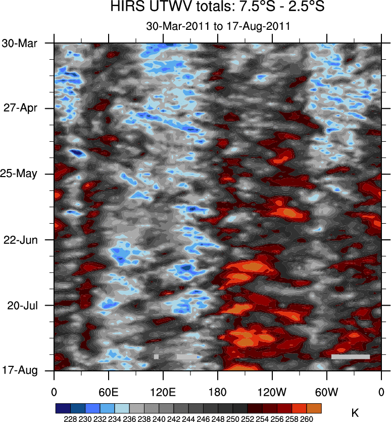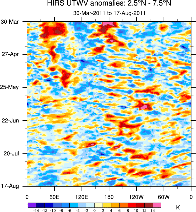 To identify tropical waves in near real-time, the OLR and UTWV data are filtered following Wheeler & Weickmann (2001 MWR). The daily anomalies are calculated using the first 3 harmonics of the seasonal cycle for 1979–2009. Missing values are then filled using linear interpolation in space and time. The most recent 365 days of anomalies are padded with 659 days of zeroes, and the result is filtered for each wave type.