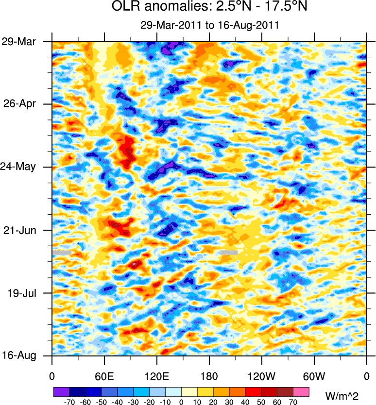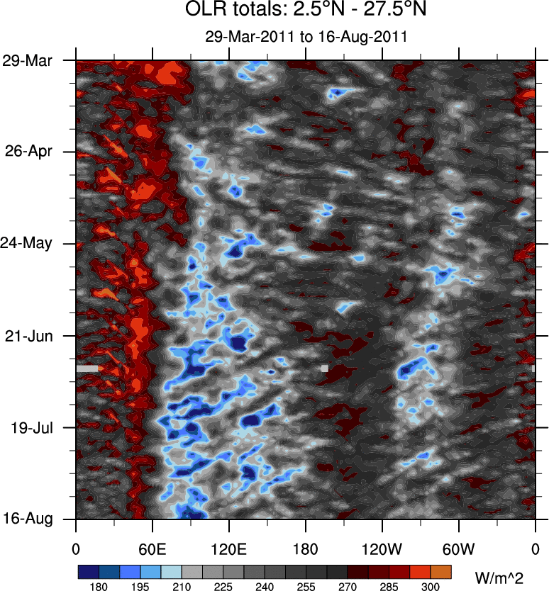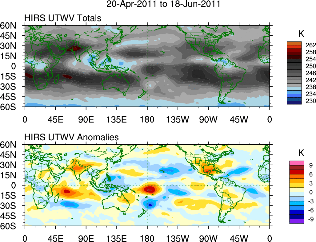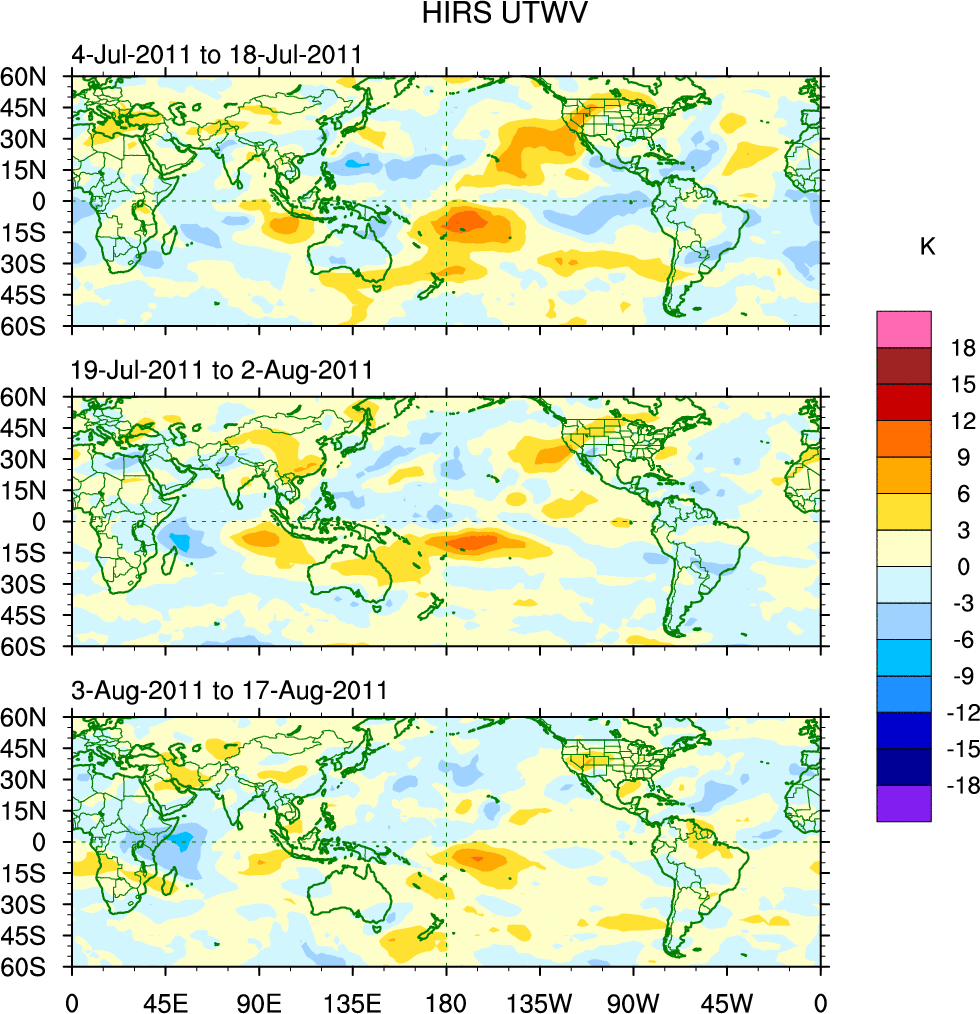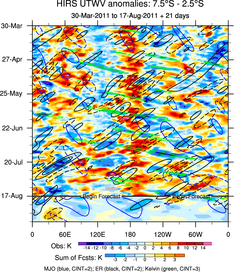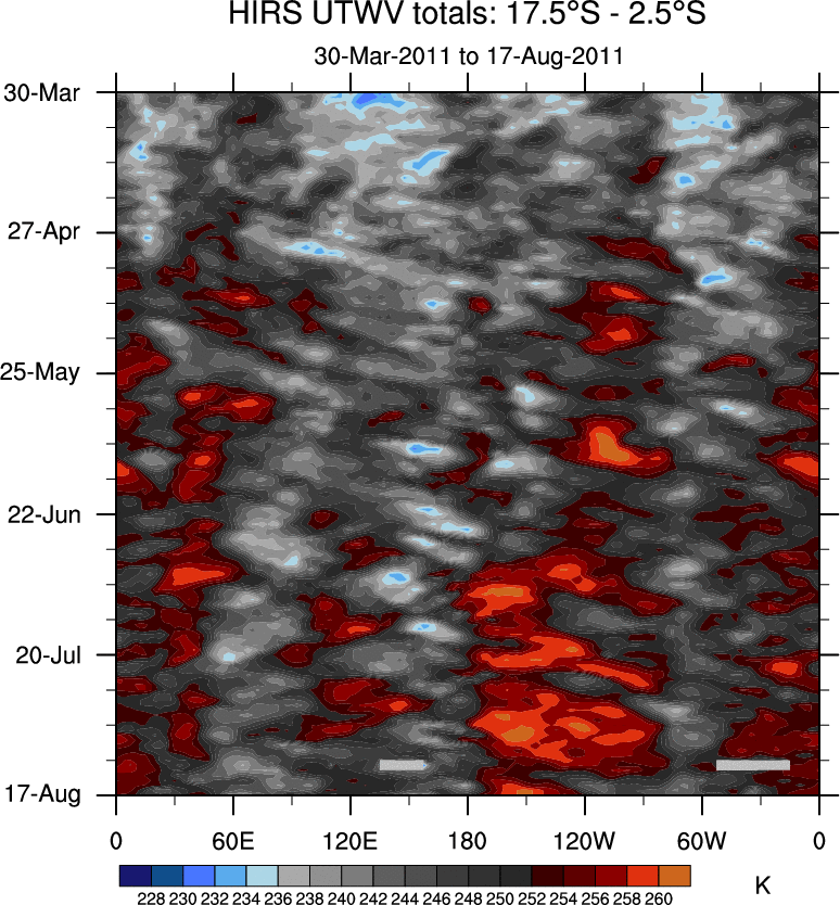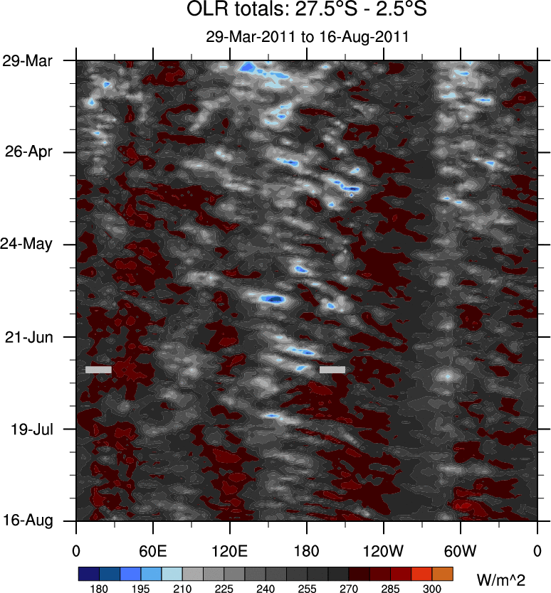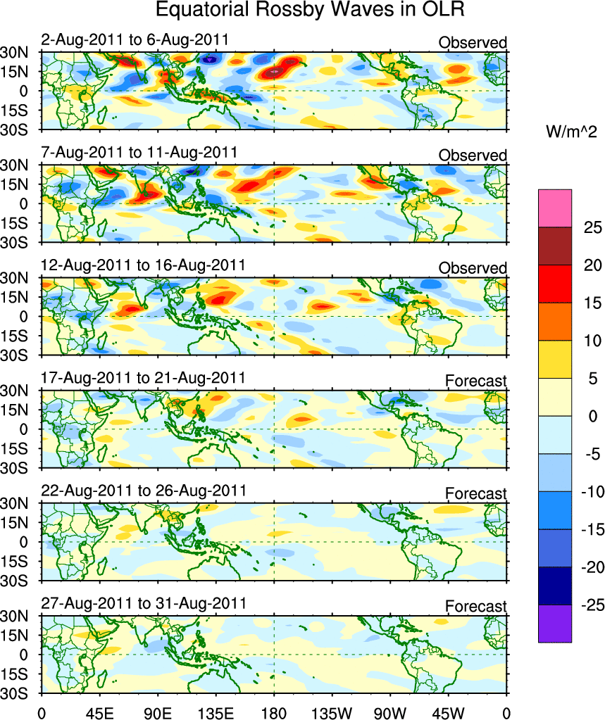 To identify tropical waves in near real-time, the OLR and UTWV data are filtered following Wheeler & Weickmann (2001 MWR). The daily anomalies are calculated using the first 3 harmonics of the seasonal cycle for 1979–2009. Missing values are then filled using linear interpolation in space and time. The most recent 365 days of anomalies are padded with 659 days of zeroes, and the result is filtered for each wave type.