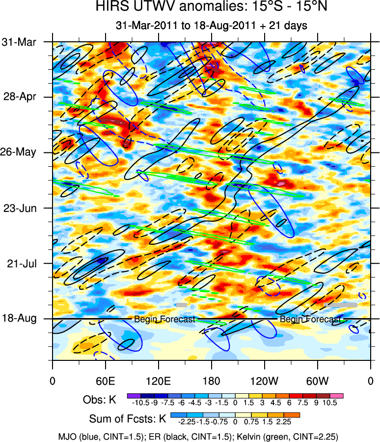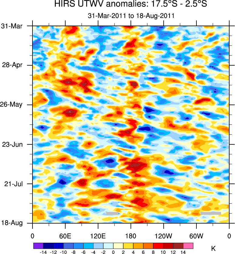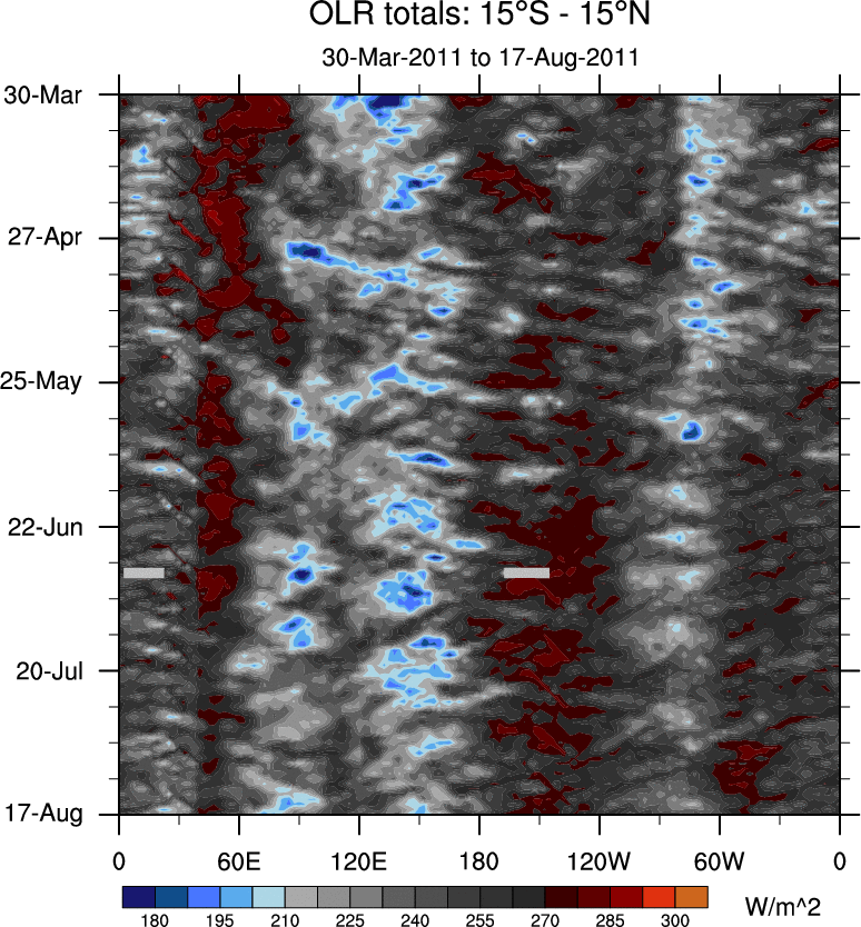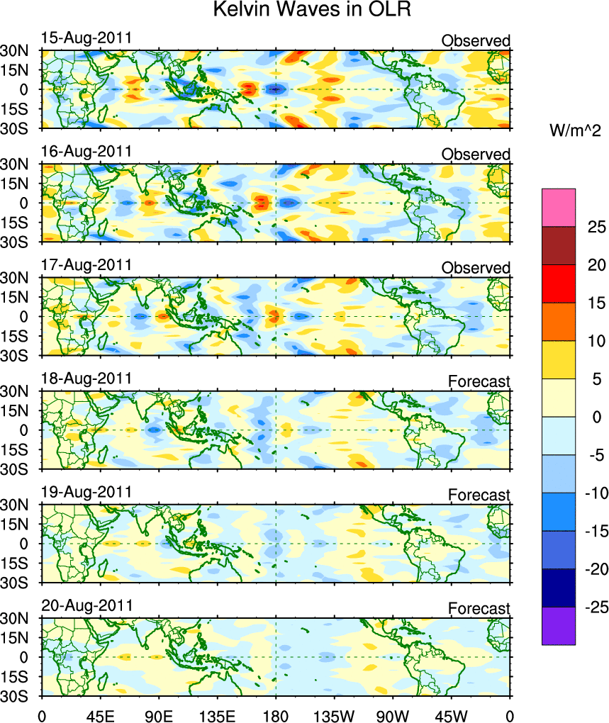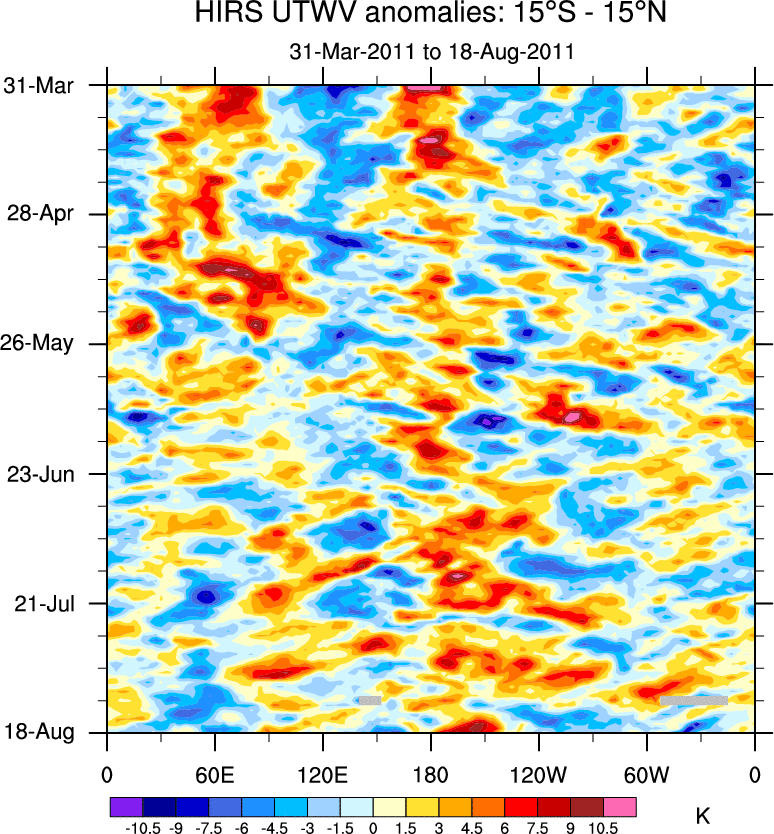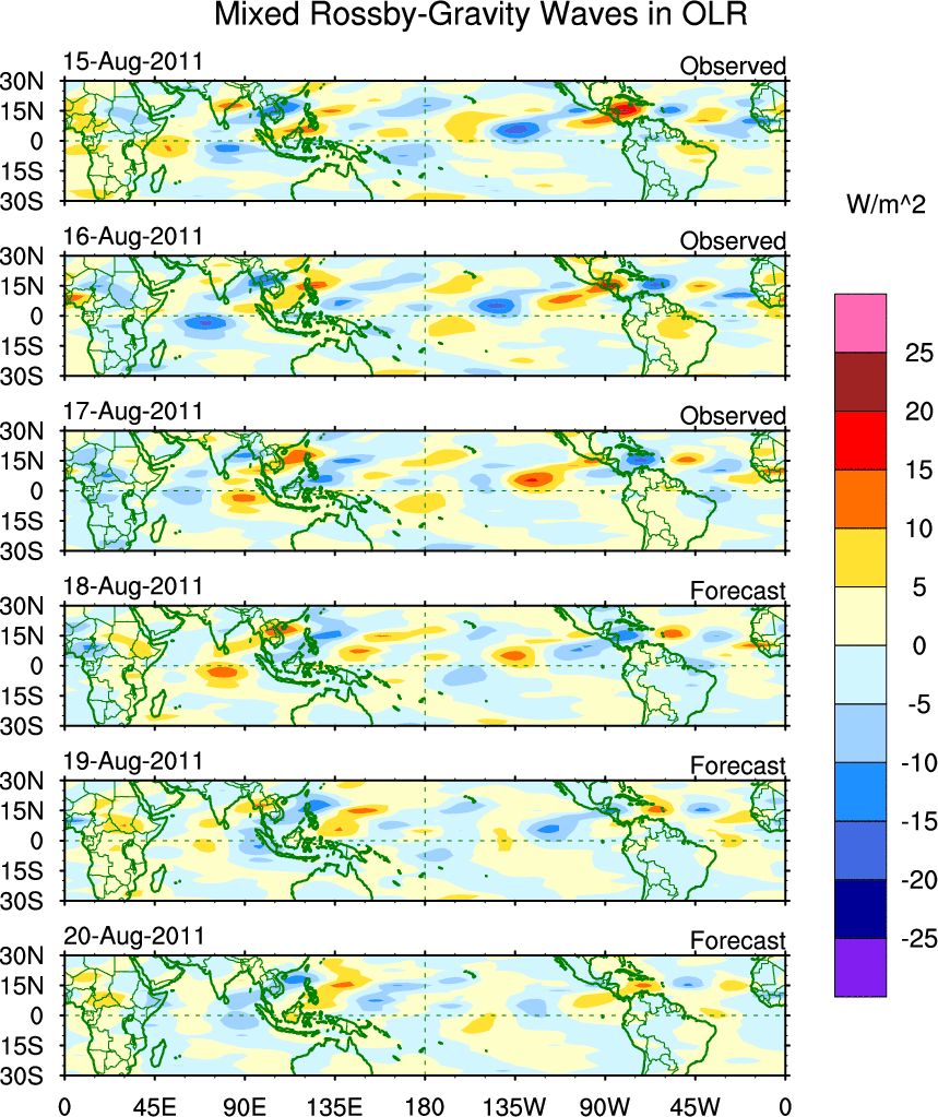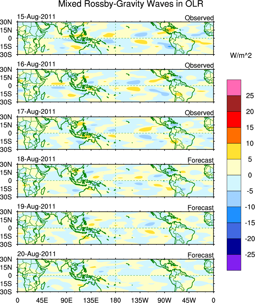 To identify tropical waves in near real-time, the OLR and UTWV data are filtered following Wheeler & Weickmann (2001 MWR). The daily anomalies are calculated using the first 3 harmonics of the seasonal cycle for 1979–2009. Missing values are then filled using linear interpolation in space and time. The most recent 365 days of anomalies are padded with 659 days of zeroes, and the result is filtered for each wave type.