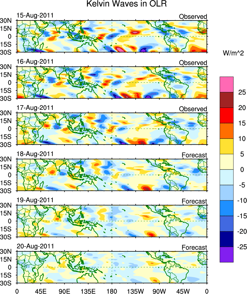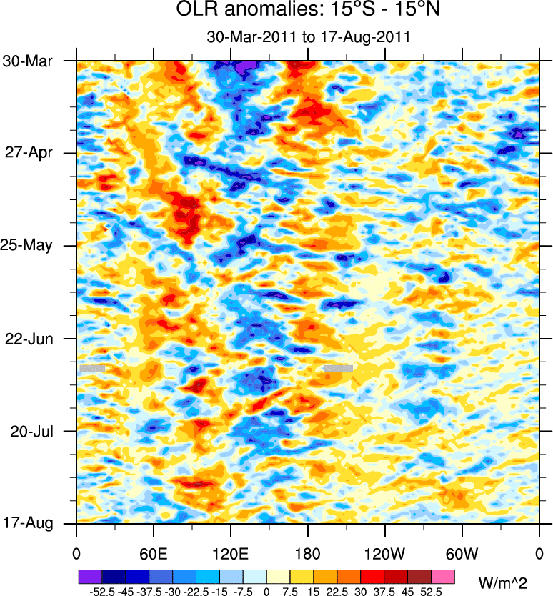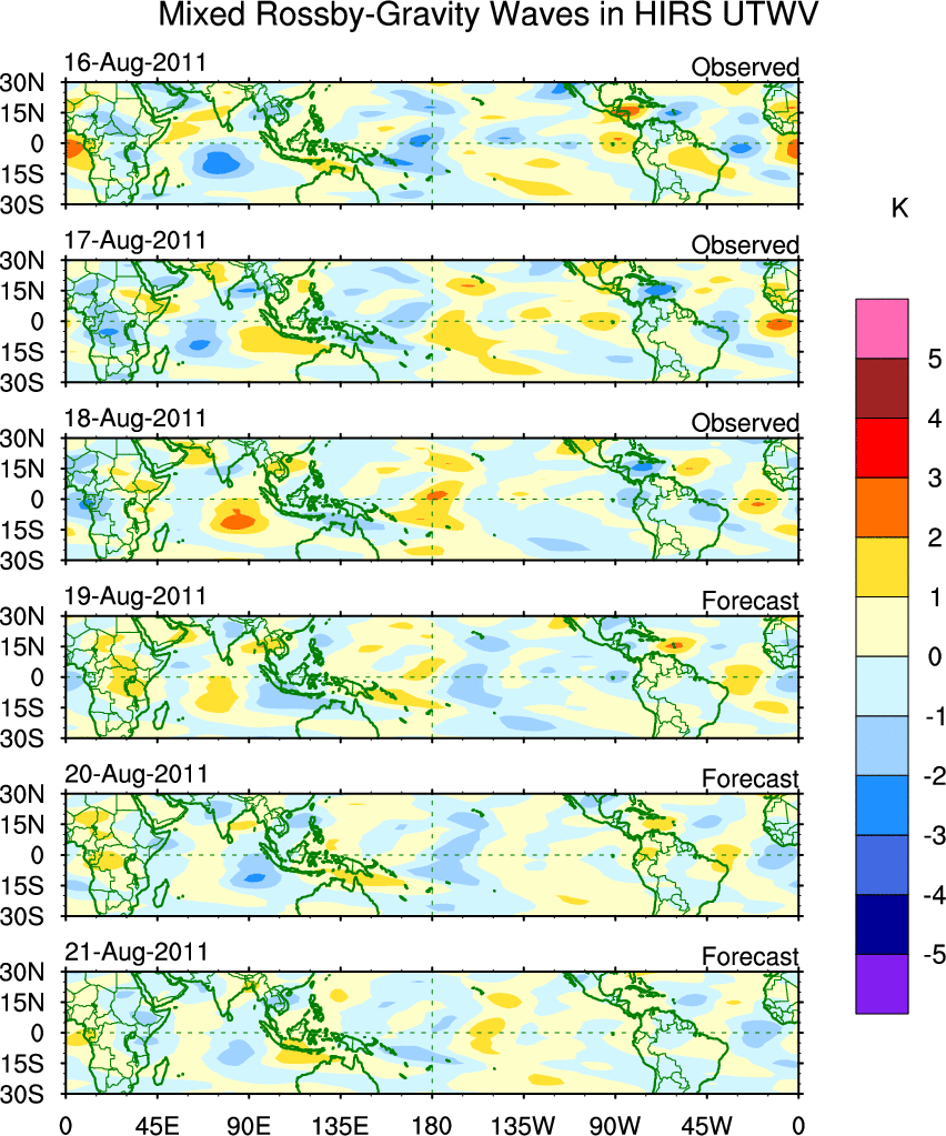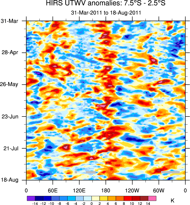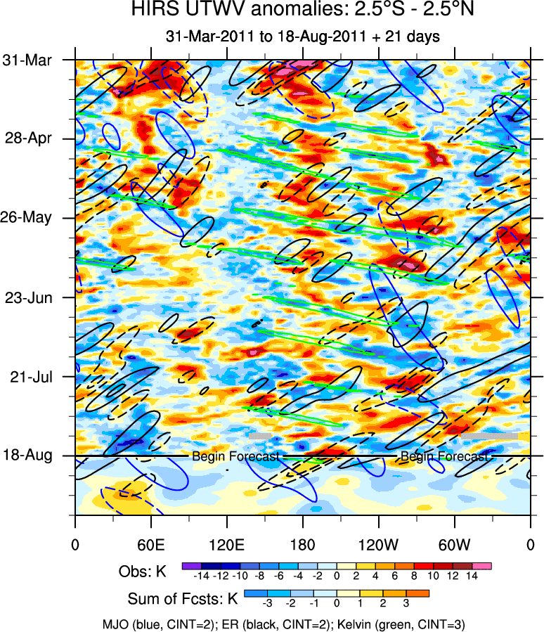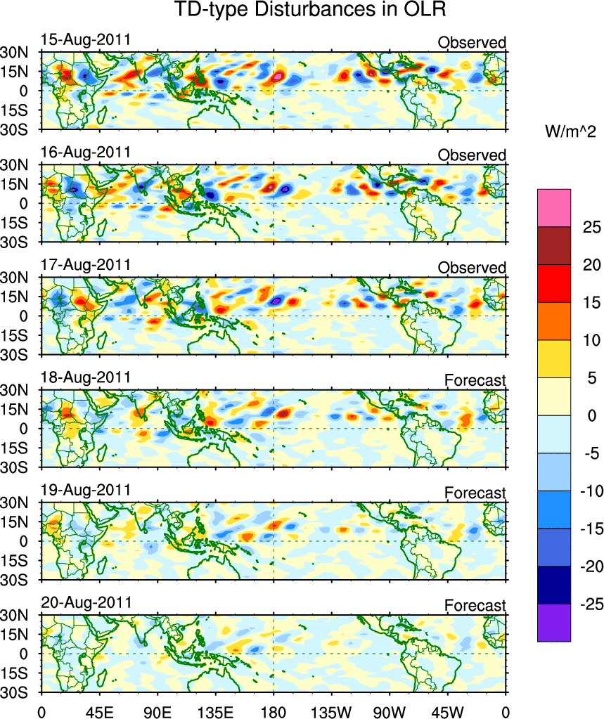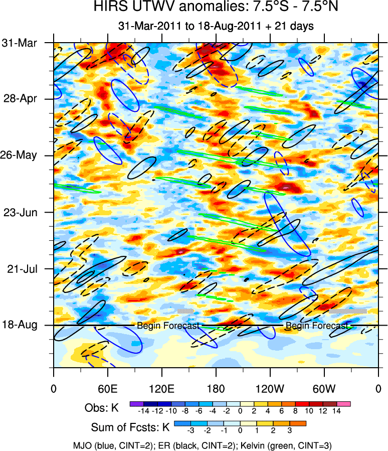 To identify tropical waves in near real-time, the OLR and UTWV data are filtered following Wheeler & Weickmann (2001 MWR). The daily anomalies are calculated using the first 3 harmonics of the seasonal cycle for 1979–2009. Missing values are then filled using linear interpolation in space and time. The most recent 365 days of anomalies are padded with 659 days of zeroes, and the result is filtered for each wave type.