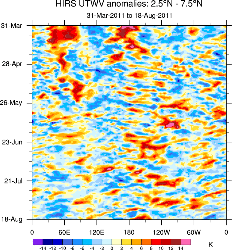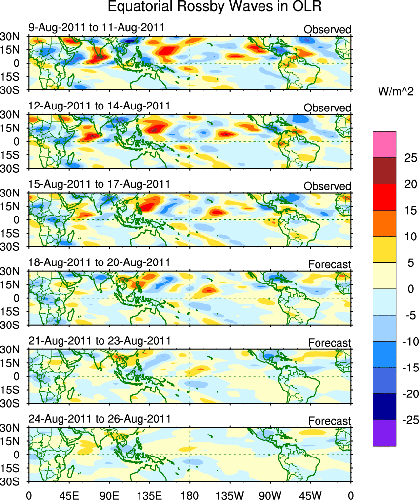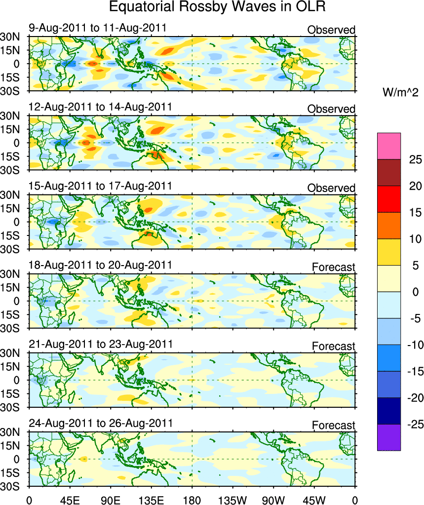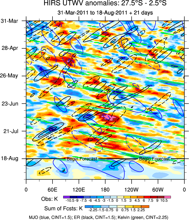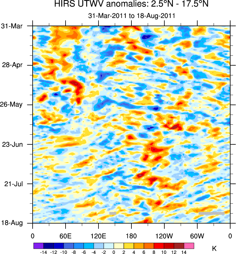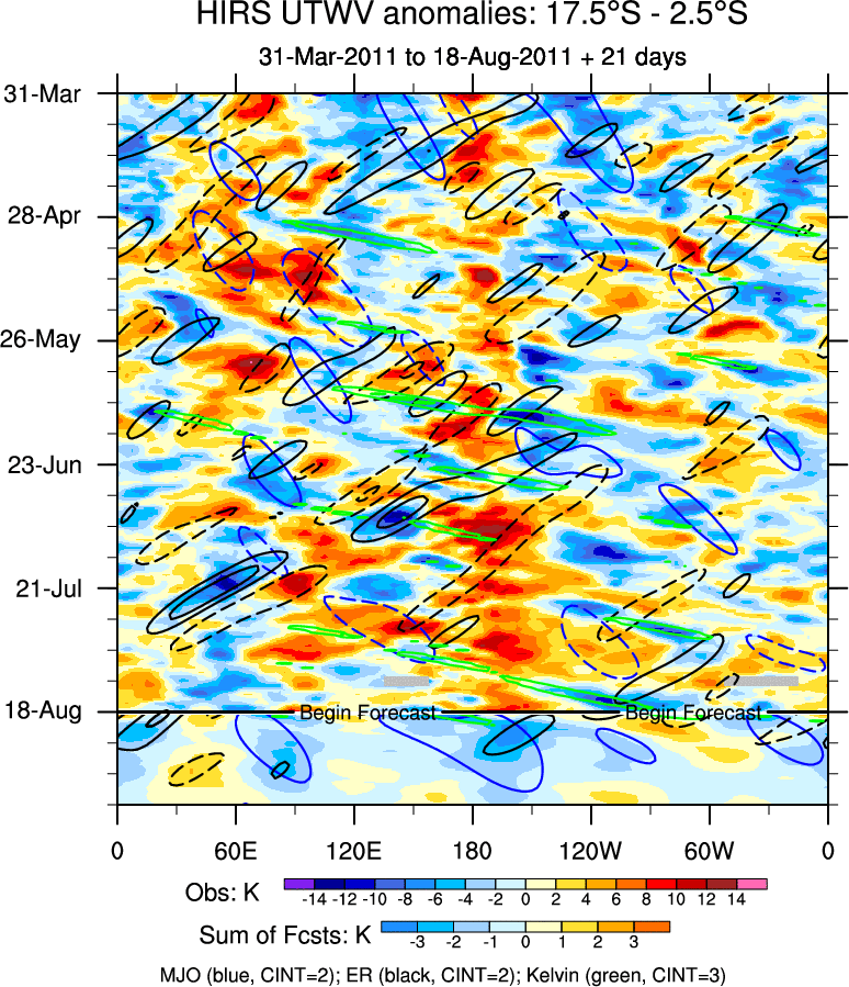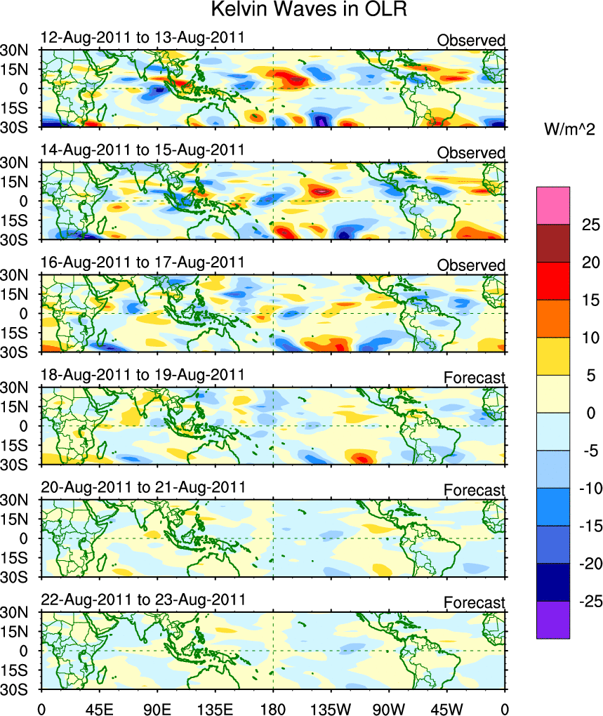 To identify tropical waves in near real-time, the OLR and UTWV data are filtered following Wheeler & Weickmann (2001 MWR). The daily anomalies are calculated using the first 3 harmonics of the seasonal cycle for 1979–2009. Missing values are then filled using linear interpolation in space and time. The most recent 365 days of anomalies are padded with 659 days of zeroes, and the result is filtered for each wave type.