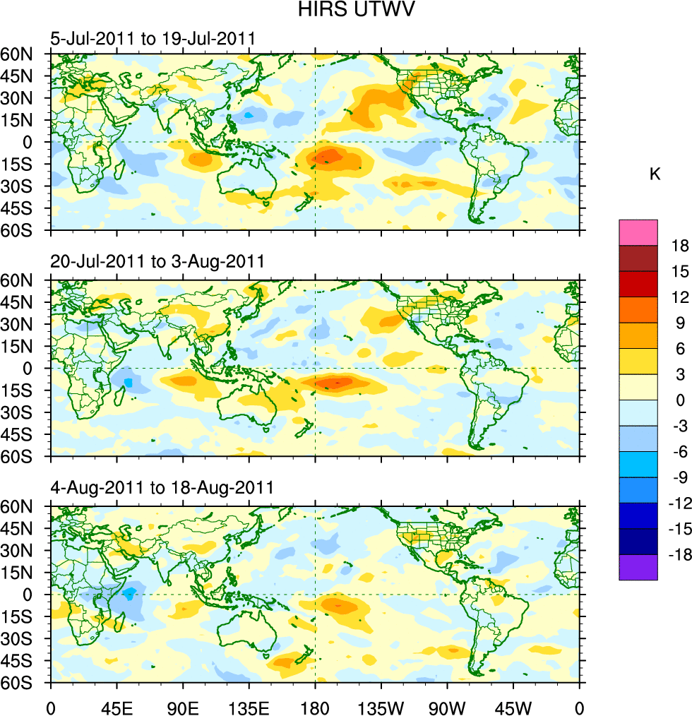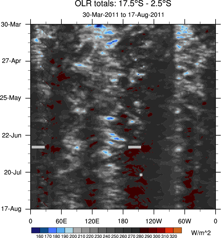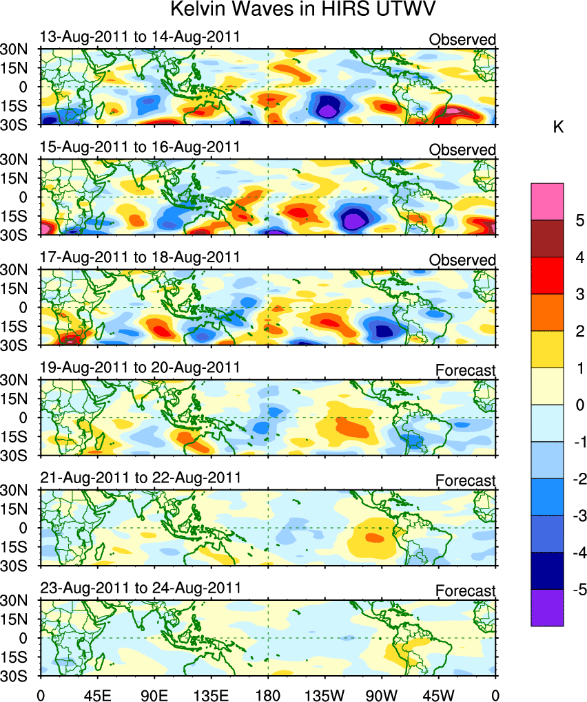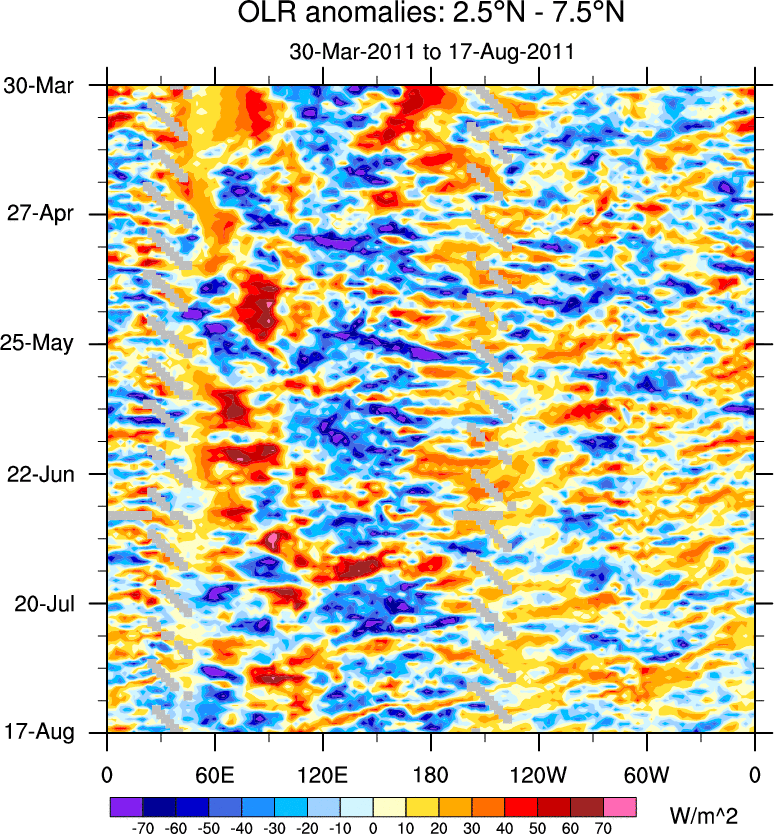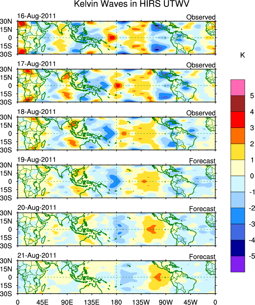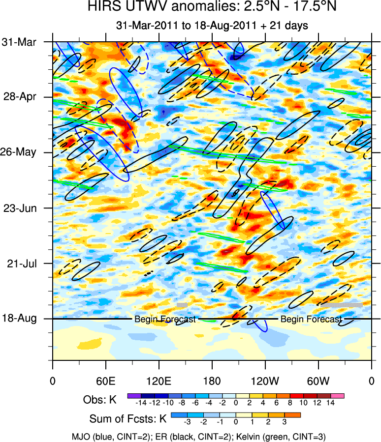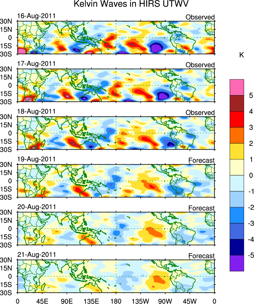 To identify tropical waves in near real-time, the OLR and UTWV data are filtered following Wheeler & Weickmann (2001 MWR). The daily anomalies are calculated using the first 3 harmonics of the seasonal cycle for 1979–2009. Missing values are then filled using linear interpolation in space and time. The most recent 365 days of anomalies are padded with 659 days of zeroes, and the result is filtered for each wave type.