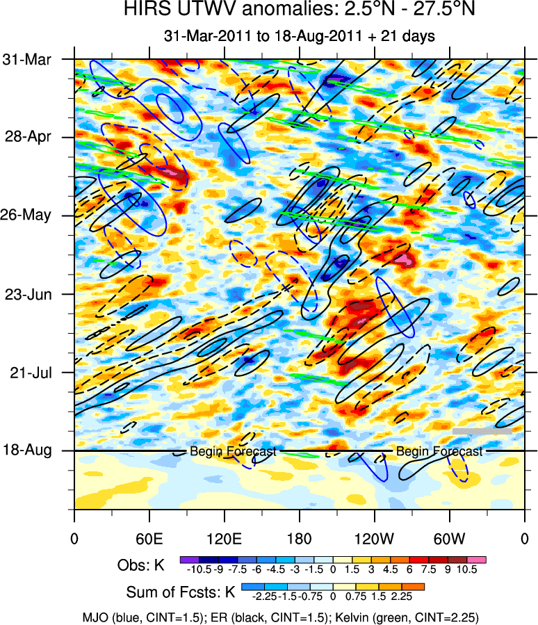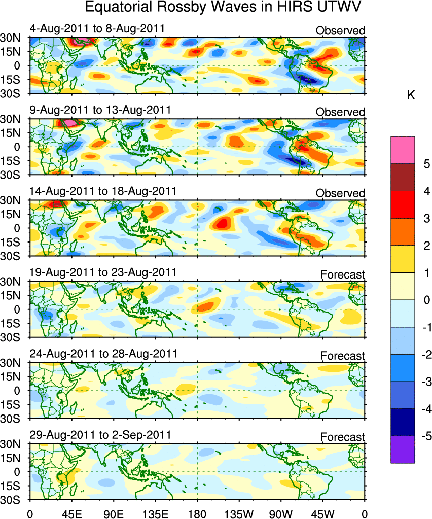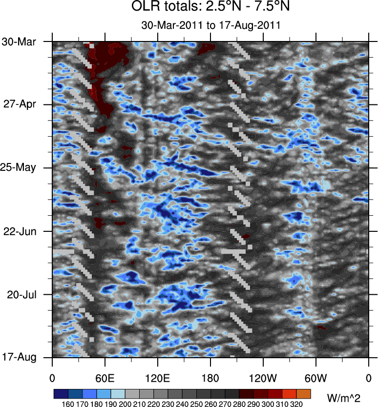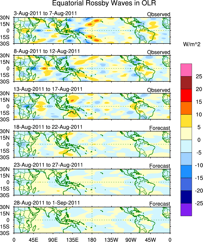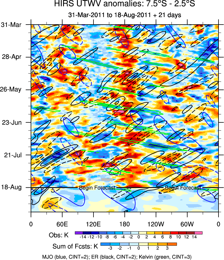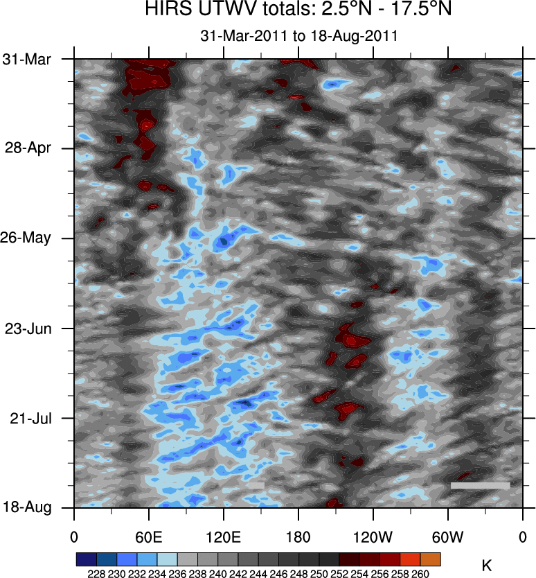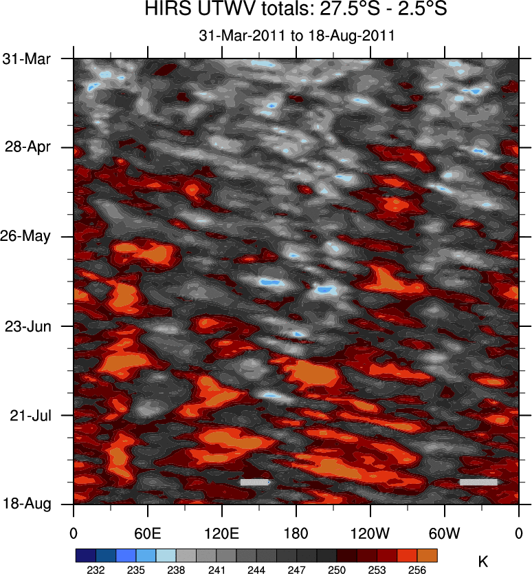To identify tropical waves in near real-time, the OLR and UTWV data are filtered following Wheeler & Weickmann (2001 MWR). The daily anomalies are calculated using the first 3 harmonics of the seasonal cycle for 1979–2009. Missing values are then filled using linear interpolation in space and time. The most recent 365 days of anomalies are padded with 659 days of zeroes, and the result is filtered for each wave type.