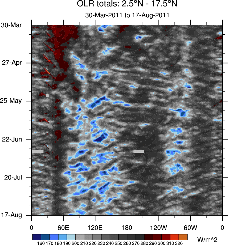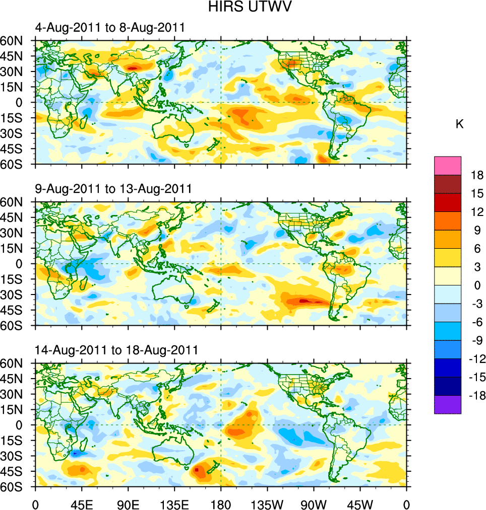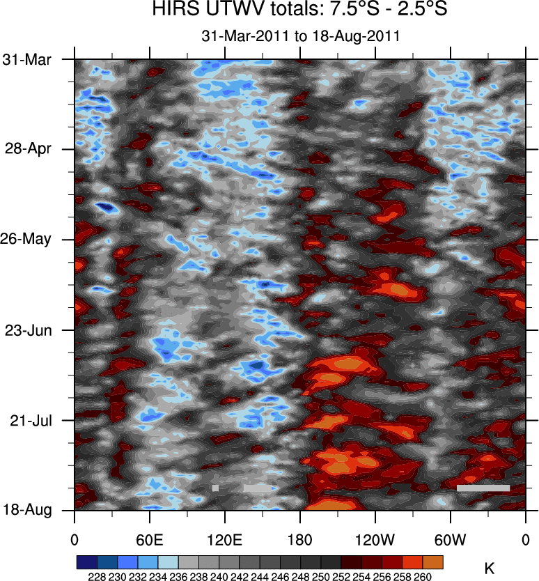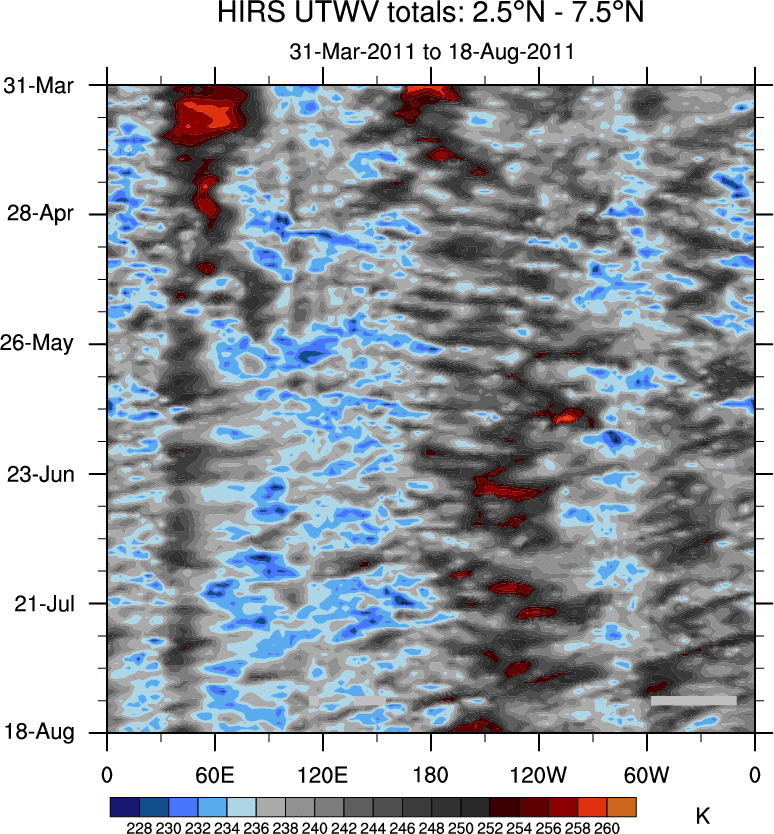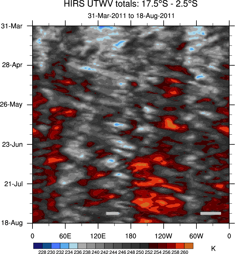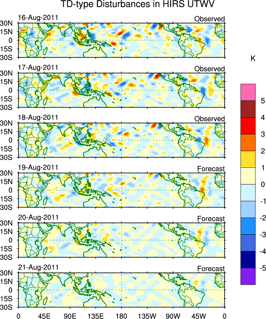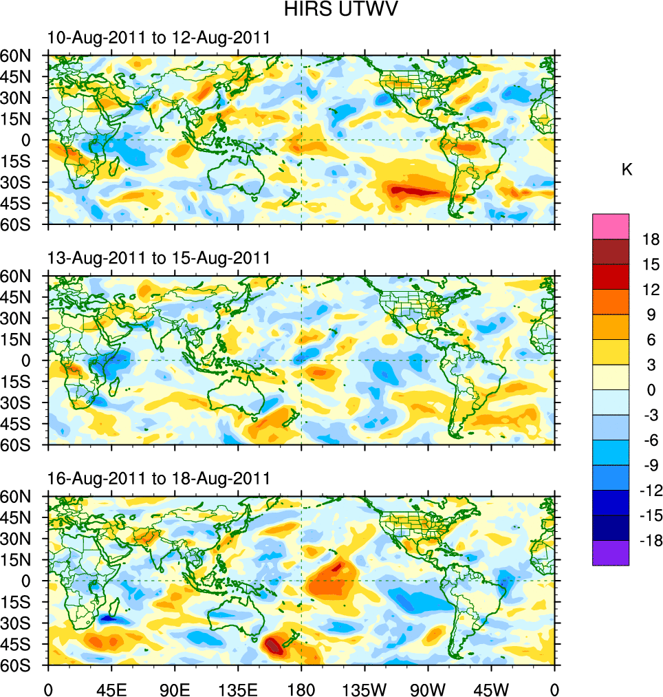 To identify tropical waves in near real-time, the OLR and UTWV data are filtered following Wheeler & Weickmann (2001 MWR). The daily anomalies are calculated using the first 3 harmonics of the seasonal cycle for 1979–2009. Missing values are then filled using linear interpolation in space and time. The most recent 365 days of anomalies are padded with 659 days of zeroes, and the result is filtered for each wave type.