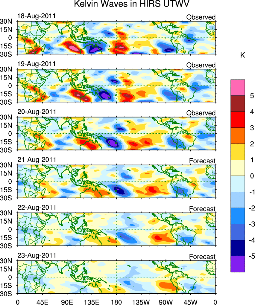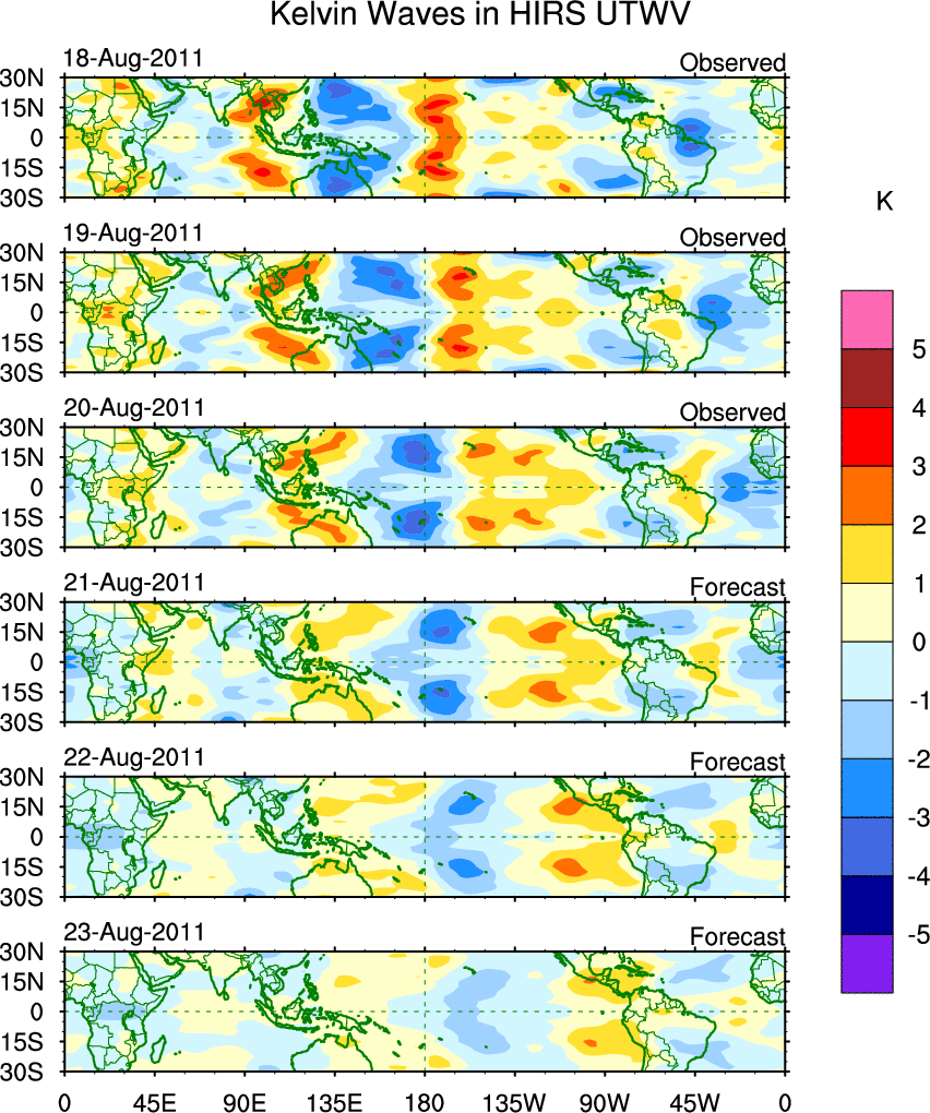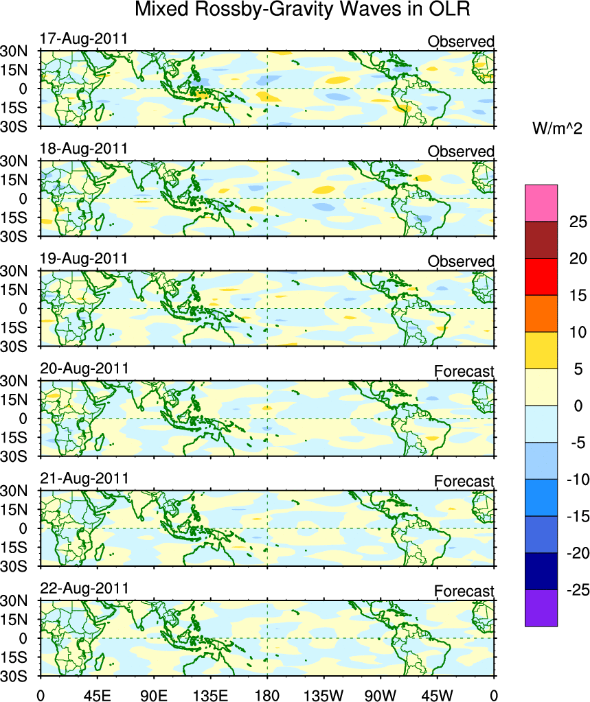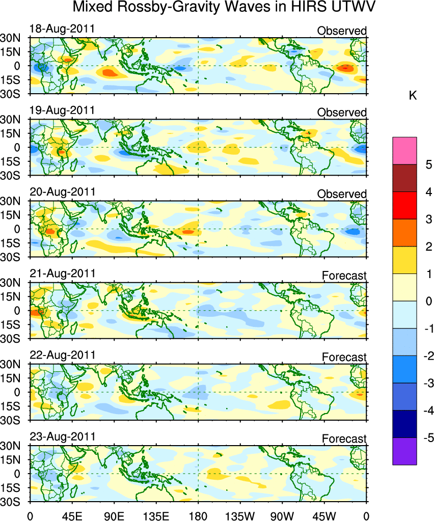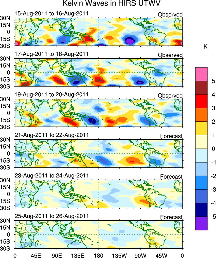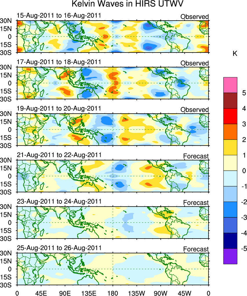 To identify tropical waves in near real-time, the OLR and UTWV data are filtered following Wheeler & Weickmann (2001 MWR). The daily anomalies are calculated using the first 3 harmonics of the seasonal cycle for 1979–2009. Missing values are then filled using linear interpolation in space and time. The most recent 365 days of anomalies are padded with 659 days of zeroes, and the result is filtered for each wave type.