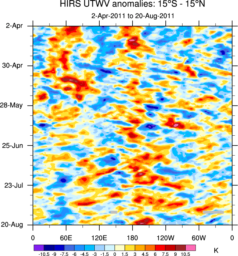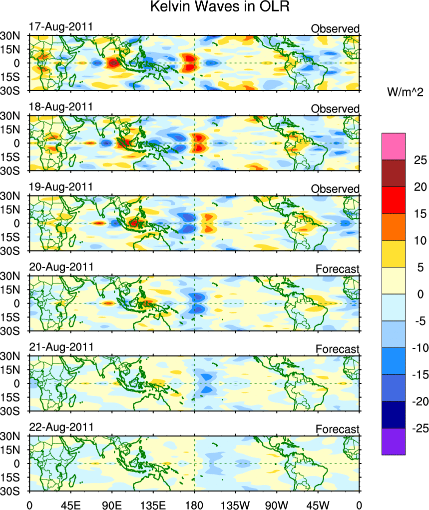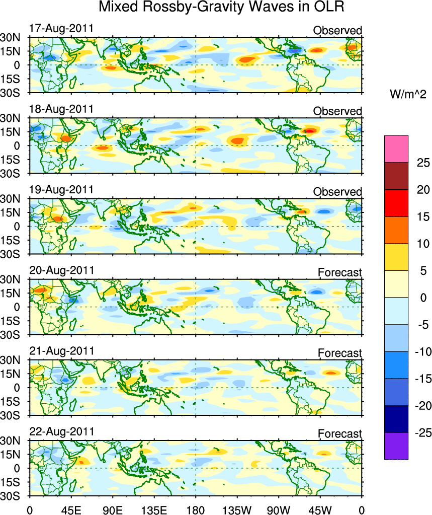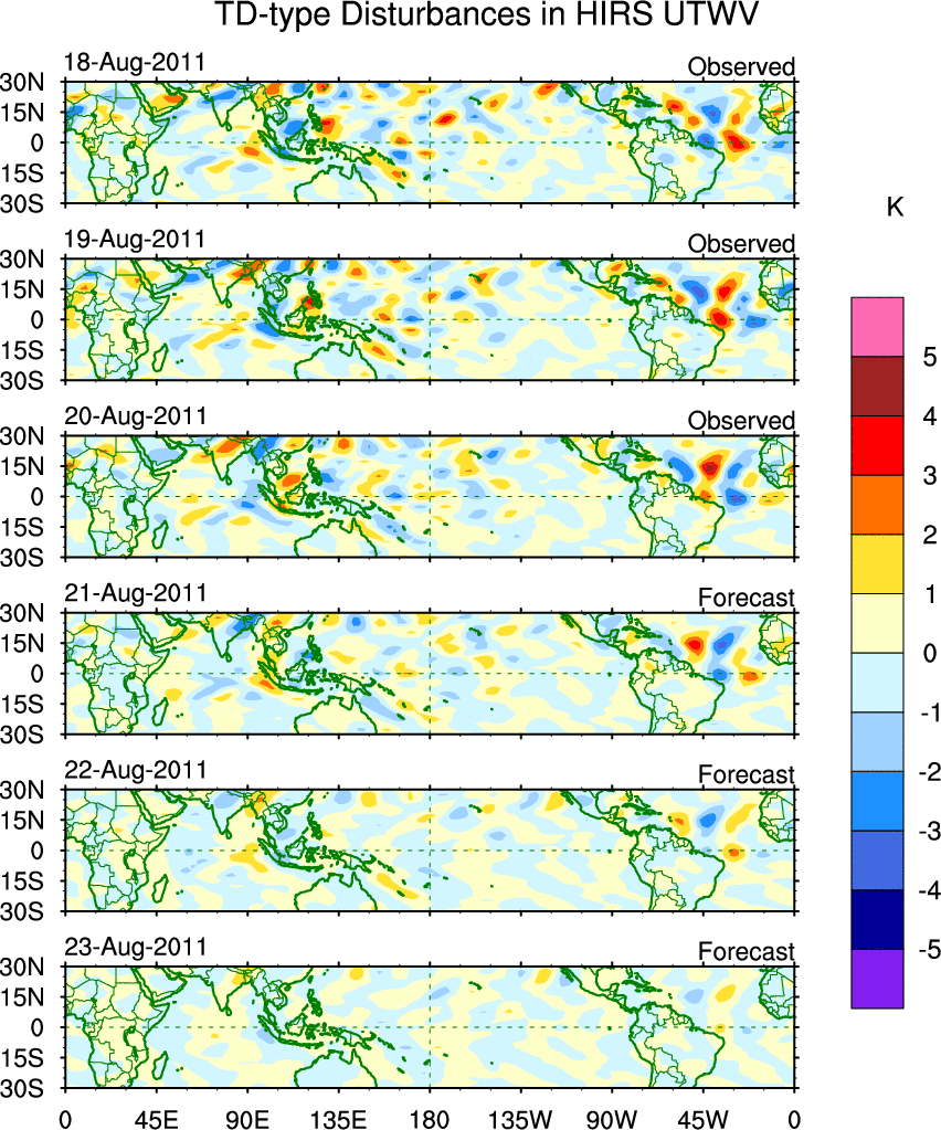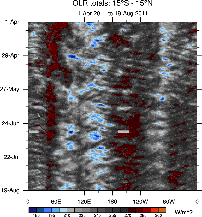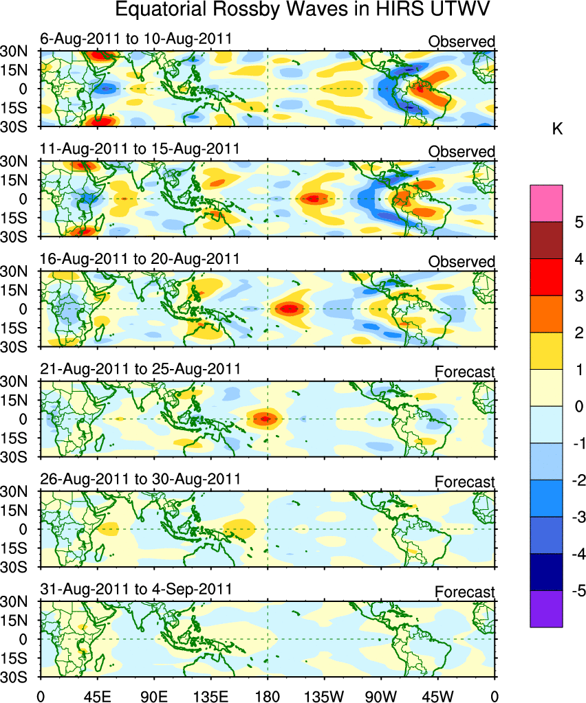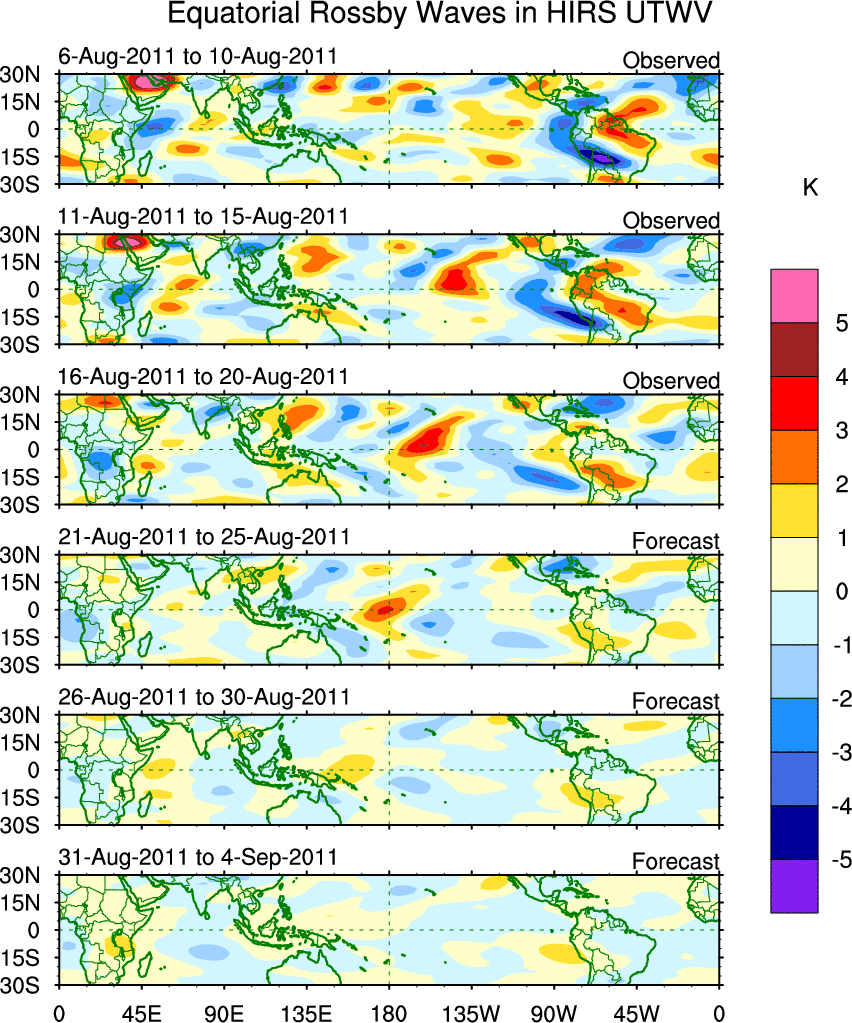To identify tropical waves in near real-time, the OLR and UTWV data are filtered following Wheeler & Weickmann (2001 MWR). The daily anomalies are calculated using the first 3 harmonics of the seasonal cycle for 1979–2009. Missing values are then filled using linear interpolation in space and time. The most recent 365 days of anomalies are padded with 659 days of zeroes, and the result is filtered for each wave type.