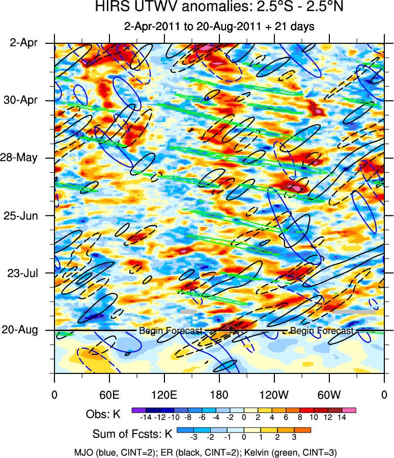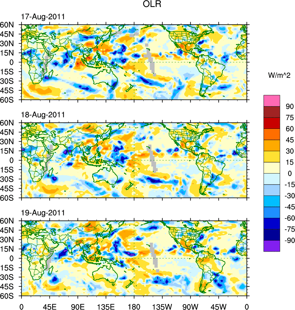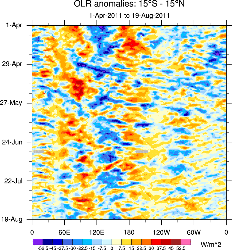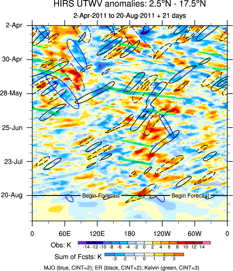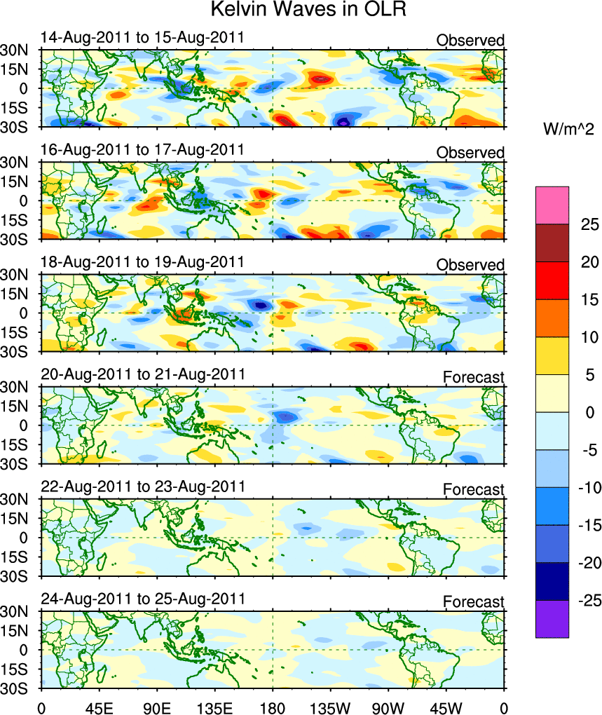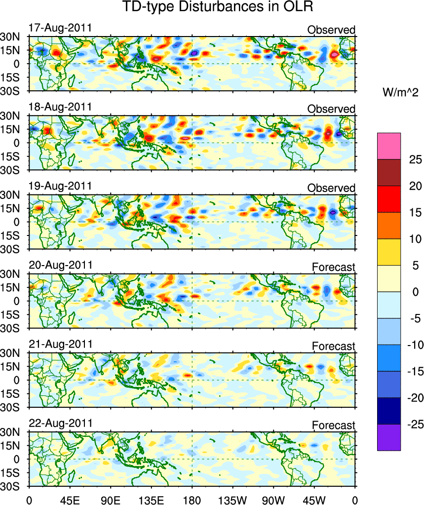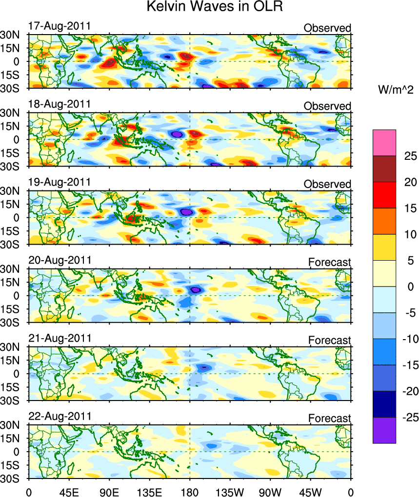 To identify tropical waves in near real-time, the OLR and UTWV data are filtered following Wheeler & Weickmann (2001 MWR). The daily anomalies are calculated using the first 3 harmonics of the seasonal cycle for 1979–2009. Missing values are then filled using linear interpolation in space and time. The most recent 365 days of anomalies are padded with 659 days of zeroes, and the result is filtered for each wave type.