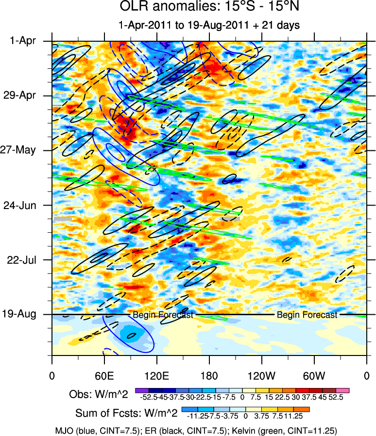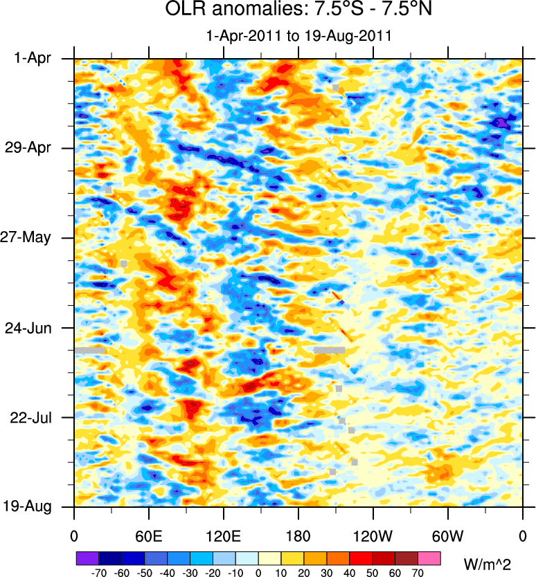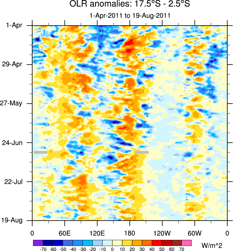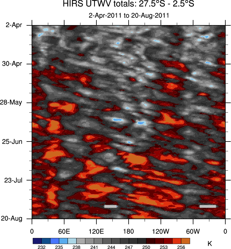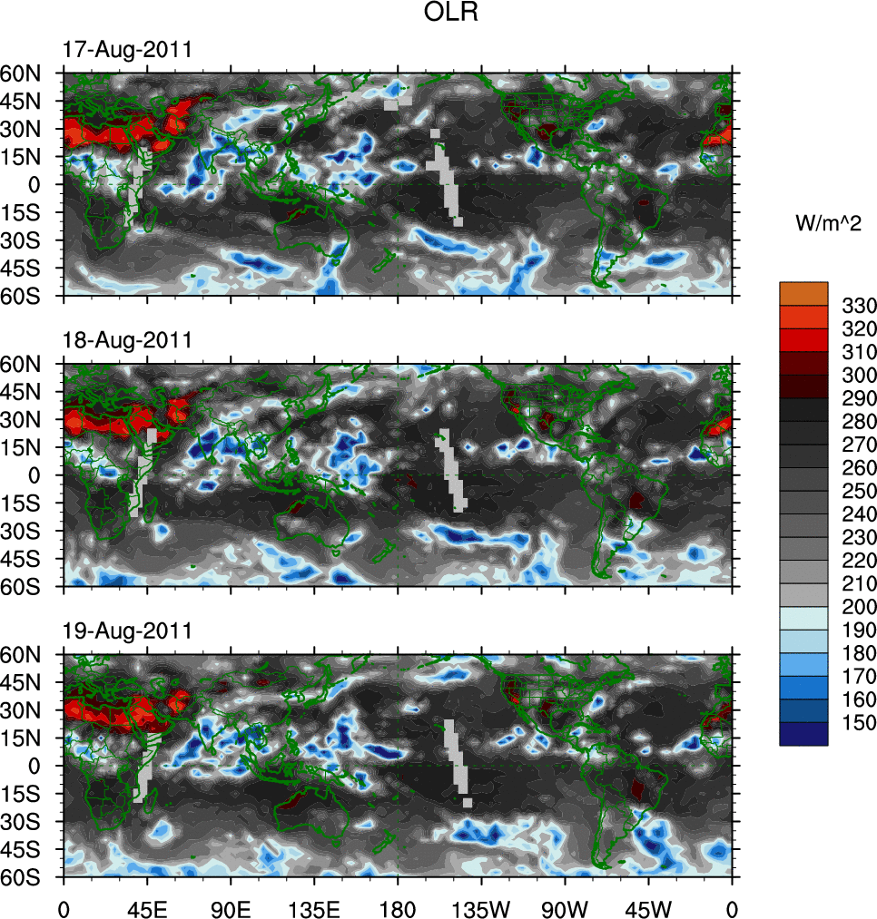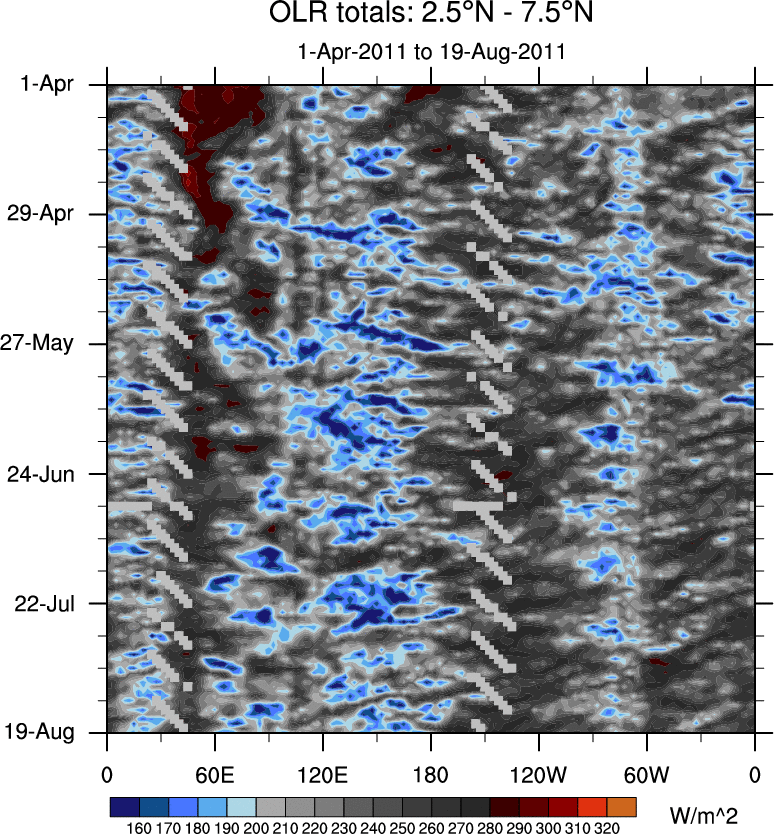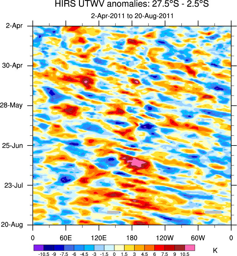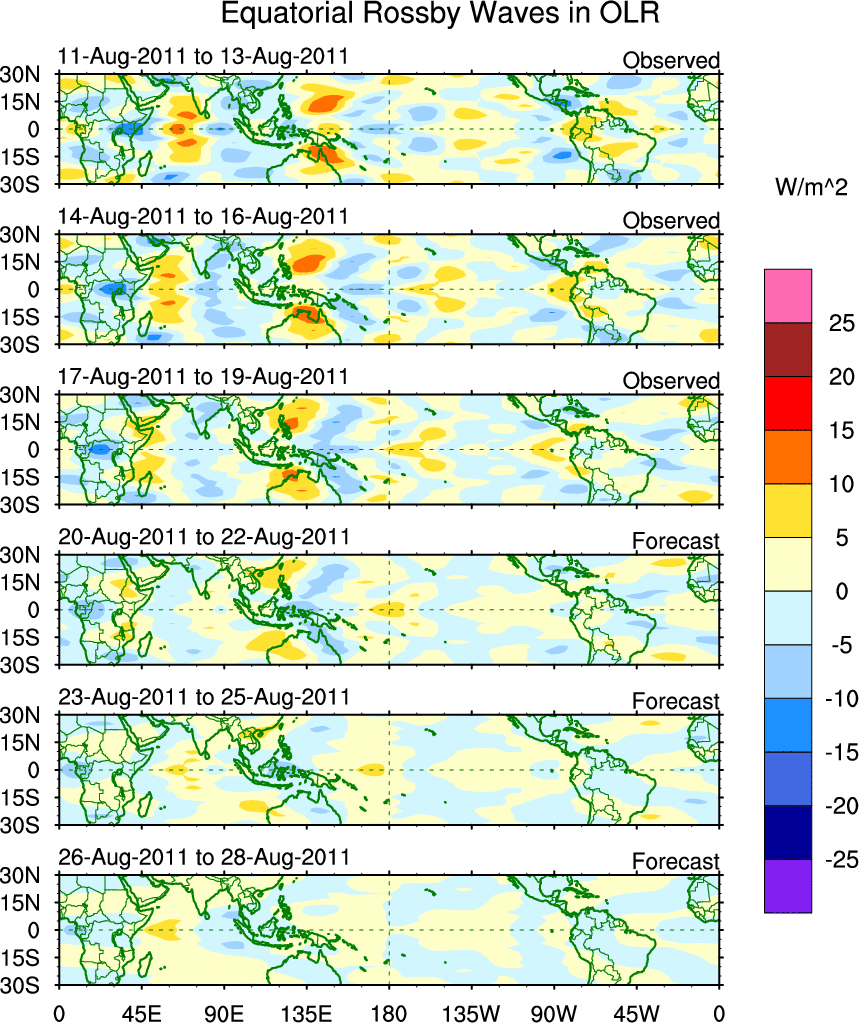 To identify tropical waves in near real-time, the OLR and UTWV data are filtered following Wheeler & Weickmann (2001 MWR). The daily anomalies are calculated using the first 3 harmonics of the seasonal cycle for 1979–2009. Missing values are then filled using linear interpolation in space and time. The most recent 365 days of anomalies are padded with 659 days of zeroes, and the result is filtered for each wave type.