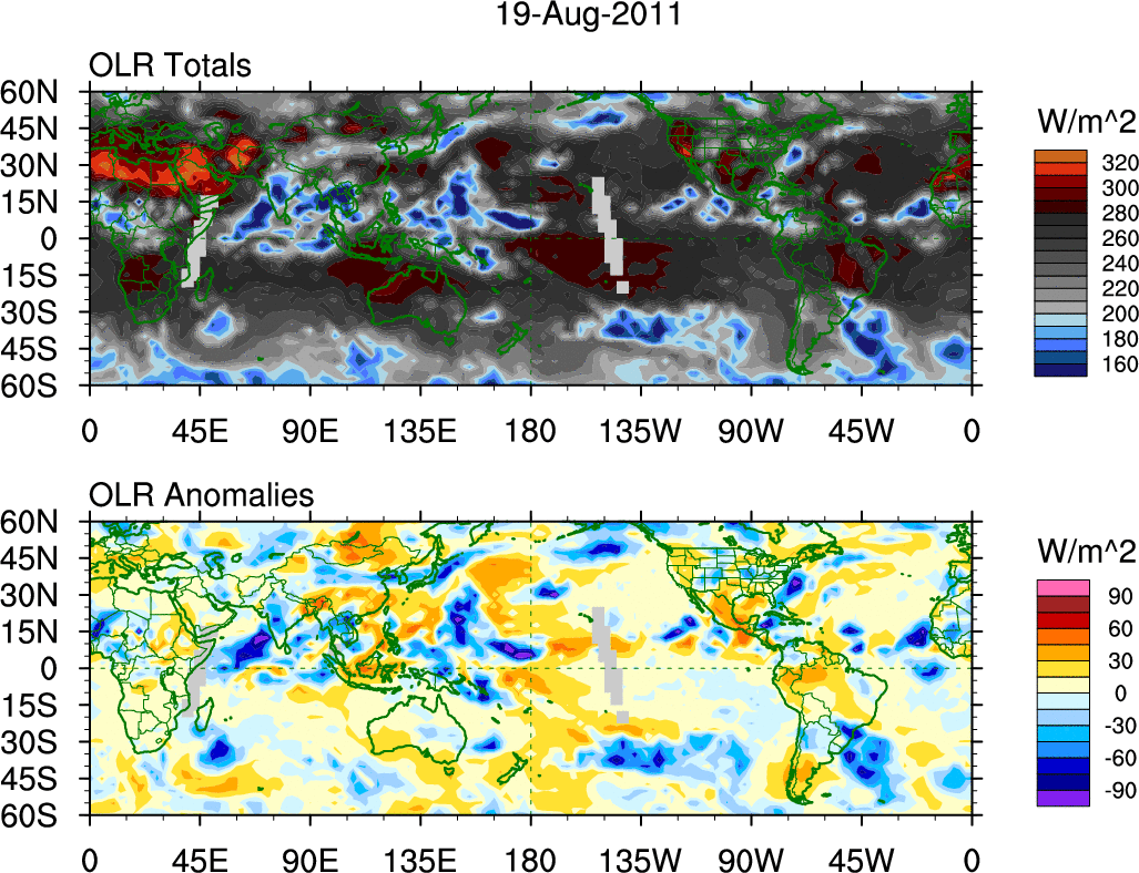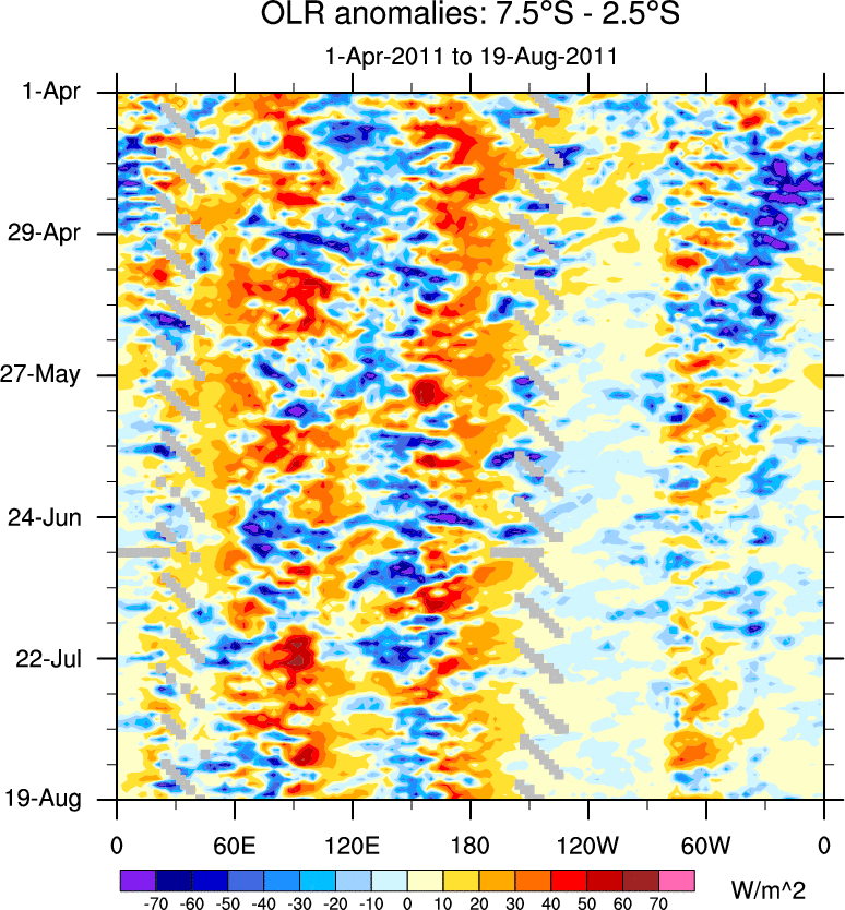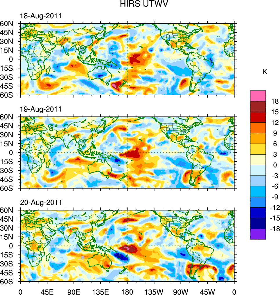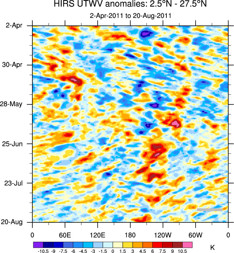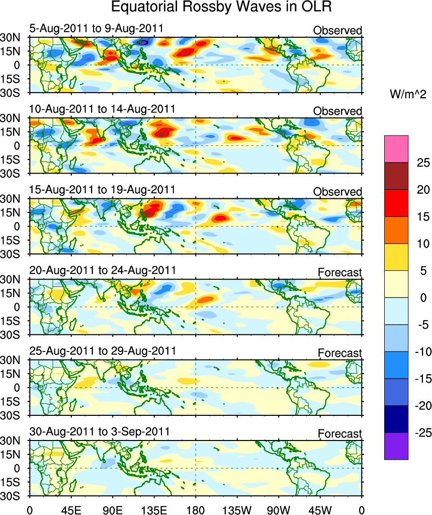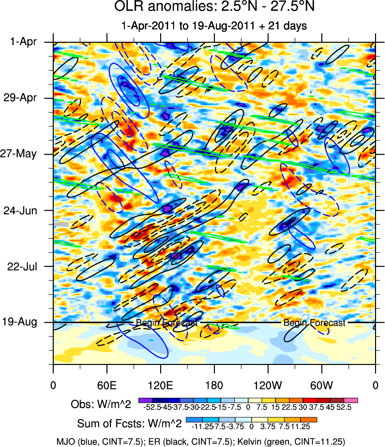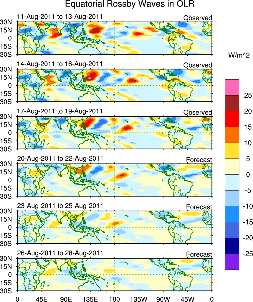 To identify tropical waves in near real-time, the OLR and UTWV data are filtered following Wheeler & Weickmann (2001 MWR). The daily anomalies are calculated using the first 3 harmonics of the seasonal cycle for 1979–2009. Missing values are then filled using linear interpolation in space and time. The most recent 365 days of anomalies are padded with 659 days of zeroes, and the result is filtered for each wave type.