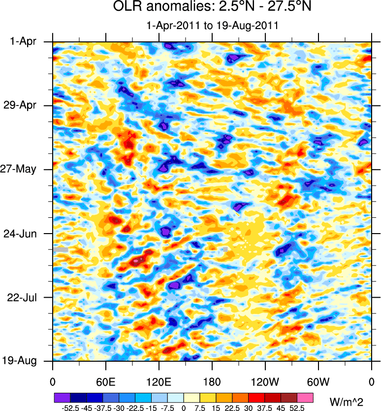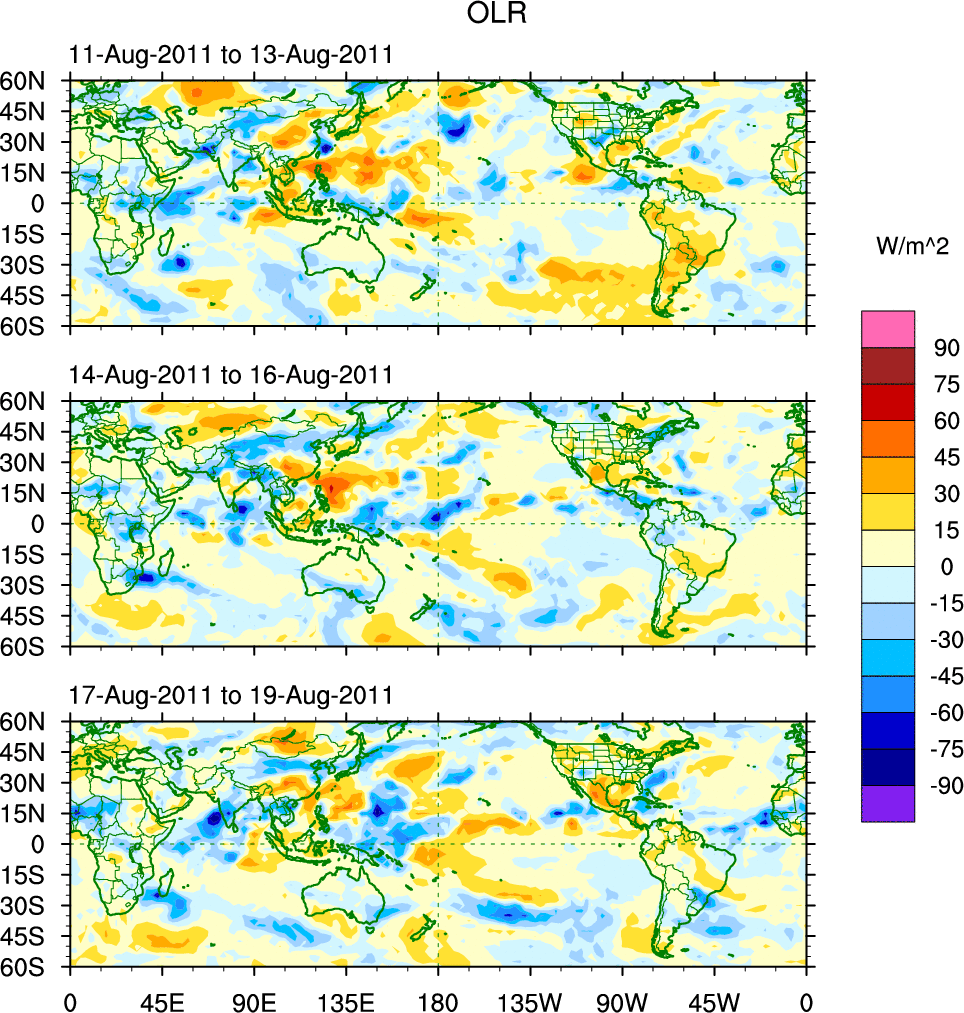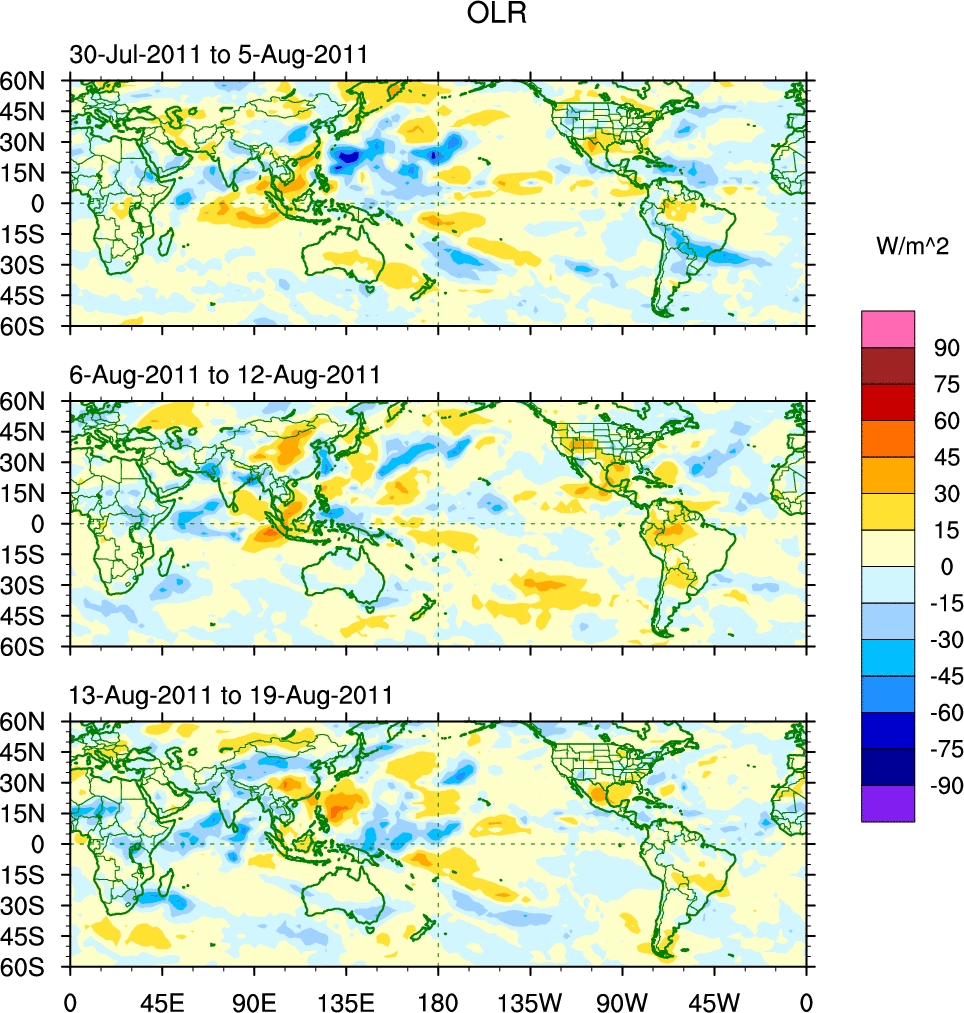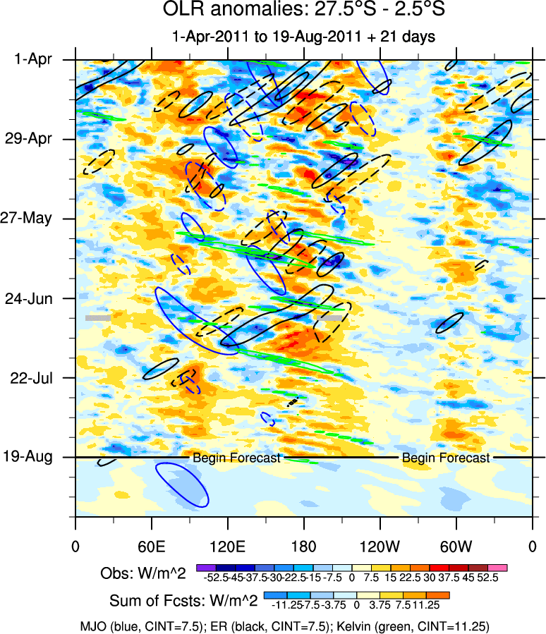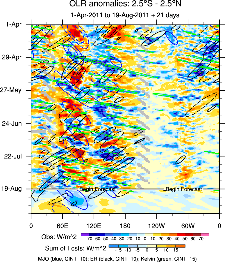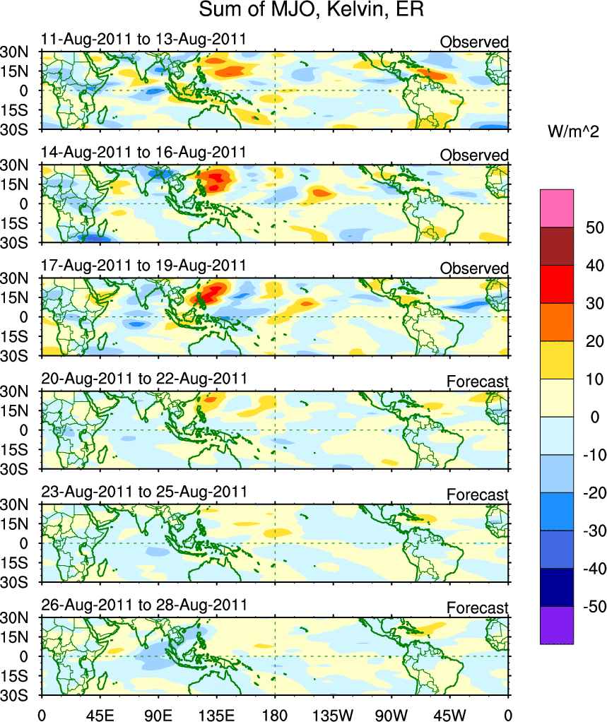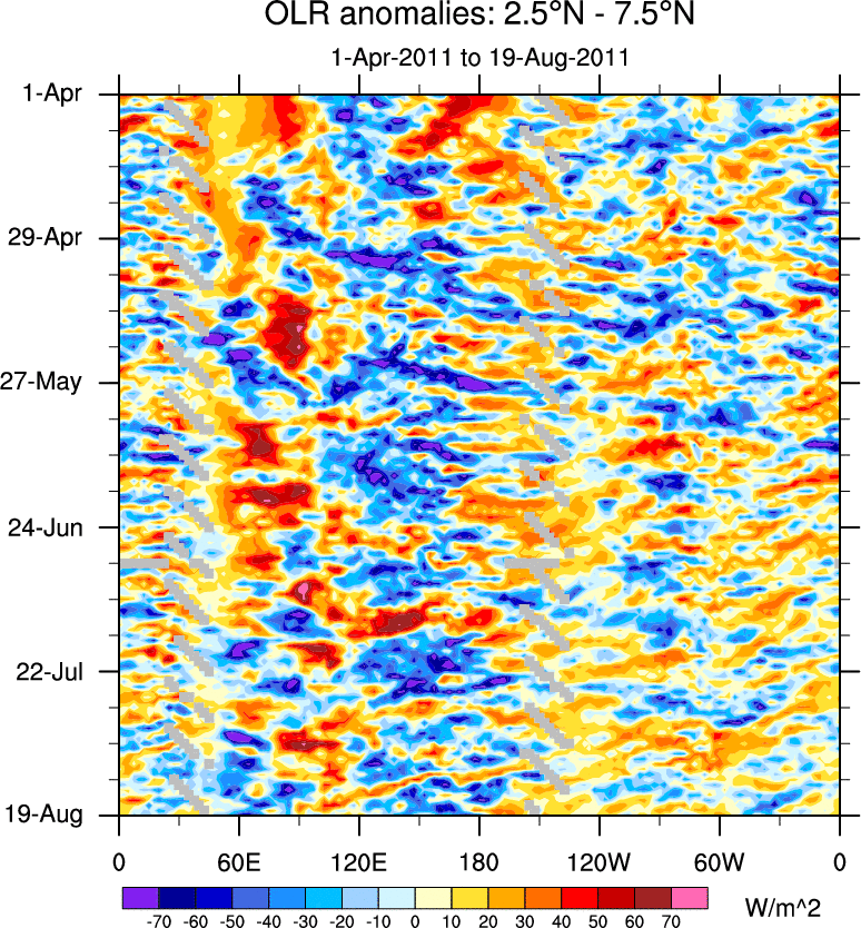 To identify tropical waves in near real-time, the OLR and UTWV data are filtered following Wheeler & Weickmann (2001 MWR). The daily anomalies are calculated using the first 3 harmonics of the seasonal cycle for 1979–2009. Missing values are then filled using linear interpolation in space and time. The most recent 365 days of anomalies are padded with 659 days of zeroes, and the result is filtered for each wave type.