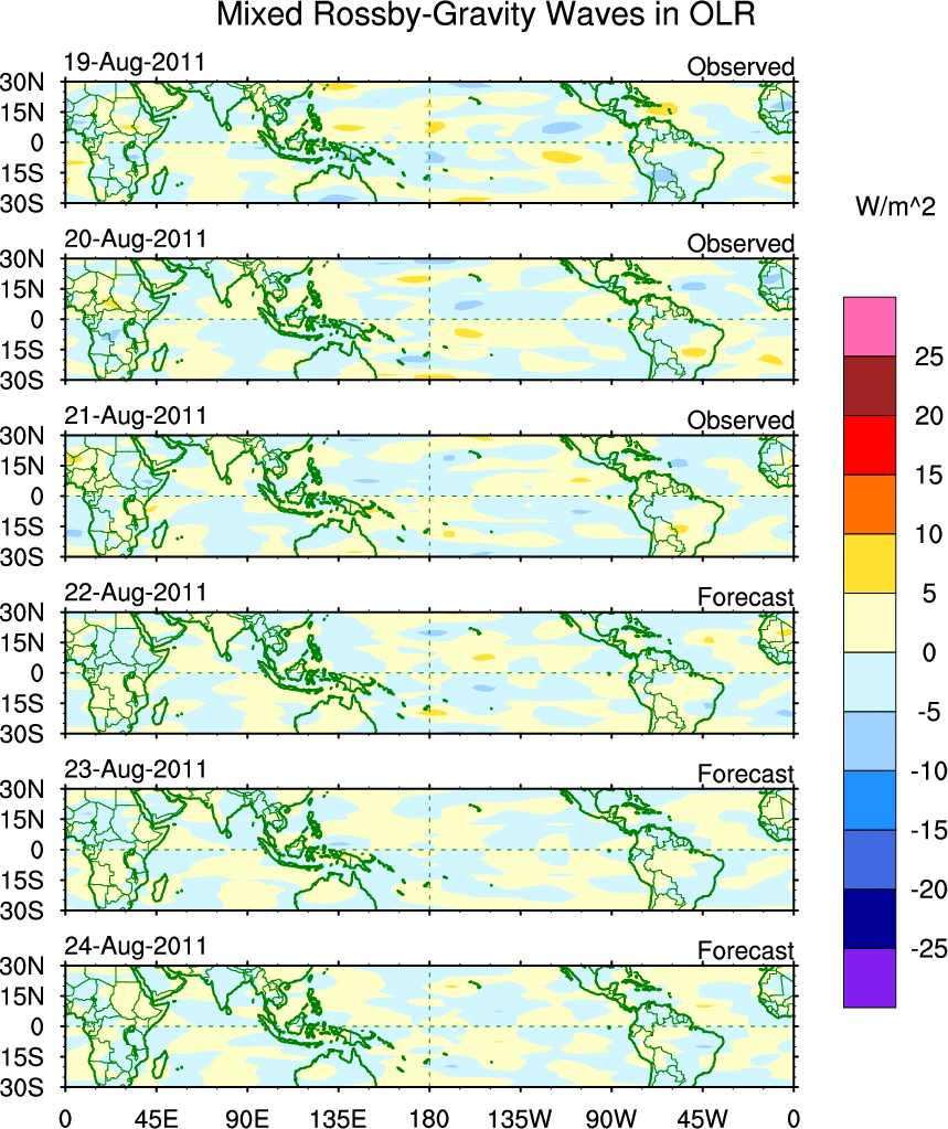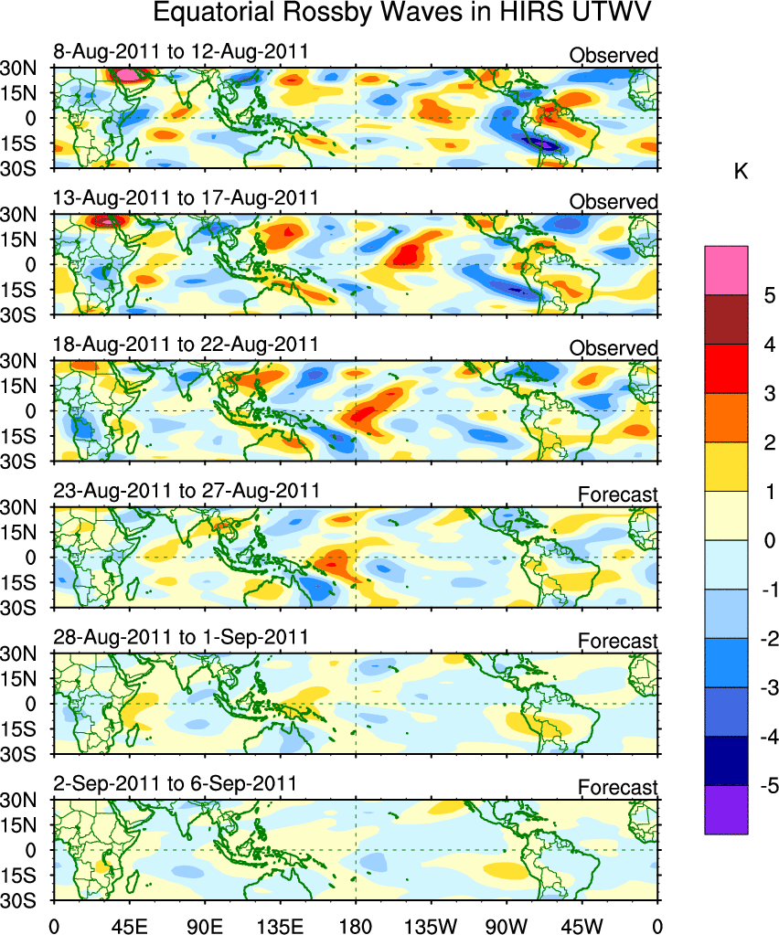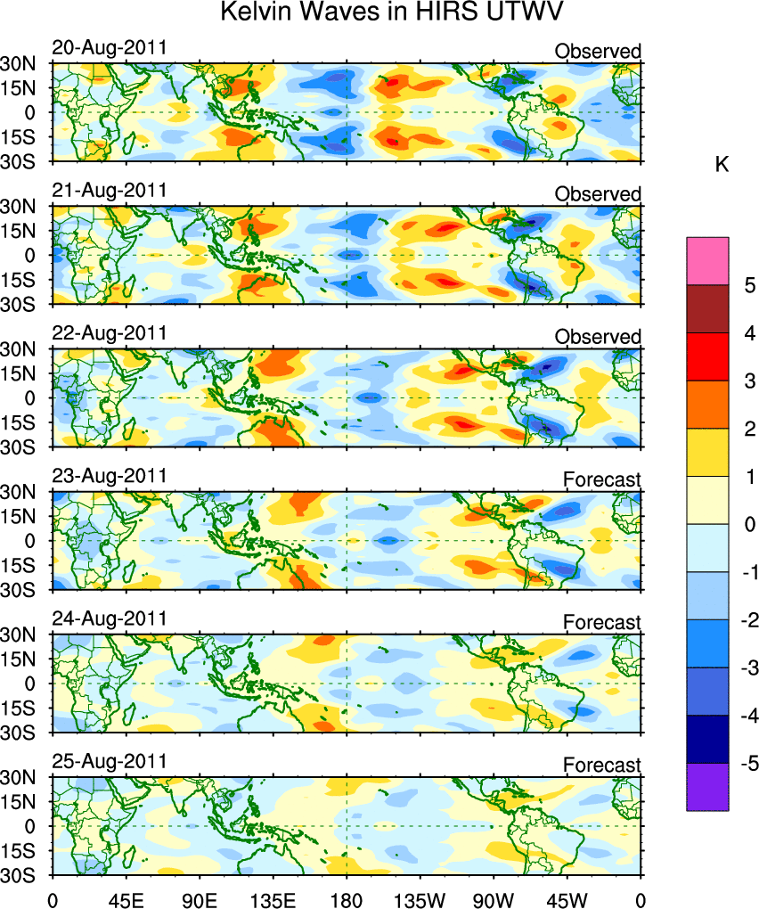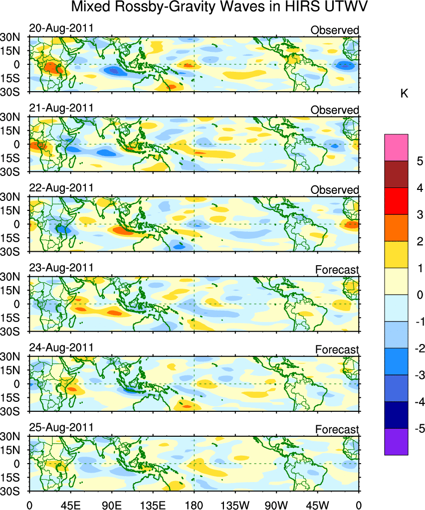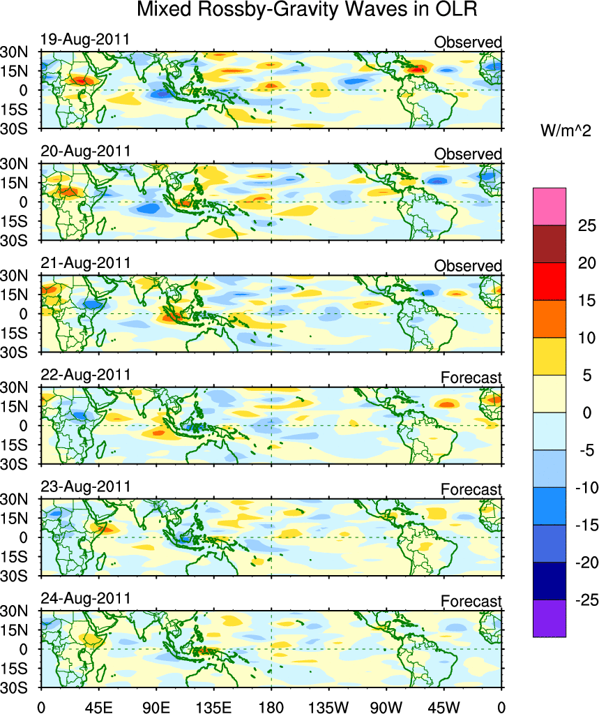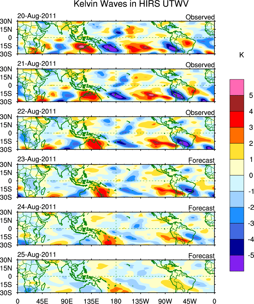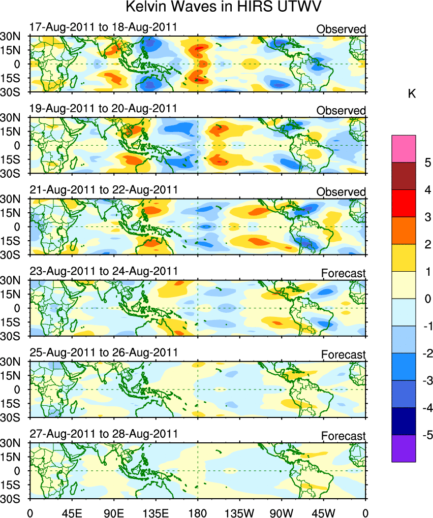 To identify tropical waves in near real-time, the OLR and UTWV data are filtered following Wheeler & Weickmann (2001 MWR). The daily anomalies are calculated using the first 3 harmonics of the seasonal cycle for 1979–2009. Missing values are then filled using linear interpolation in space and time. The most recent 365 days of anomalies are padded with 659 days of zeroes, and the result is filtered for each wave type.
