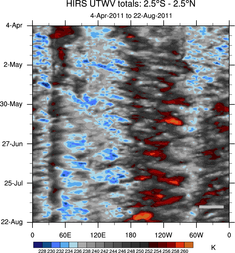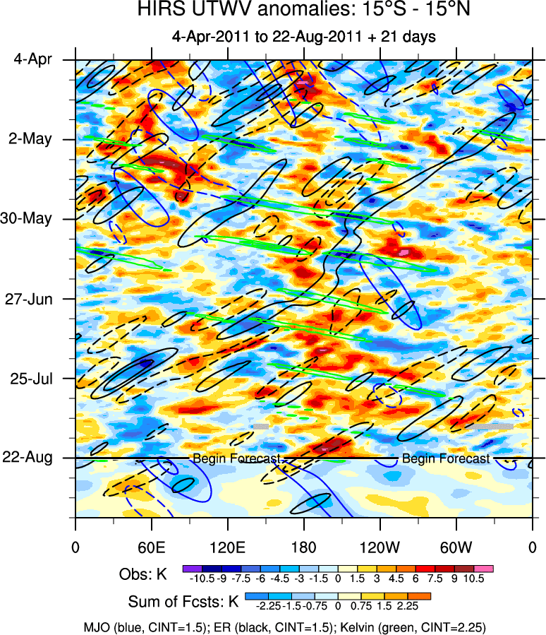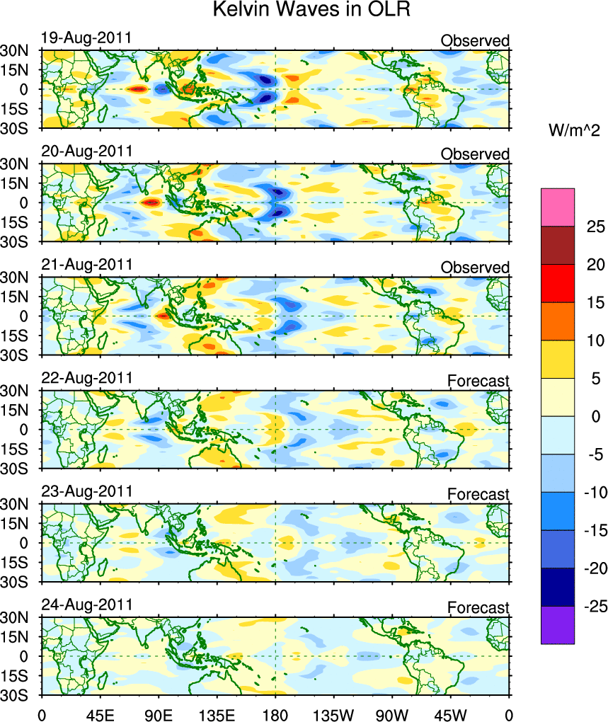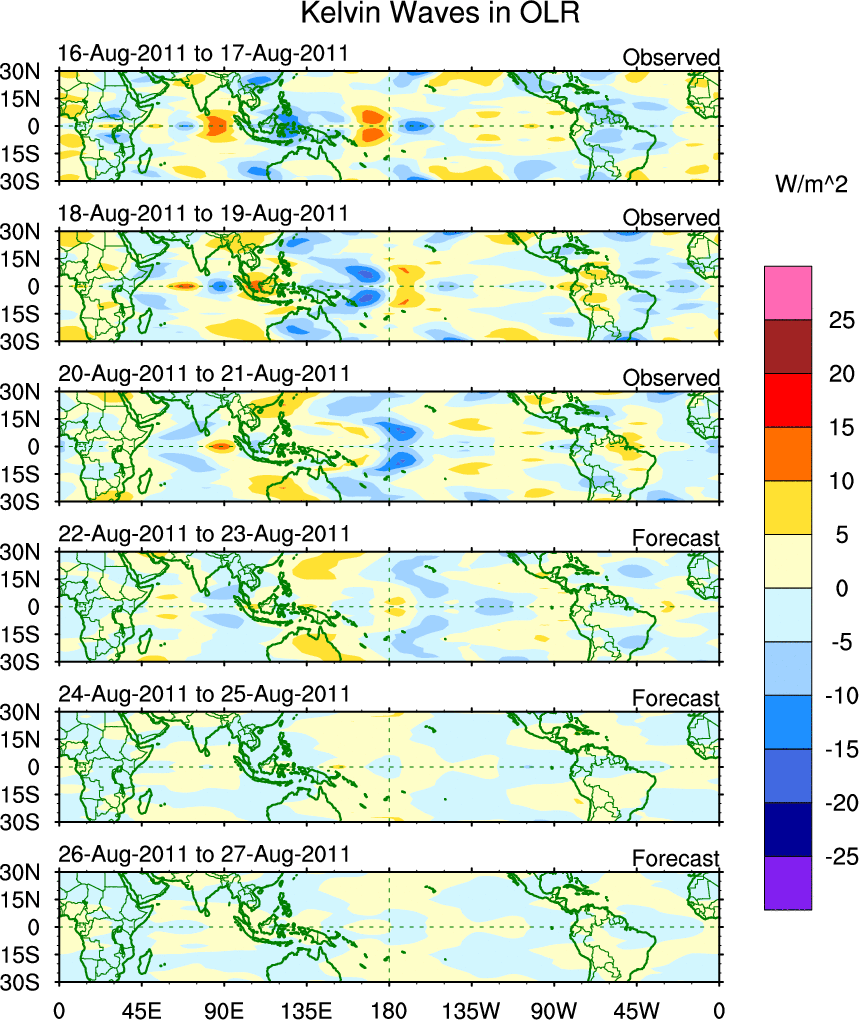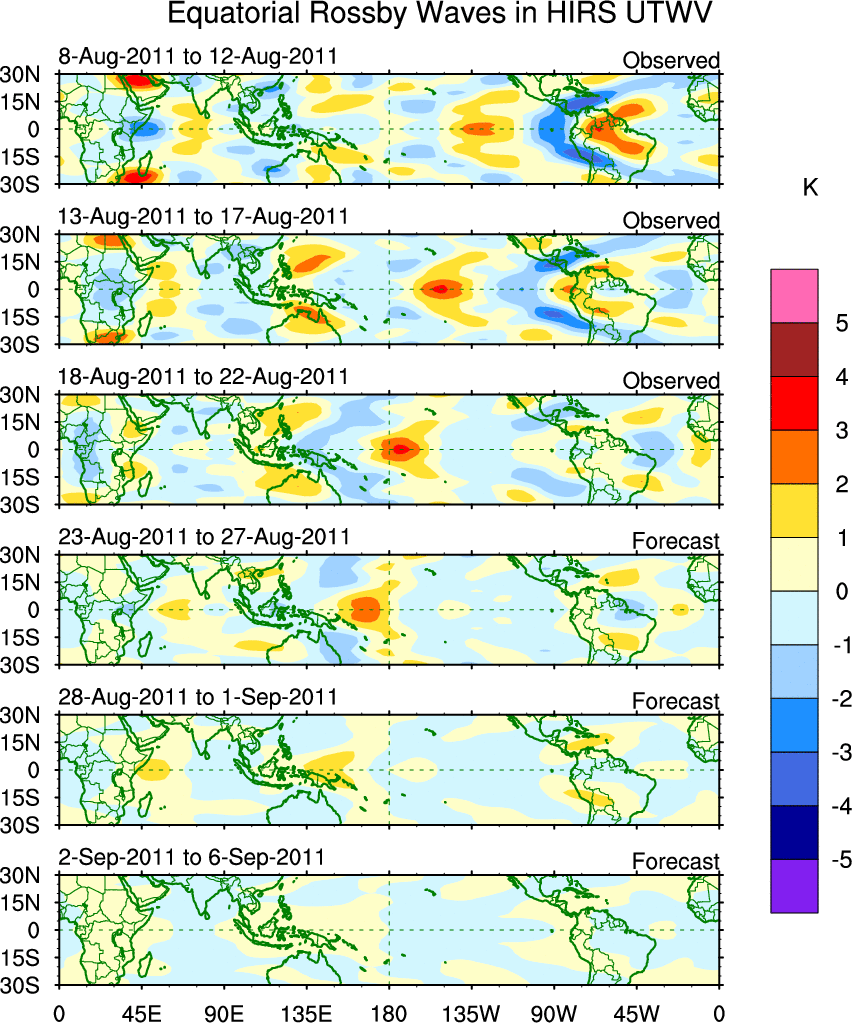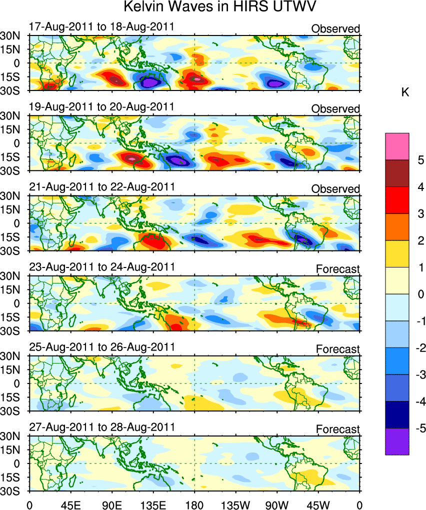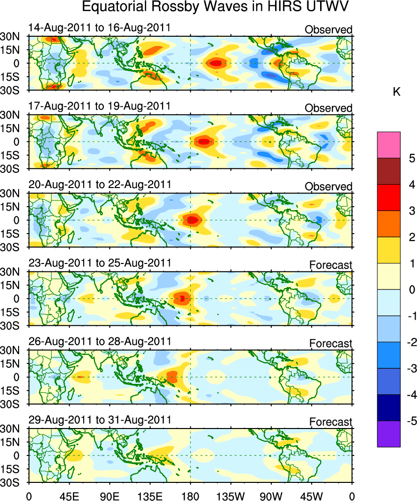 To identify tropical waves in near real-time, the OLR and UTWV data are filtered following Wheeler & Weickmann (2001 MWR). The daily anomalies are calculated using the first 3 harmonics of the seasonal cycle for 1979–2009. Missing values are then filled using linear interpolation in space and time. The most recent 365 days of anomalies are padded with 659 days of zeroes, and the result is filtered for each wave type.