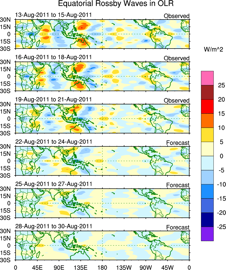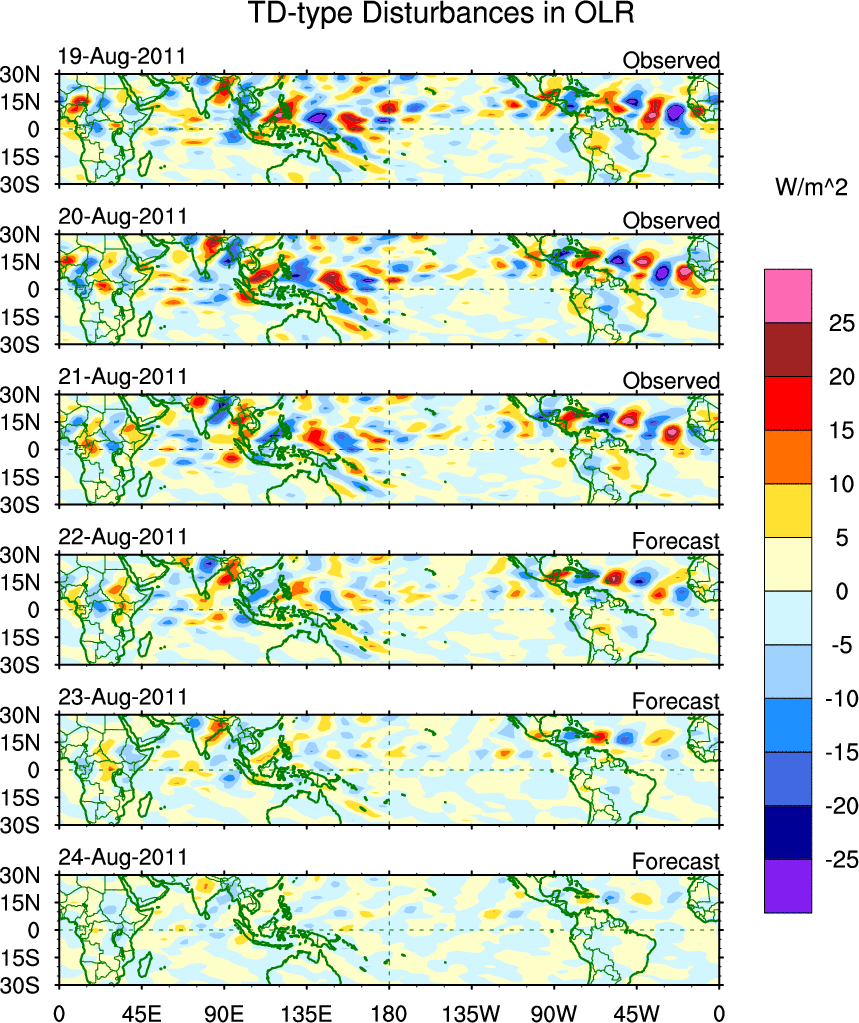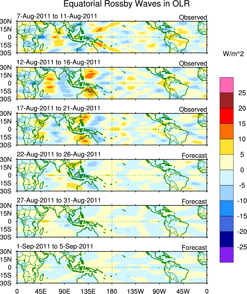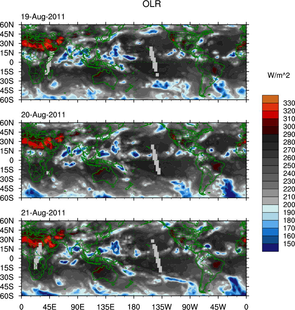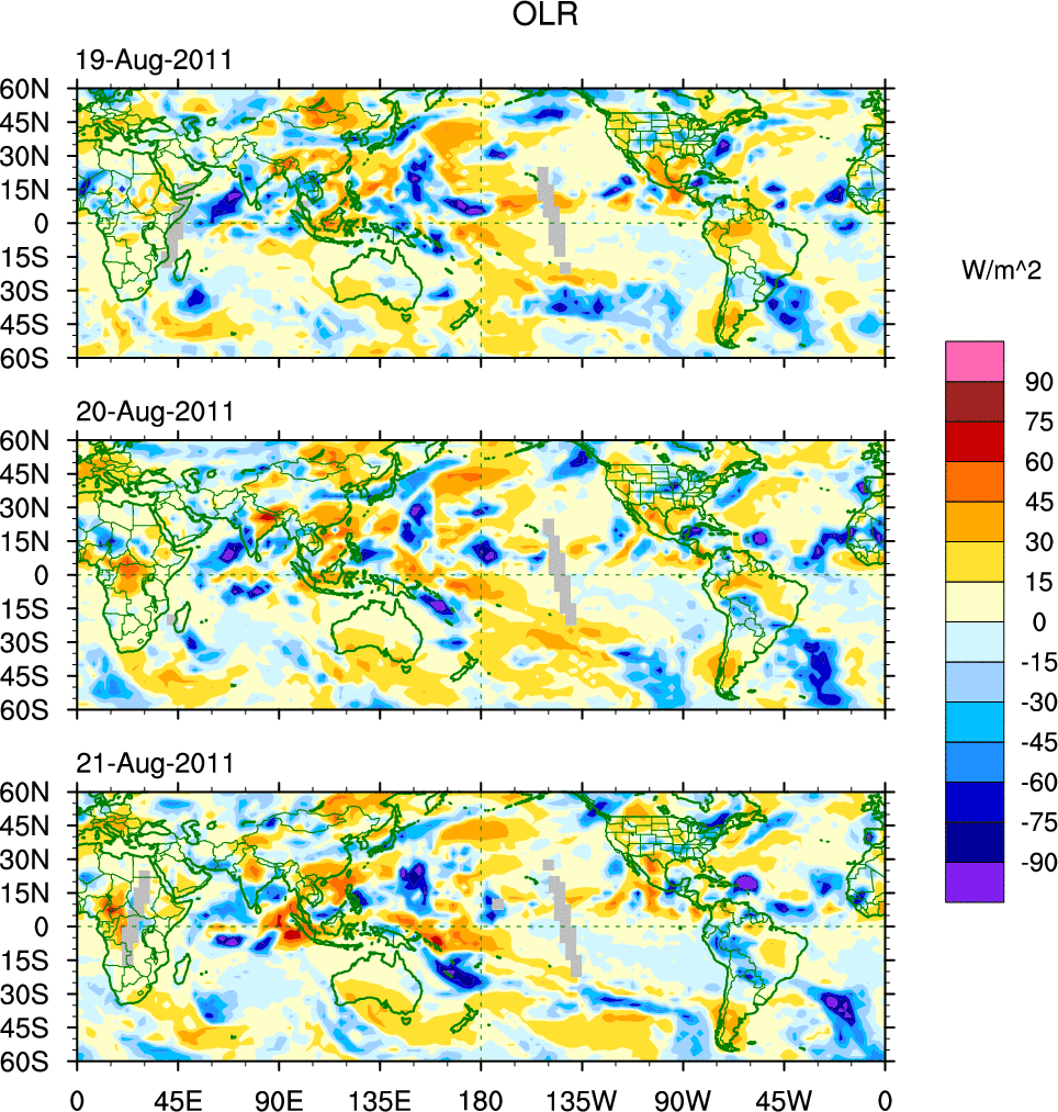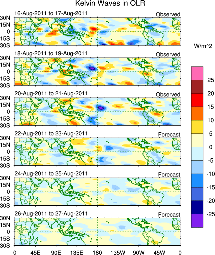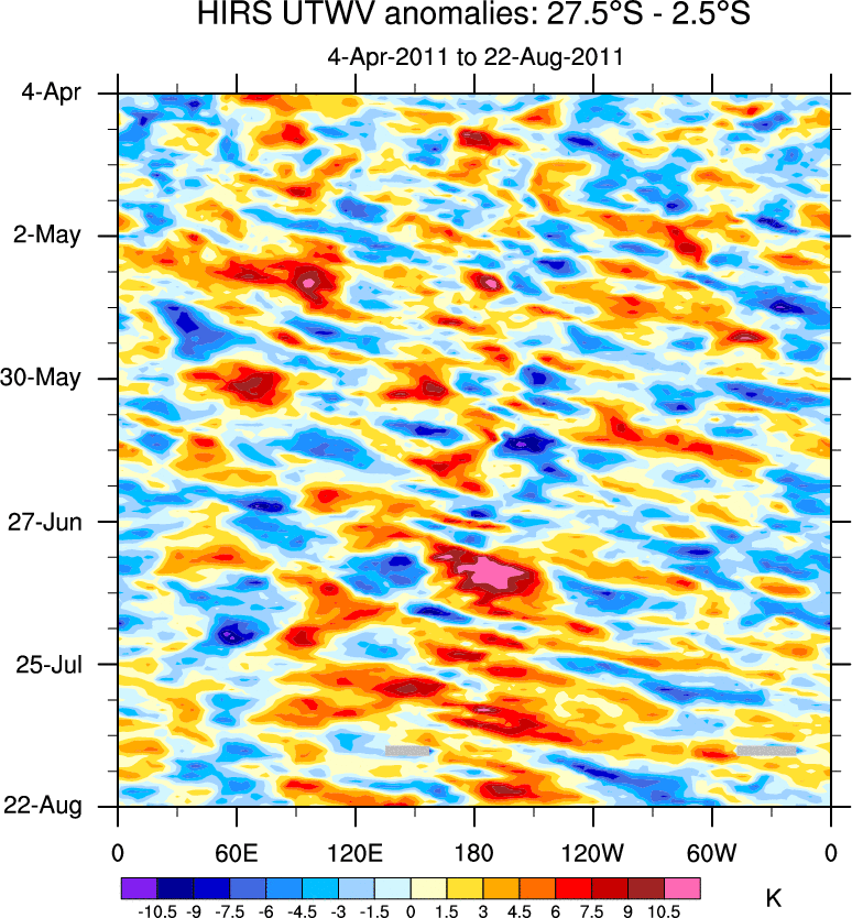 To identify tropical waves in near real-time, the OLR and UTWV data are filtered following Wheeler & Weickmann (2001 MWR). The daily anomalies are calculated using the first 3 harmonics of the seasonal cycle for 1979–2009. Missing values are then filled using linear interpolation in space and time. The most recent 365 days of anomalies are padded with 659 days of zeroes, and the result is filtered for each wave type.