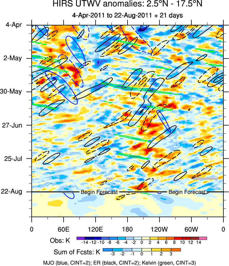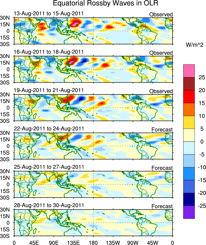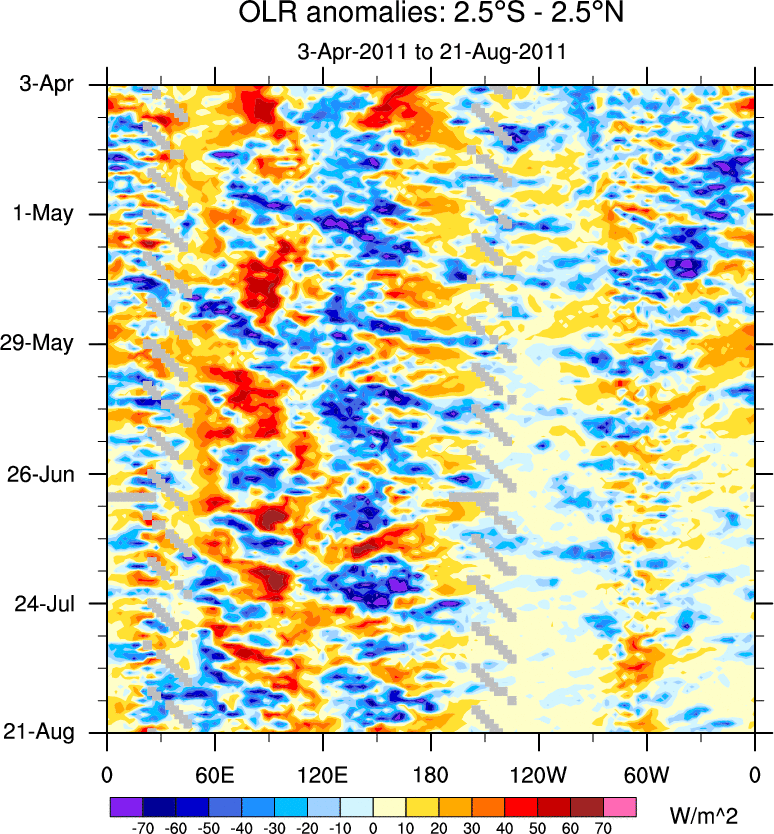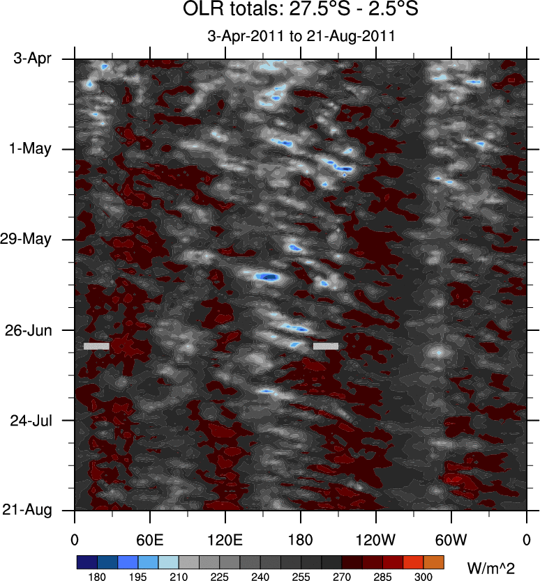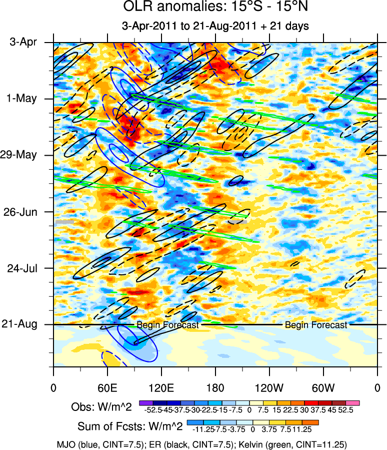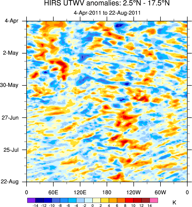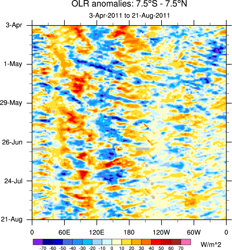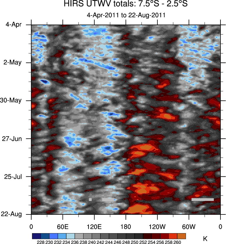 To identify tropical waves in near real-time, the OLR and UTWV data are filtered following Wheeler & Weickmann (2001 MWR). The daily anomalies are calculated using the first 3 harmonics of the seasonal cycle for 1979–2009. Missing values are then filled using linear interpolation in space and time. The most recent 365 days of anomalies are padded with 659 days of zeroes, and the result is filtered for each wave type.