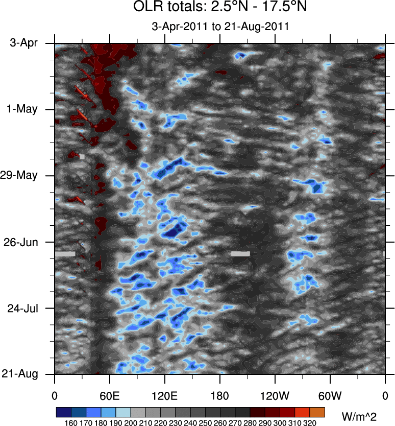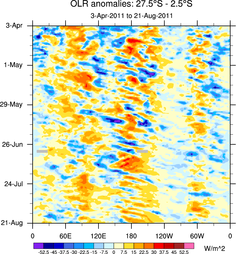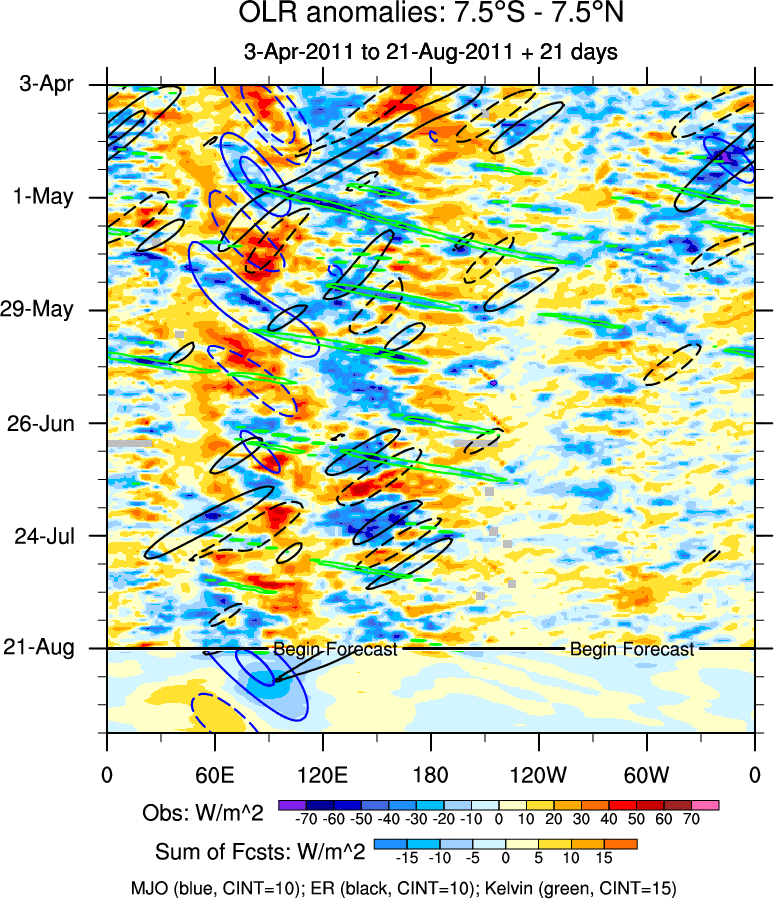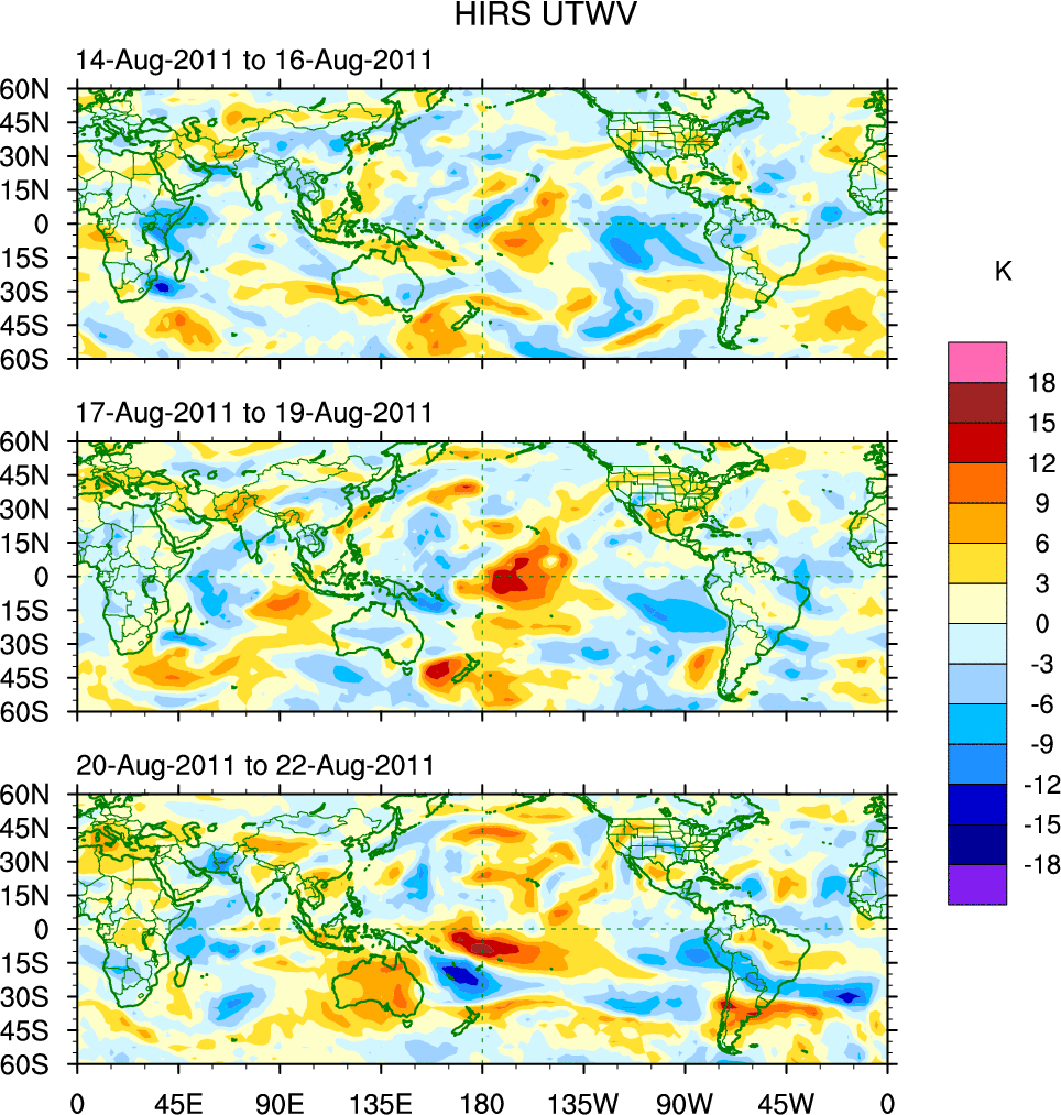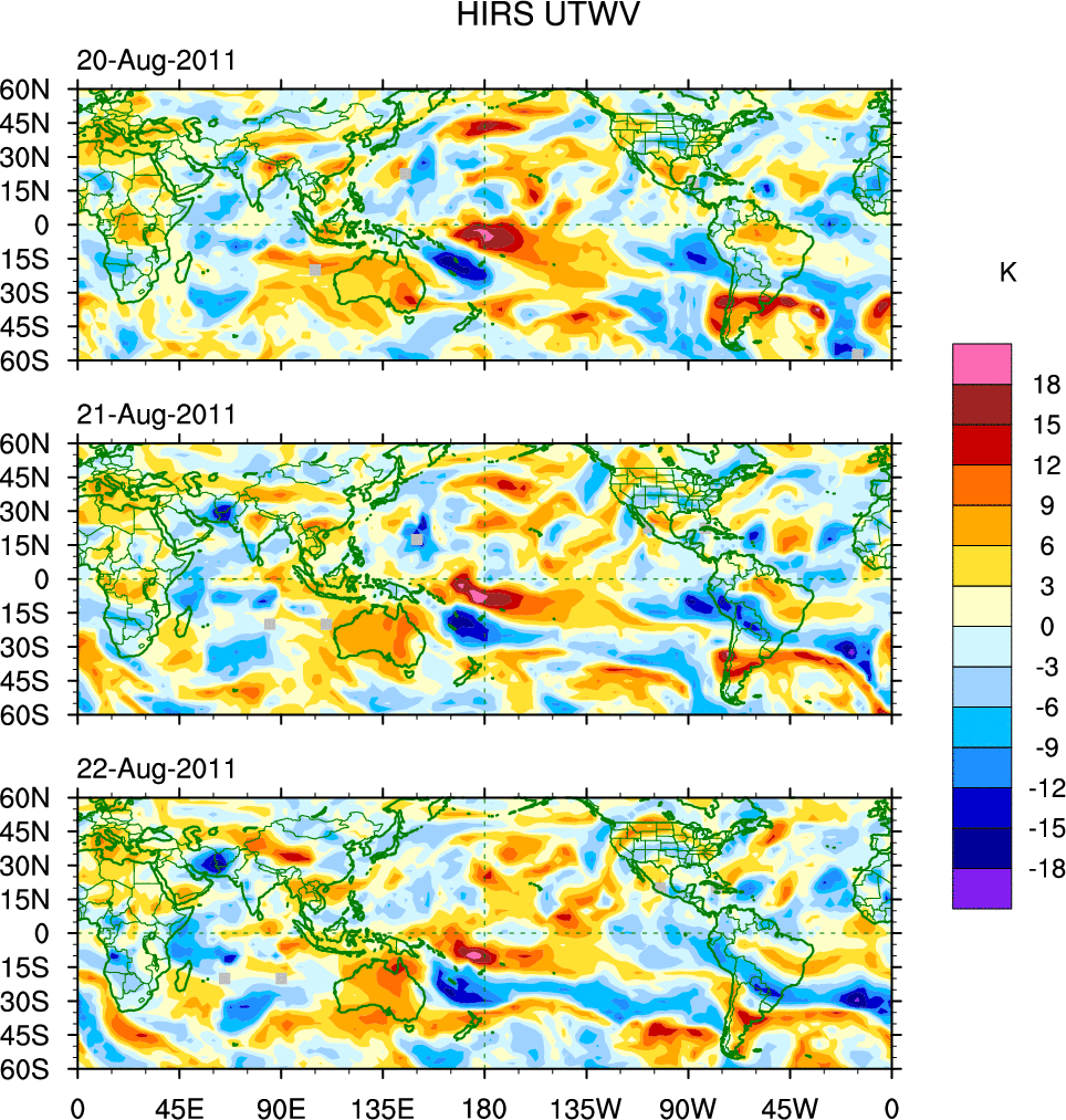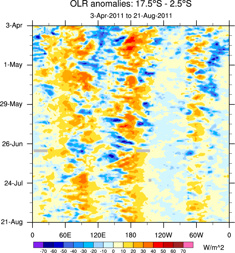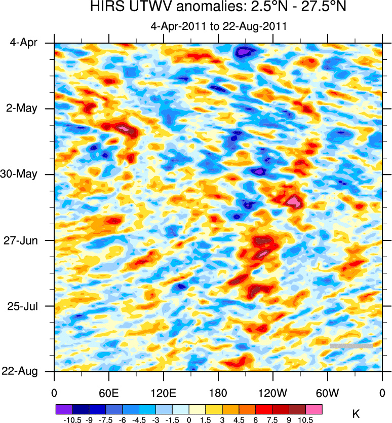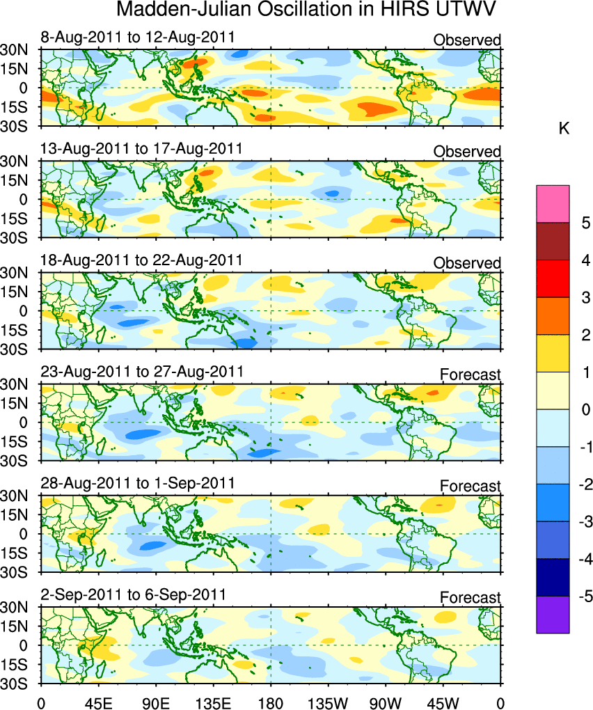 To identify tropical waves in near real-time, the OLR and UTWV data are filtered following Wheeler & Weickmann (2001 MWR). The daily anomalies are calculated using the first 3 harmonics of the seasonal cycle for 1979–2009. Missing values are then filled using linear interpolation in space and time. The most recent 365 days of anomalies are padded with 659 days of zeroes, and the result is filtered for each wave type.
