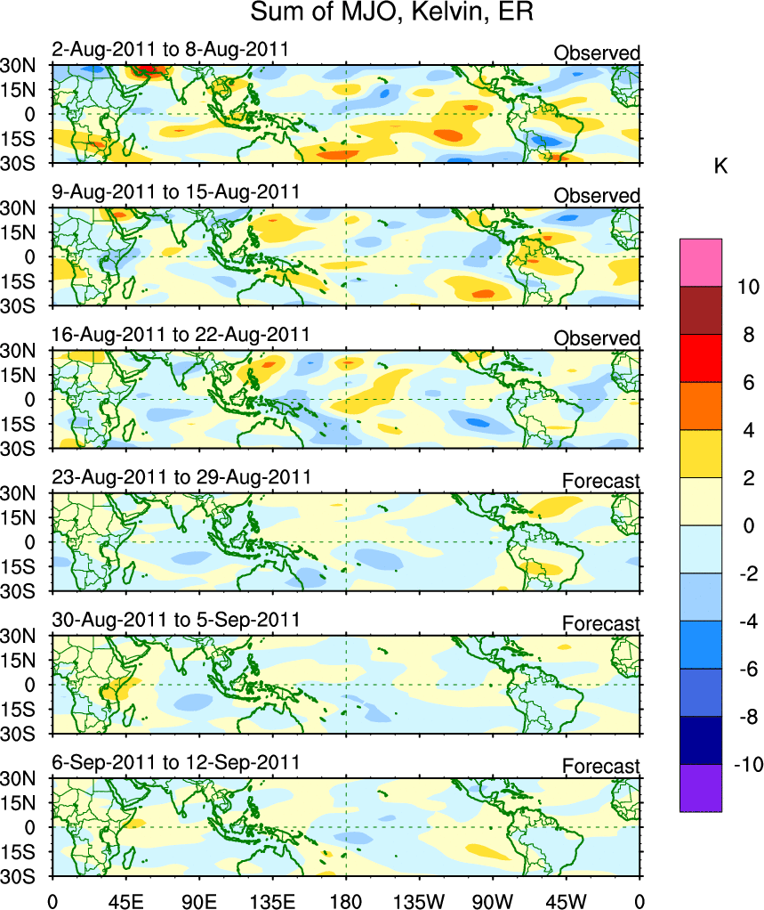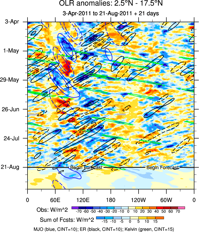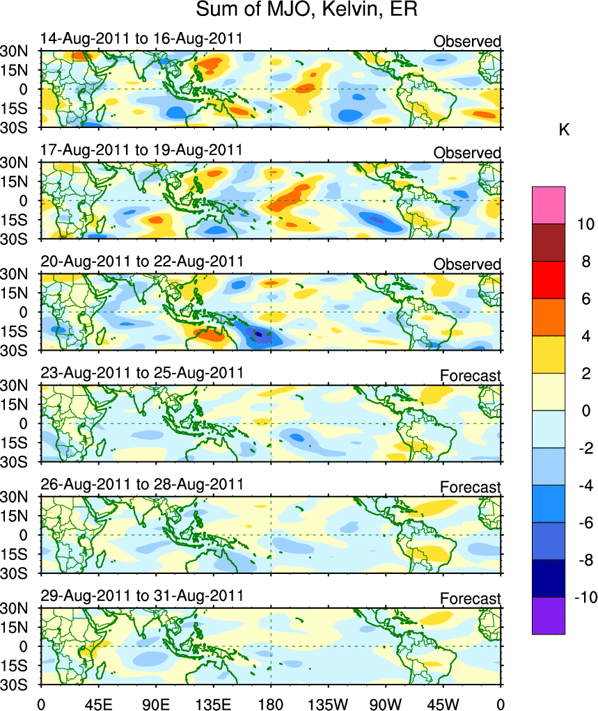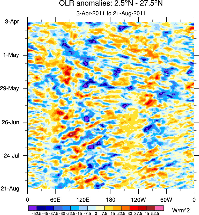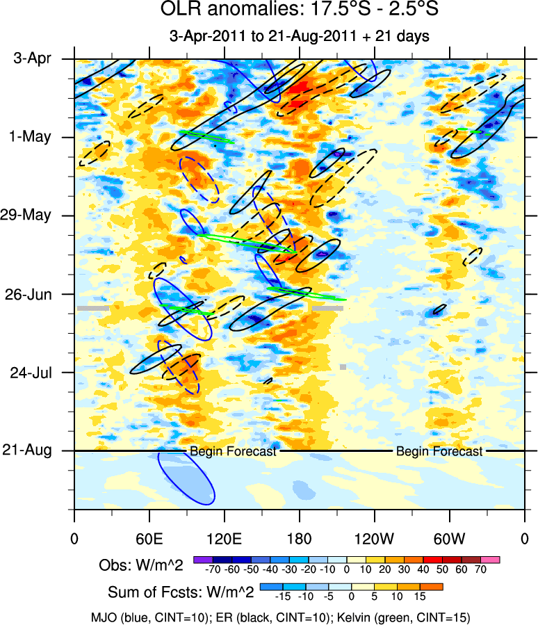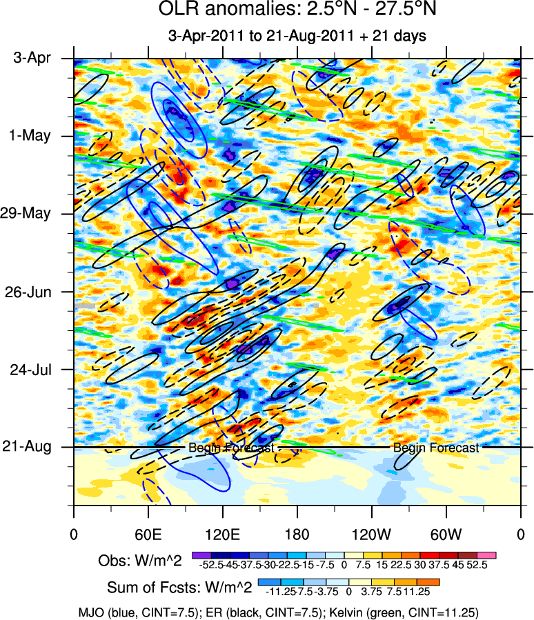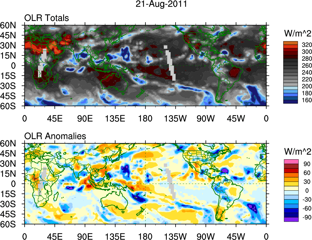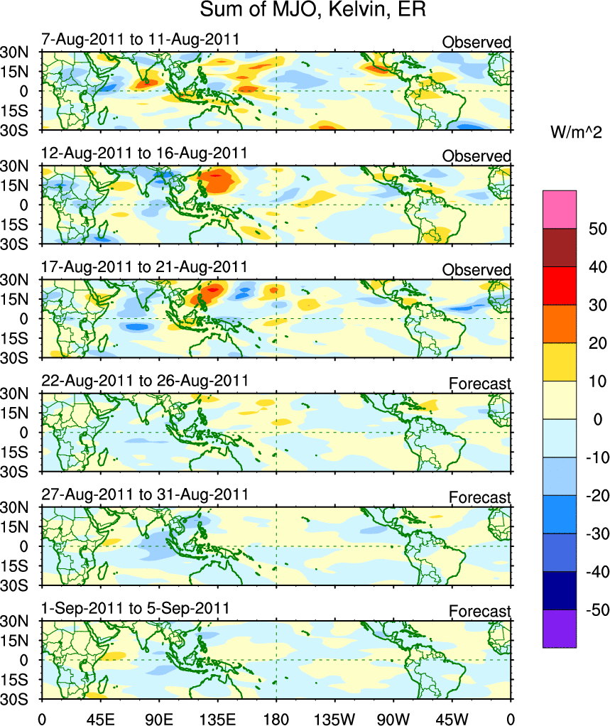 To identify tropical waves in near real-time, the OLR and UTWV data are filtered following Wheeler & Weickmann (2001 MWR). The daily anomalies are calculated using the first 3 harmonics of the seasonal cycle for 1979–2009. Missing values are then filled using linear interpolation in space and time. The most recent 365 days of anomalies are padded with 659 days of zeroes, and the result is filtered for each wave type.