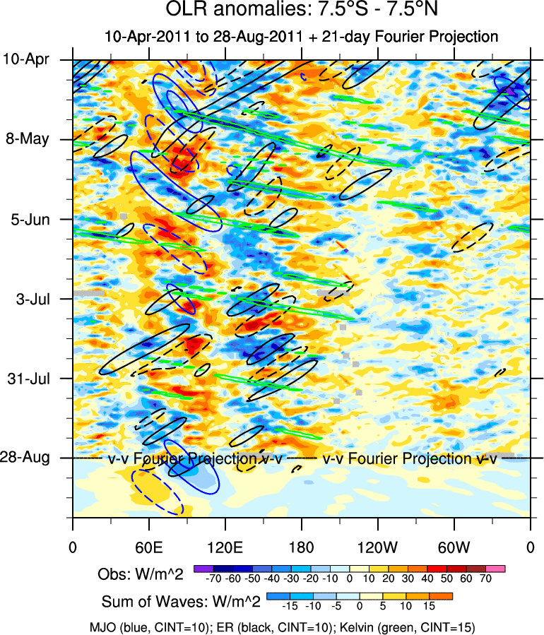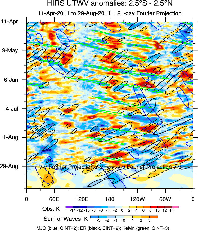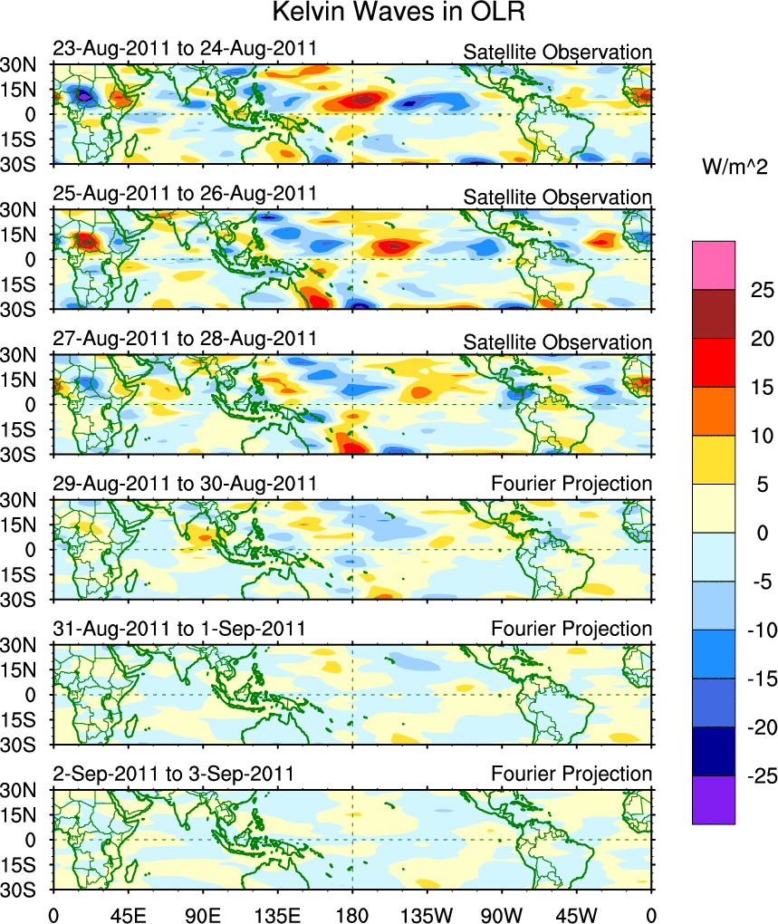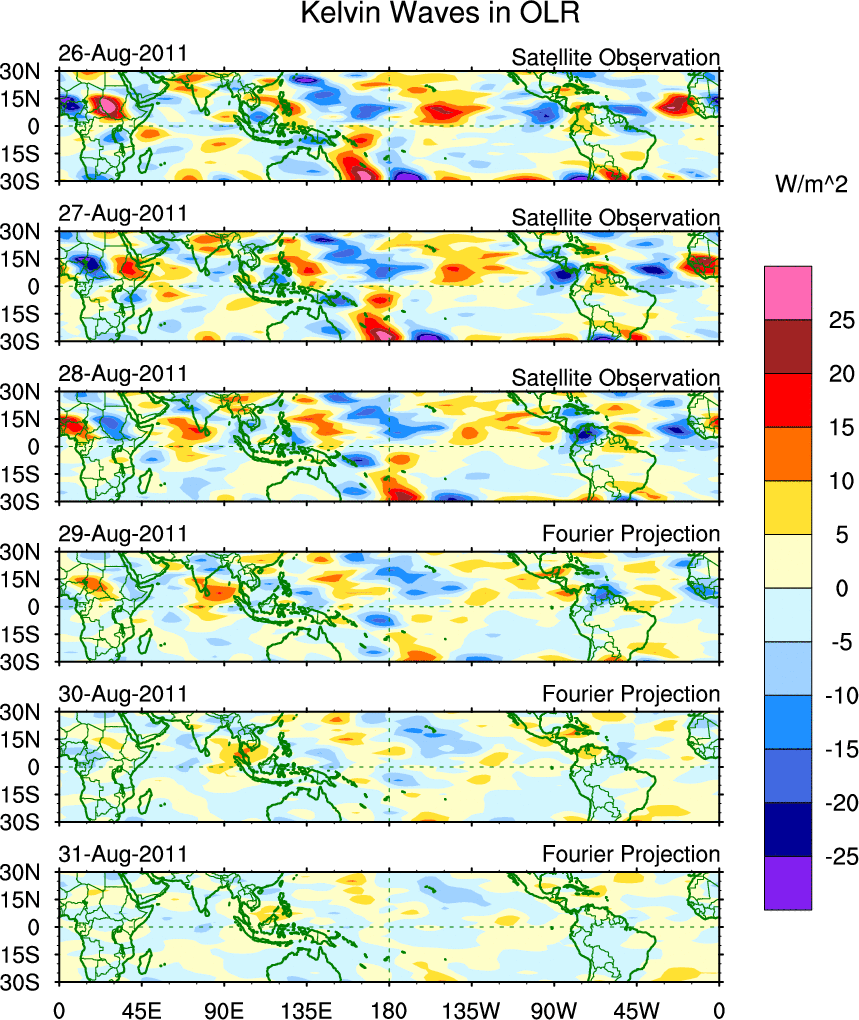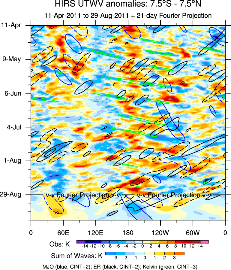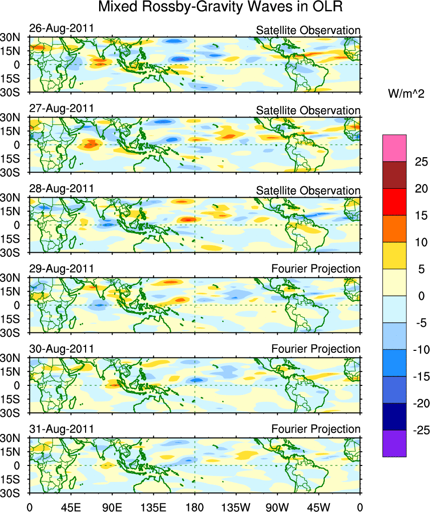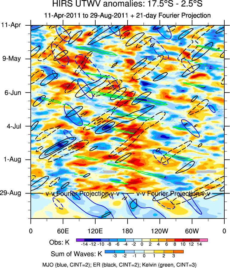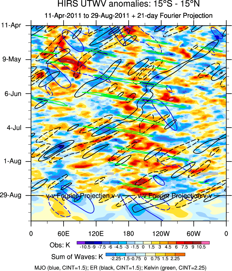 To identify tropical waves in near real-time, the OLR and UTWV data are filtered following Wheeler & Weickmann (2001 MWR). The daily anomalies are calculated using the first 3 harmonics of the seasonal cycle for 1979–2009. Missing values are then filled using linear interpolation in space and time. The most recent 365 days of anomalies are padded with 659 days of zeroes, and the result is filtered for each wave type.