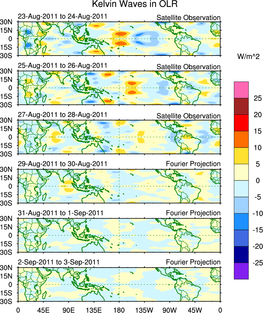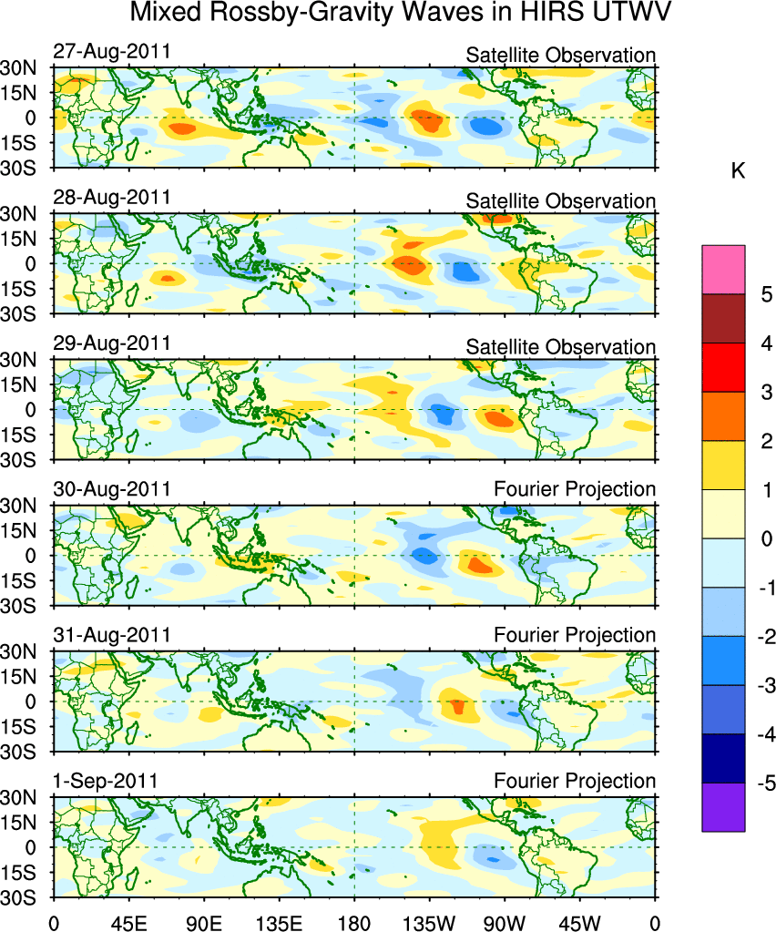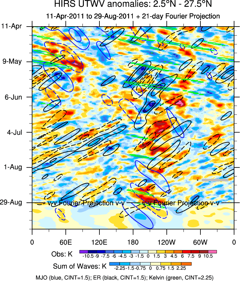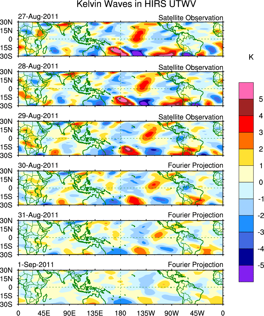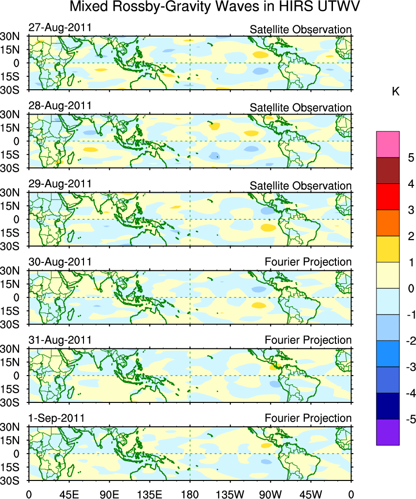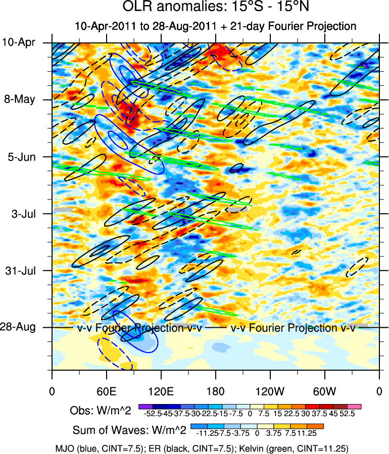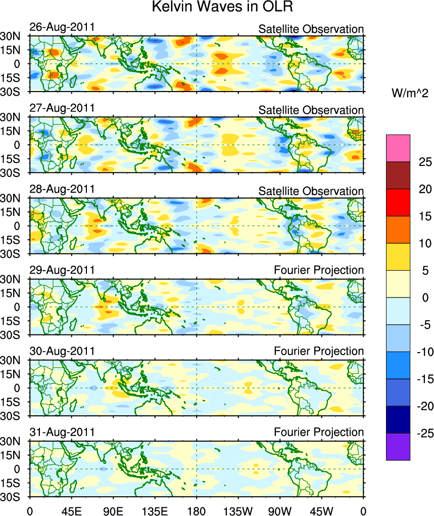To identify tropical waves in near real-time, the OLR and UTWV data are filtered following Wheeler & Weickmann (2001 MWR). The daily anomalies are calculated using the first 3 harmonics of the seasonal cycle for 1979–2009. Missing values are then filled using linear interpolation in space and time. The most recent 365 days of anomalies are padded with 659 days of zeroes, and the result is filtered for each wave type.