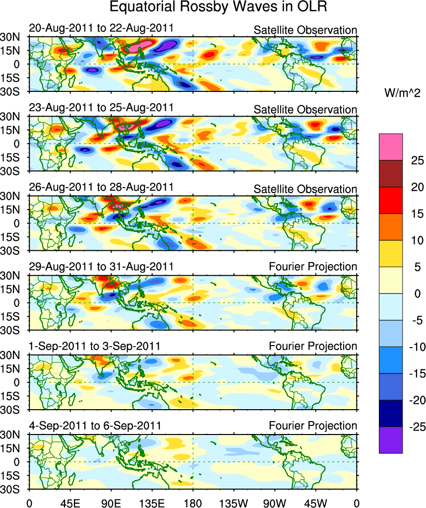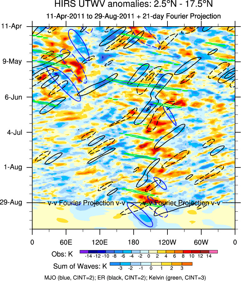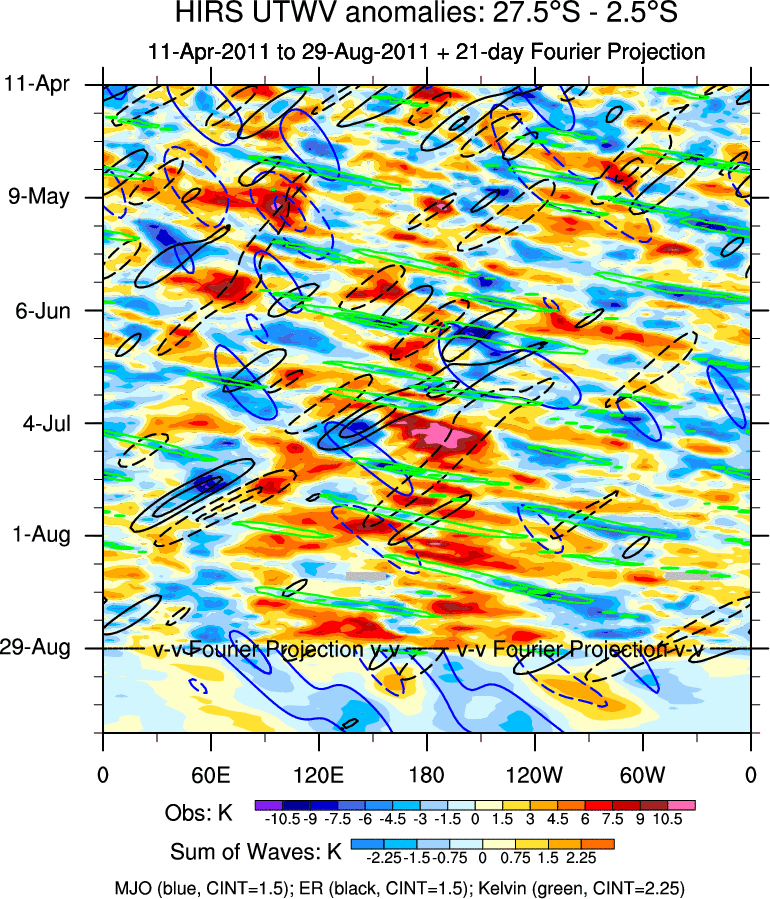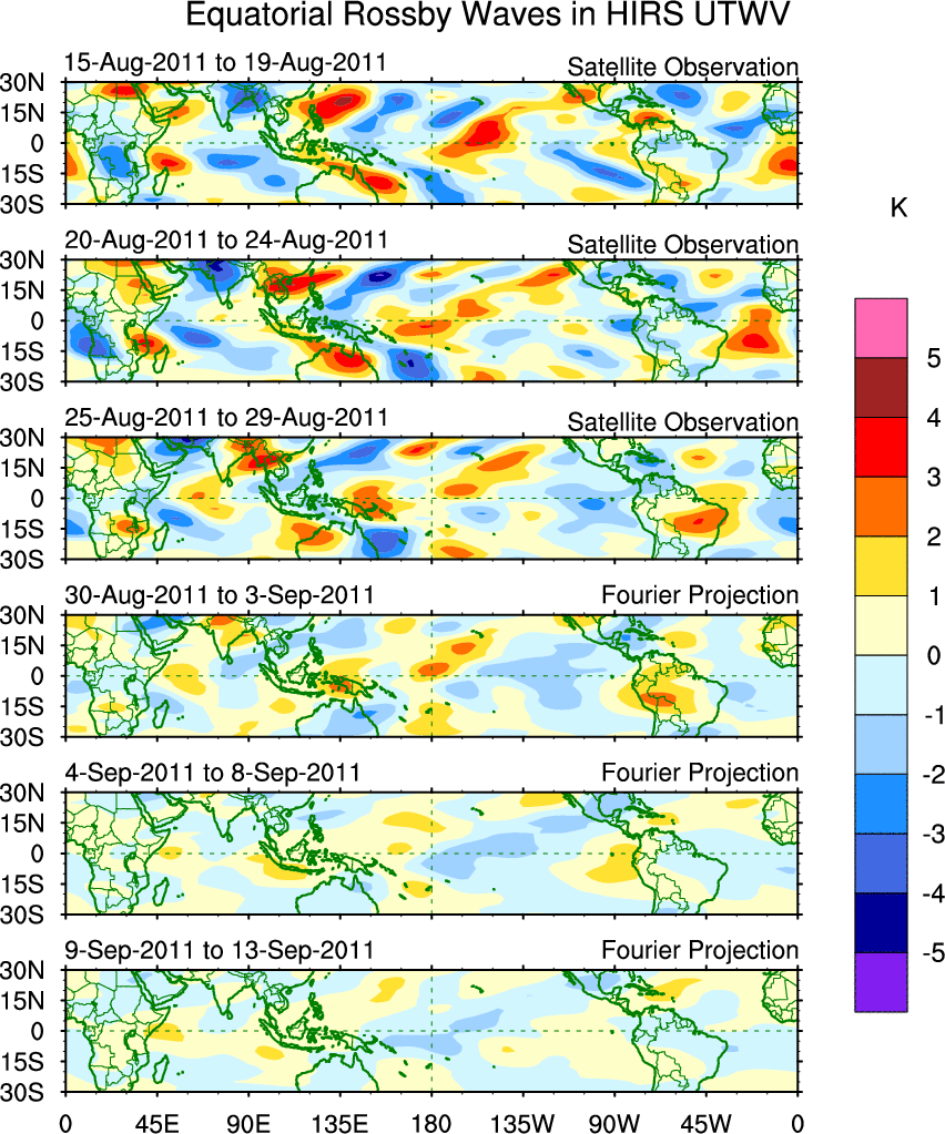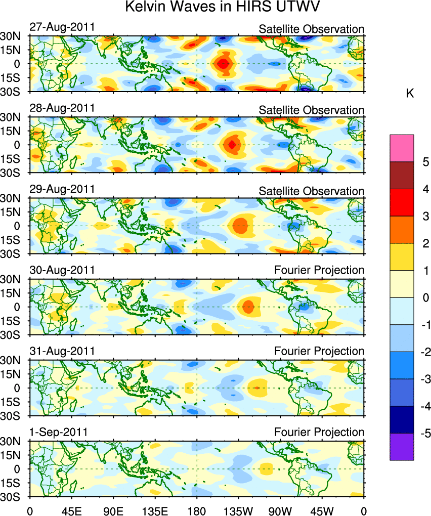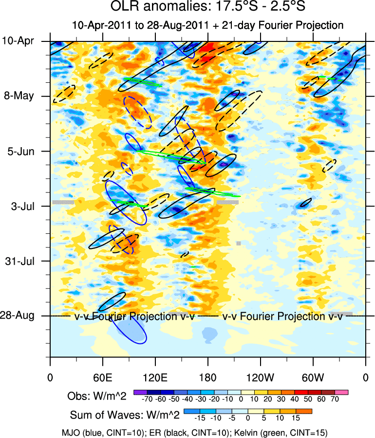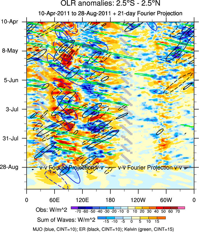 To identify tropical waves in near real-time, the OLR and UTWV data are filtered following Wheeler & Weickmann (2001 MWR). The daily anomalies are calculated using the first 3 harmonics of the seasonal cycle for 1979–2009. Missing values are then filled using linear interpolation in space and time. The most recent 365 days of anomalies are padded with 659 days of zeroes, and the result is filtered for each wave type.