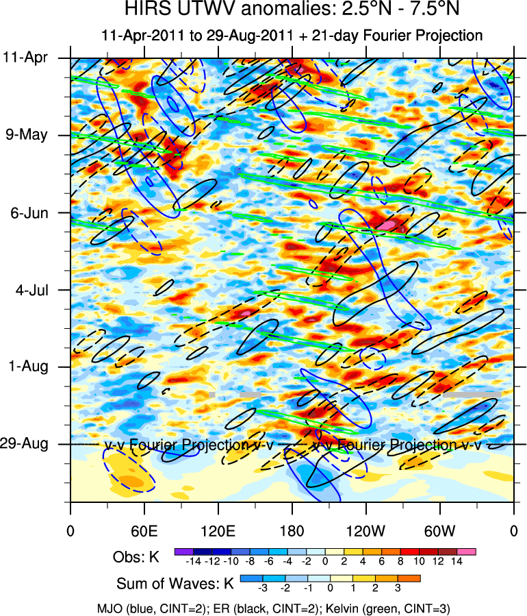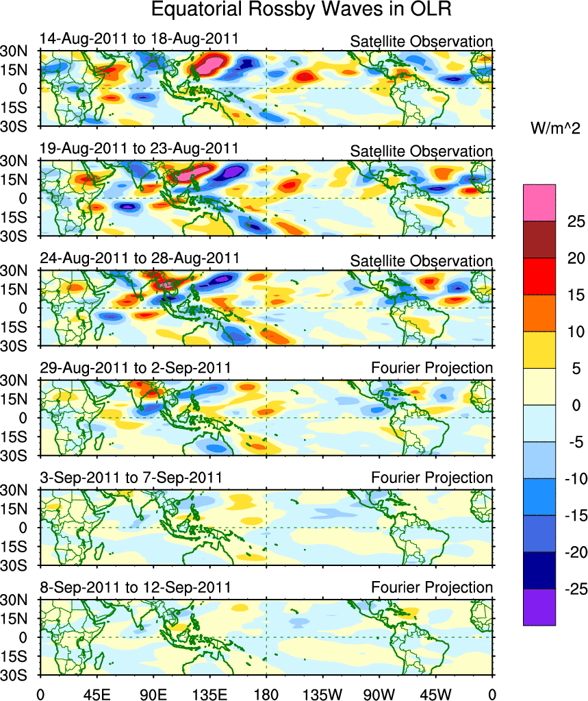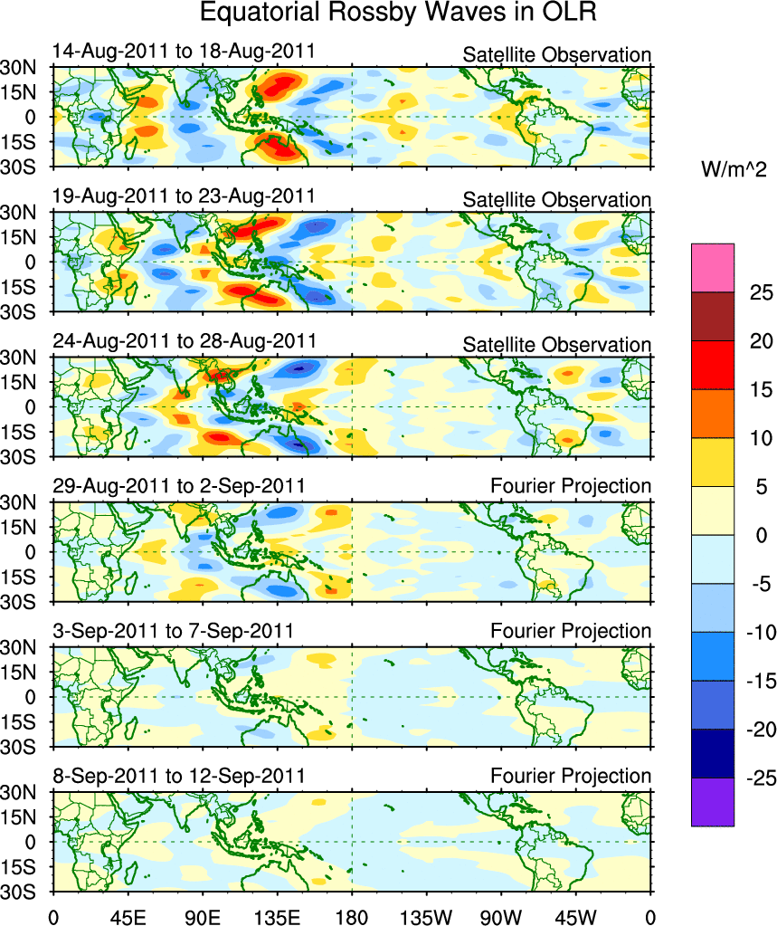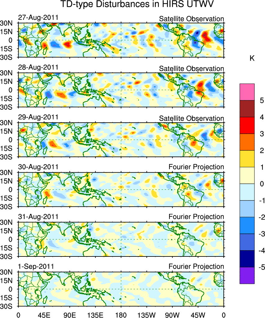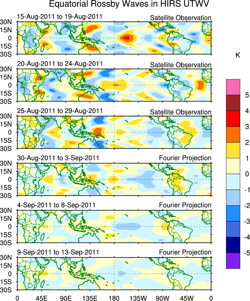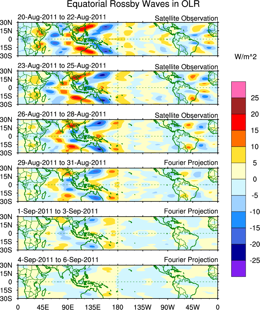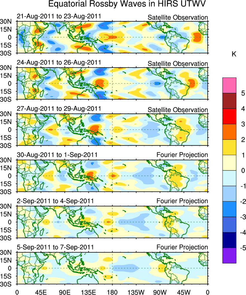 To identify tropical waves in near real-time, the OLR and UTWV data are filtered following Wheeler & Weickmann (2001 MWR). The daily anomalies are calculated using the first 3 harmonics of the seasonal cycle for 1979–2009. Missing values are then filled using linear interpolation in space and time. The most recent 365 days of anomalies are padded with 659 days of zeroes, and the result is filtered for each wave type.