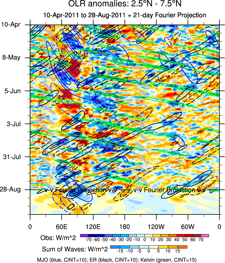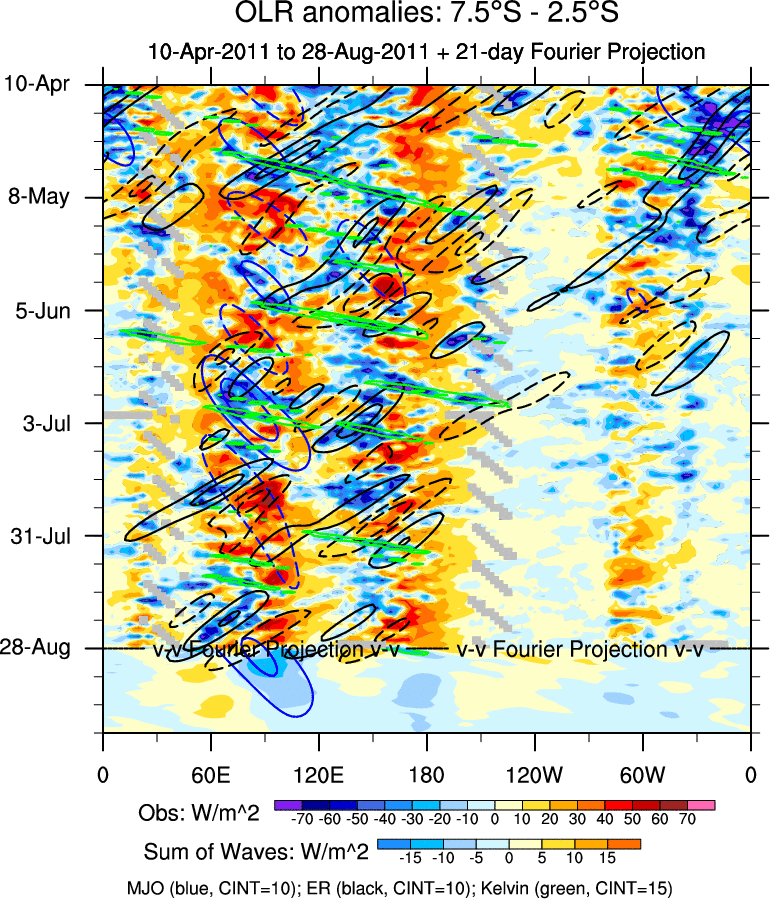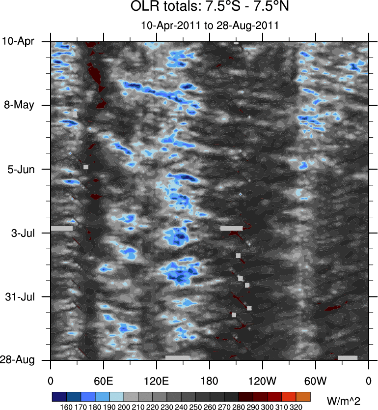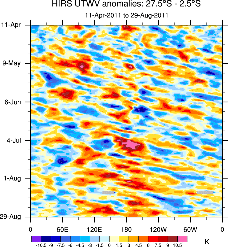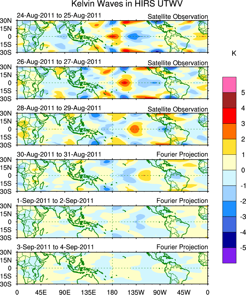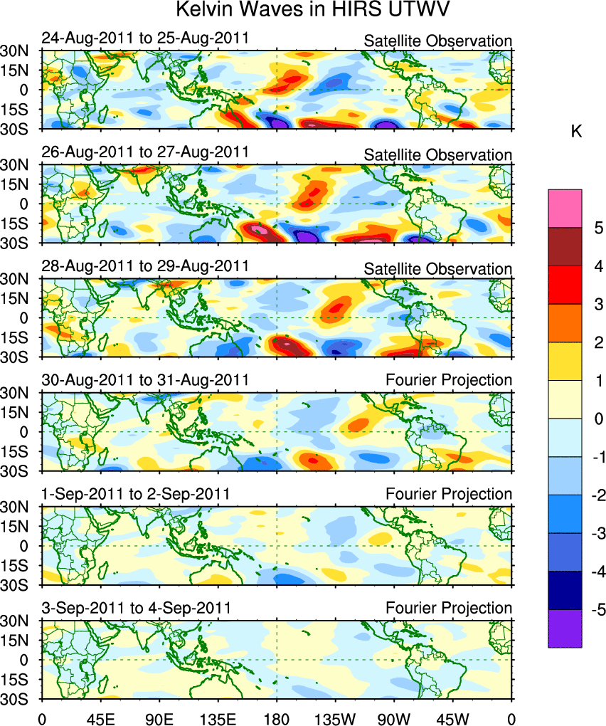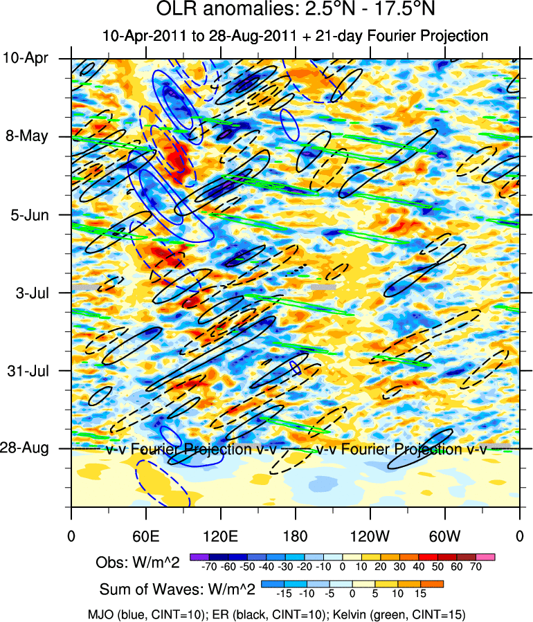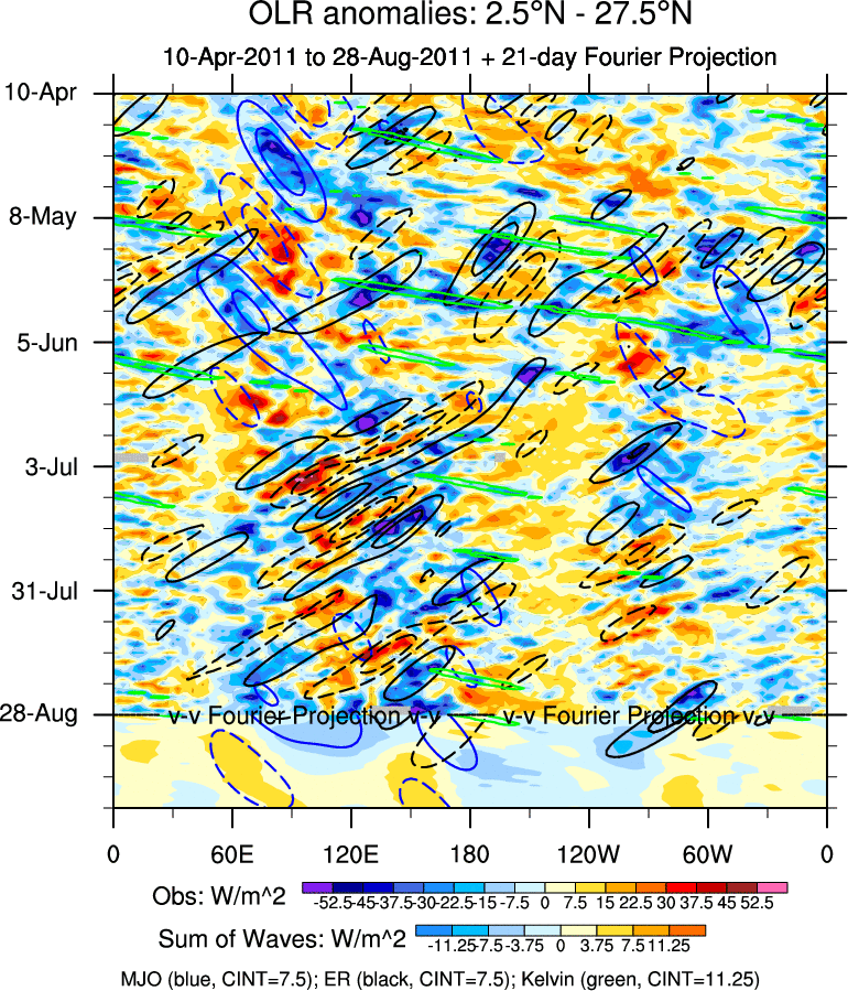 To identify tropical waves in near real-time, the OLR and UTWV data are filtered following Wheeler & Weickmann (2001 MWR). The daily anomalies are calculated using the first 3 harmonics of the seasonal cycle for 1979–2009. Missing values are then filled using linear interpolation in space and time. The most recent 365 days of anomalies are padded with 659 days of zeroes, and the result is filtered for each wave type.