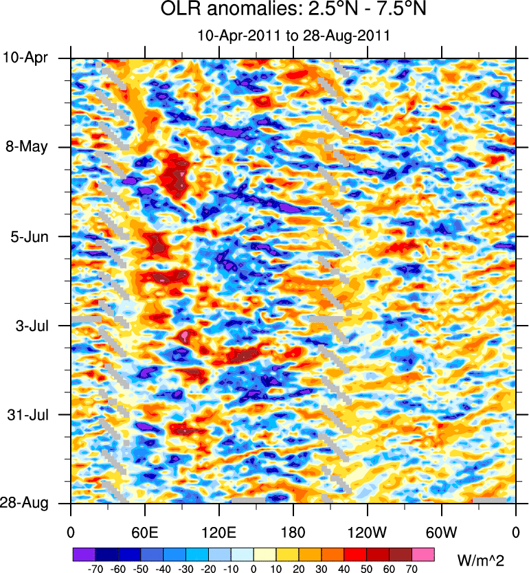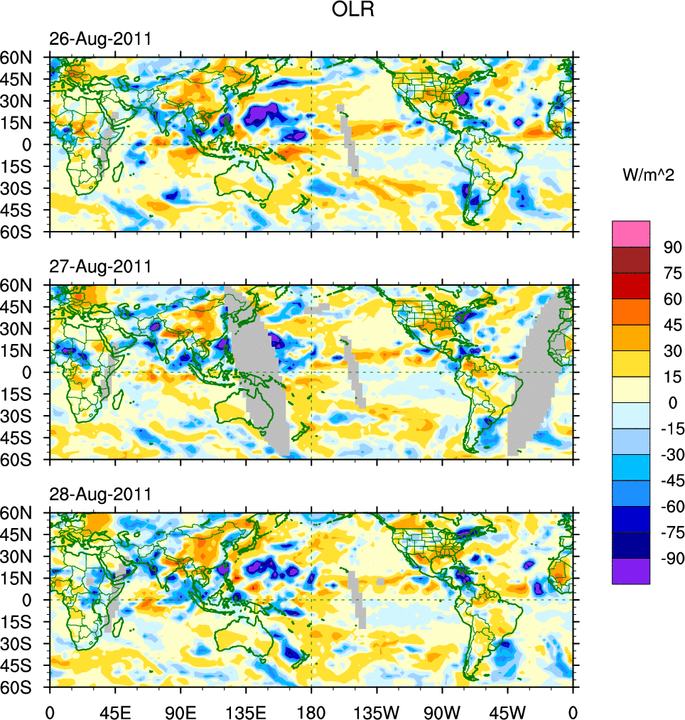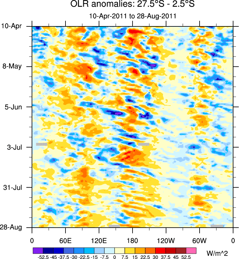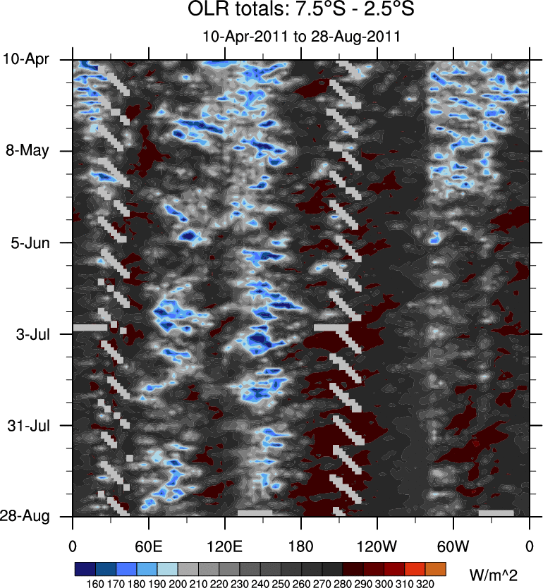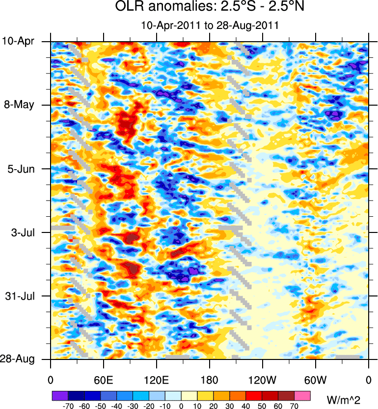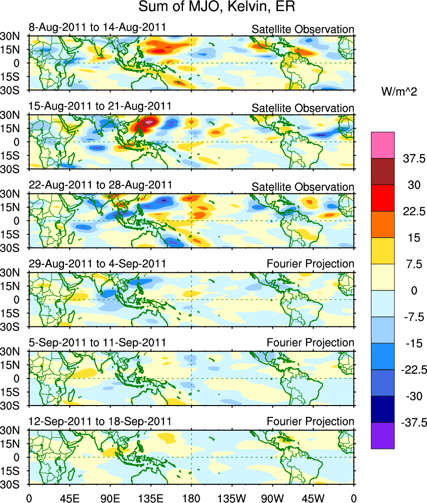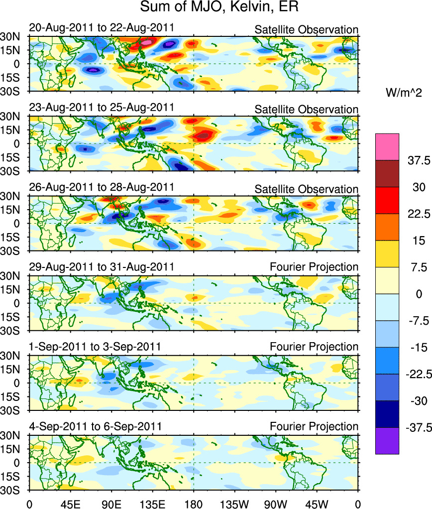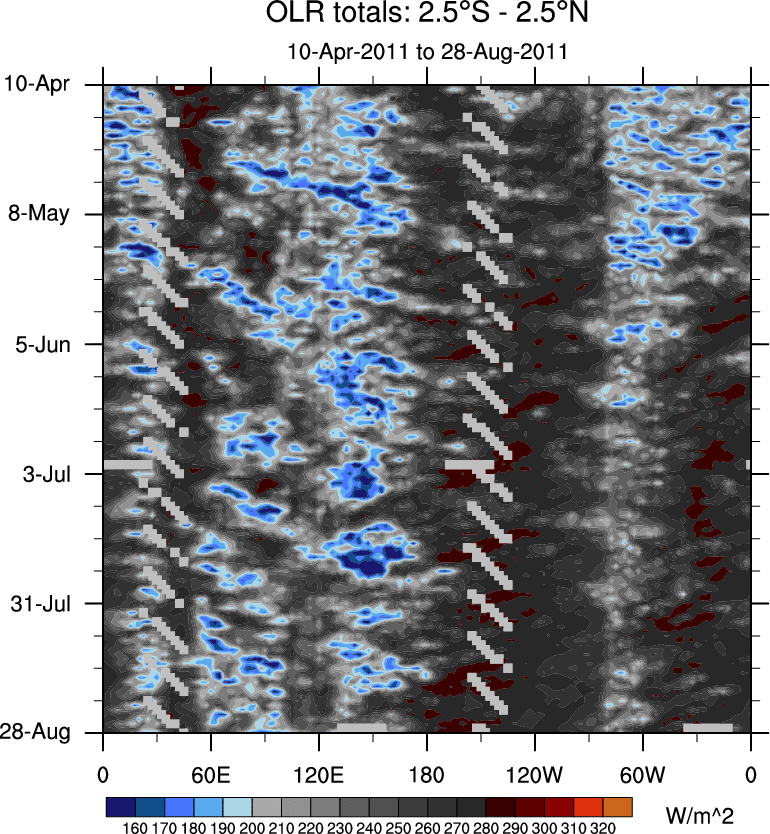 To identify tropical waves in near real-time, the OLR and UTWV data are filtered following Wheeler & Weickmann (2001 MWR). The daily anomalies are calculated using the first 3 harmonics of the seasonal cycle for 1979–2009. Missing values are then filled using linear interpolation in space and time. The most recent 365 days of anomalies are padded with 659 days of zeroes, and the result is filtered for each wave type.