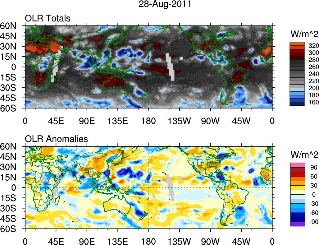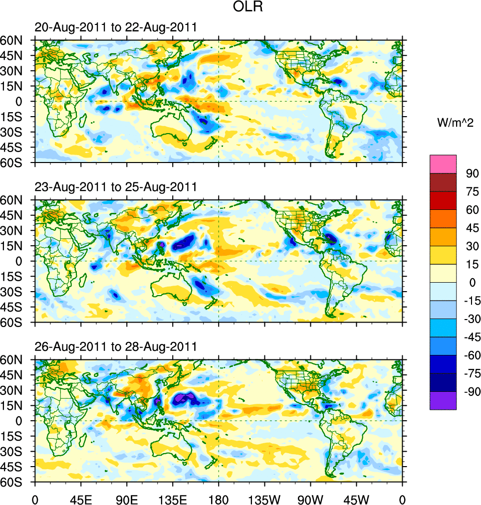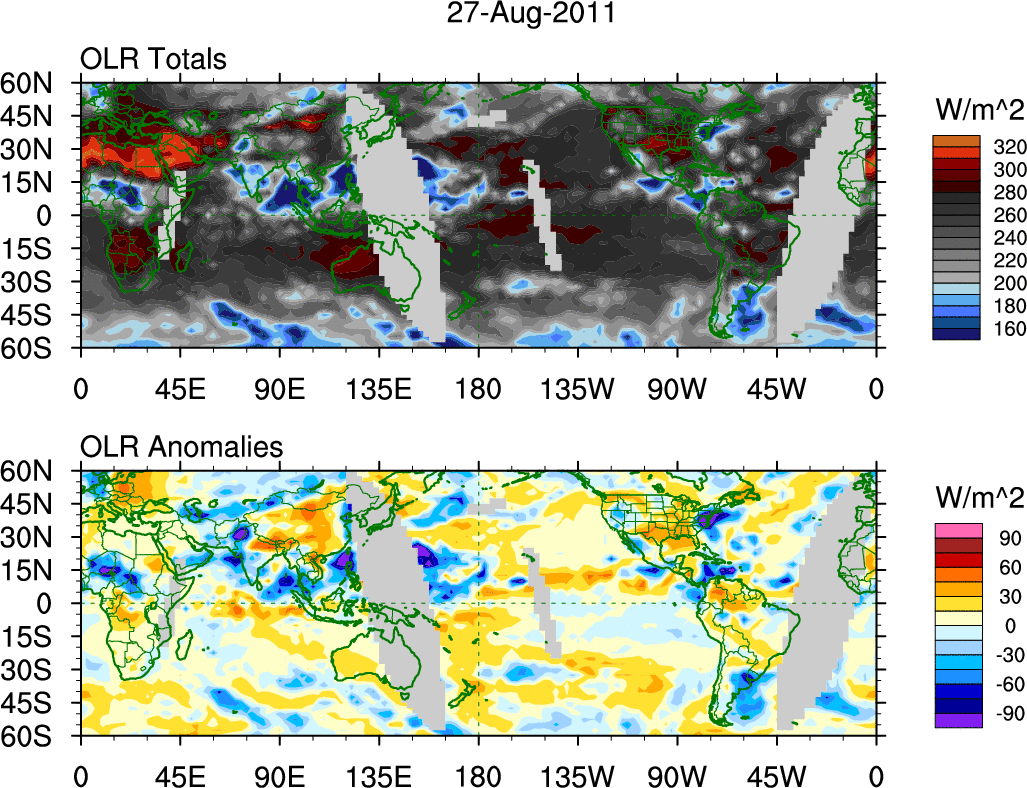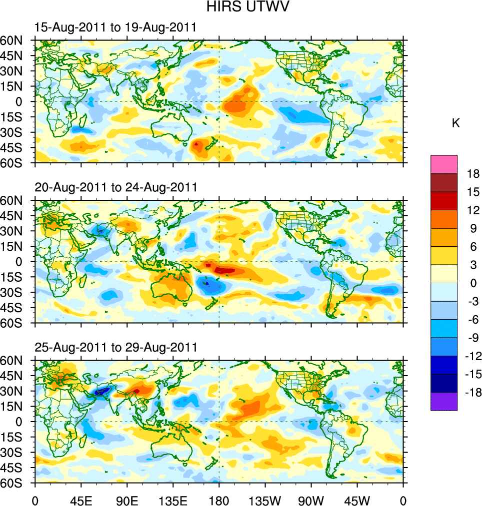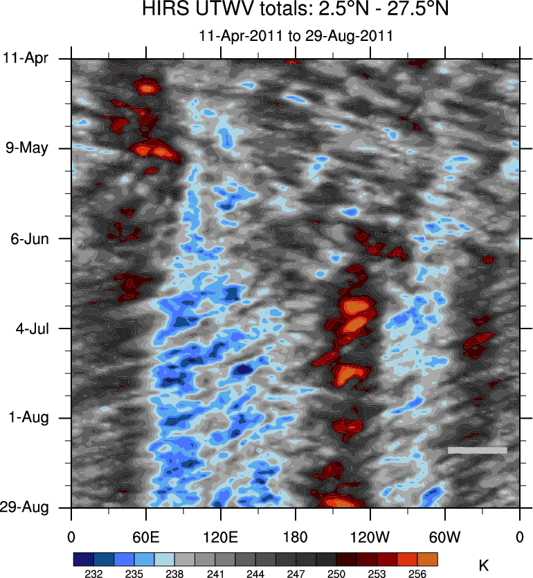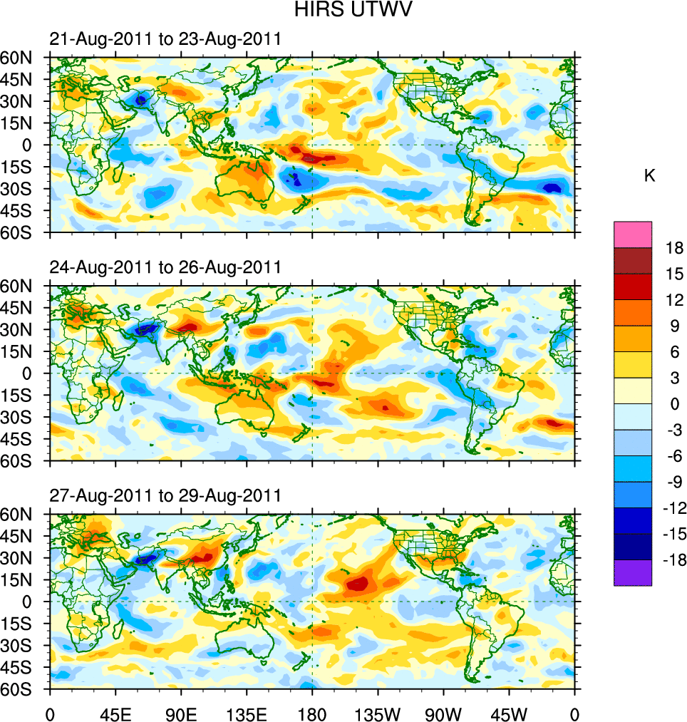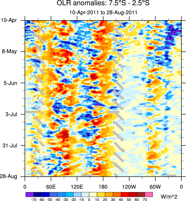 To identify tropical waves in near real-time, the OLR and UTWV data are filtered following Wheeler & Weickmann (2001 MWR). The daily anomalies are calculated using the first 3 harmonics of the seasonal cycle for 1979–2009. Missing values are then filled using linear interpolation in space and time. The most recent 365 days of anomalies are padded with 659 days of zeroes, and the result is filtered for each wave type.