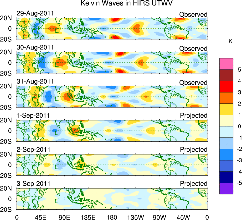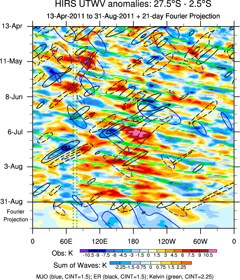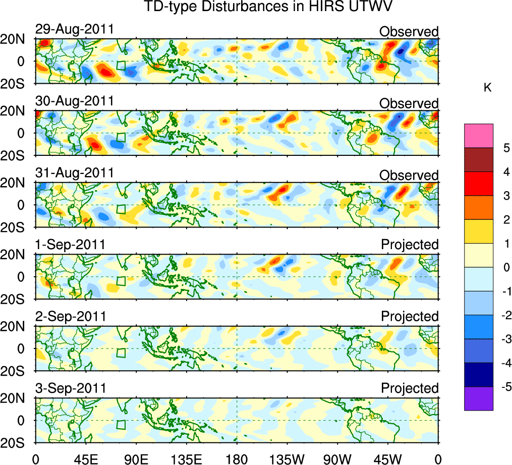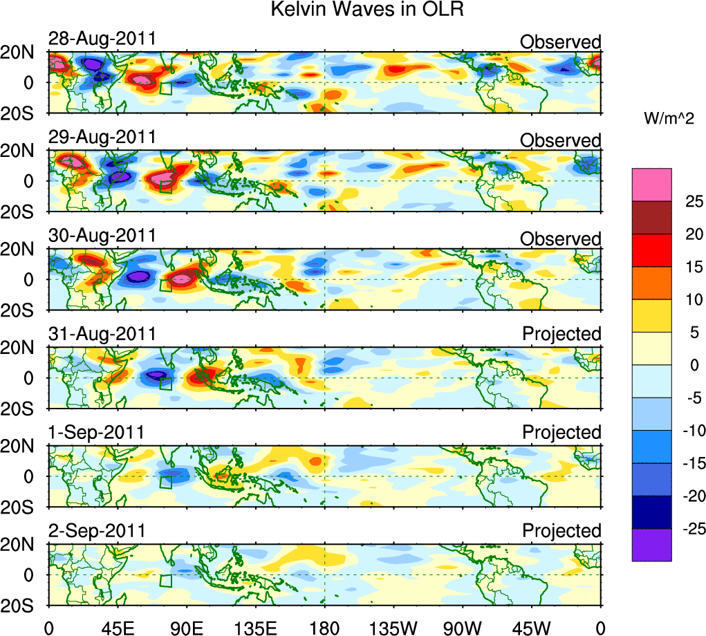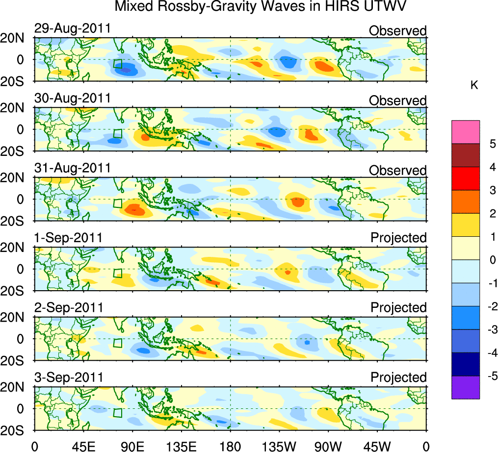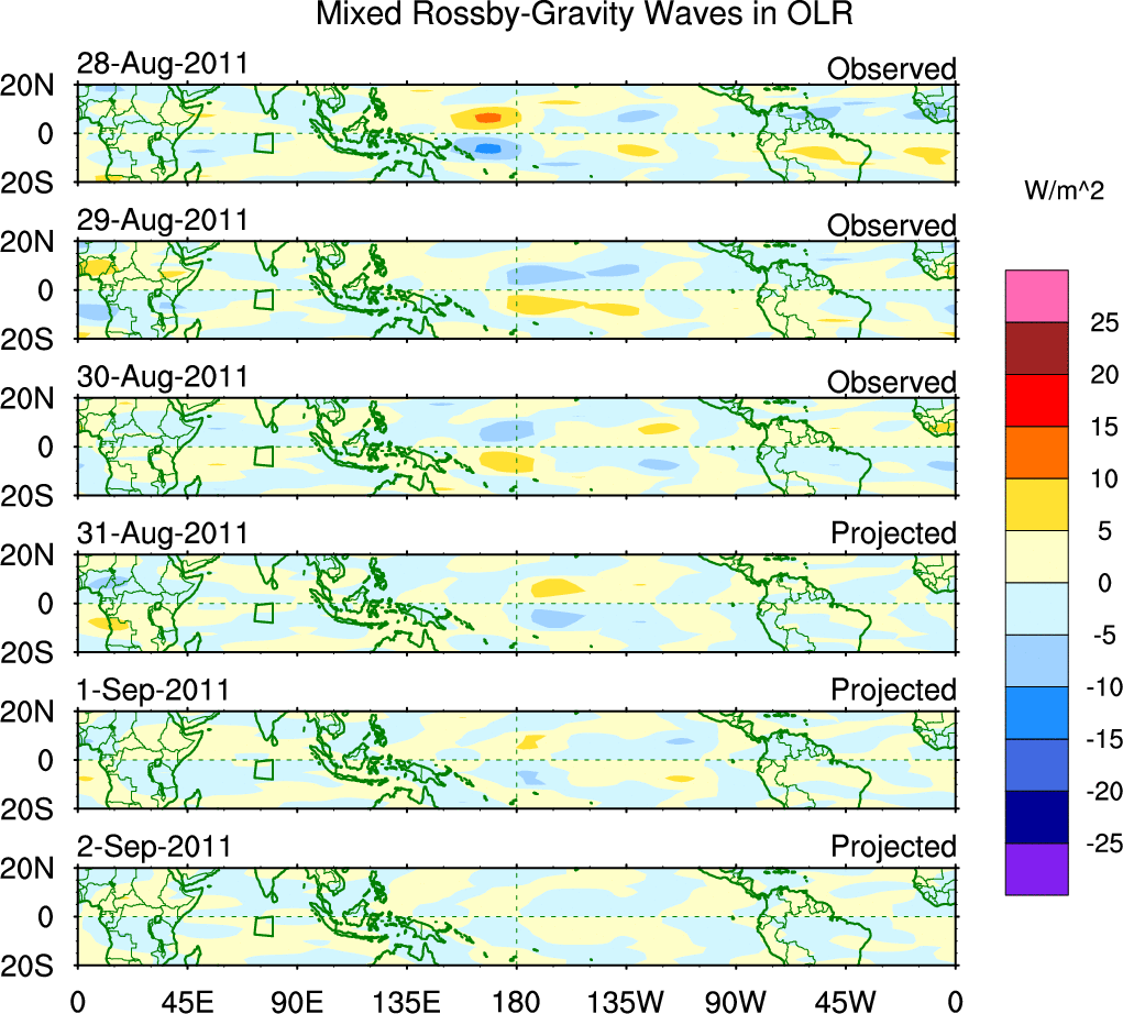 To identify tropical waves in near real-time, the OLR and UTWV data are filtered following Wheeler & Weickmann (2001 MWR). The daily anomalies are calculated using the first 3 harmonics of the seasonal cycle for 1979–2009. Missing values are then filled using linear interpolation in space and time. The most recent 365 days of anomalies are padded with 659 days of zeroes, and the result is filtered for each wave type.