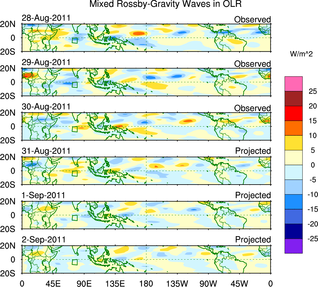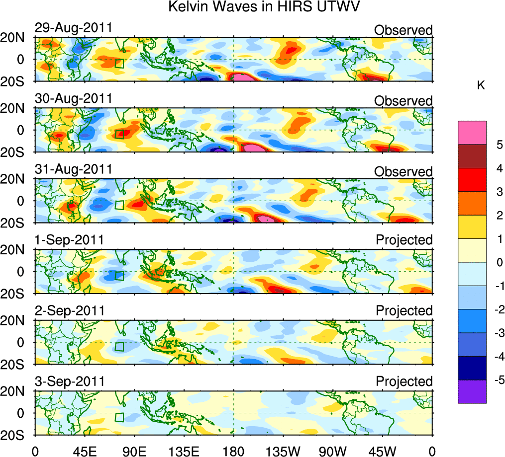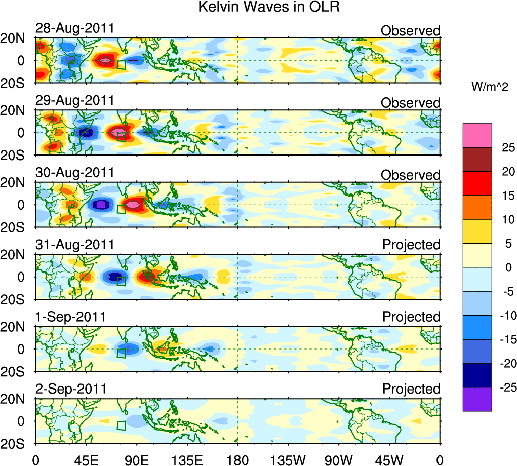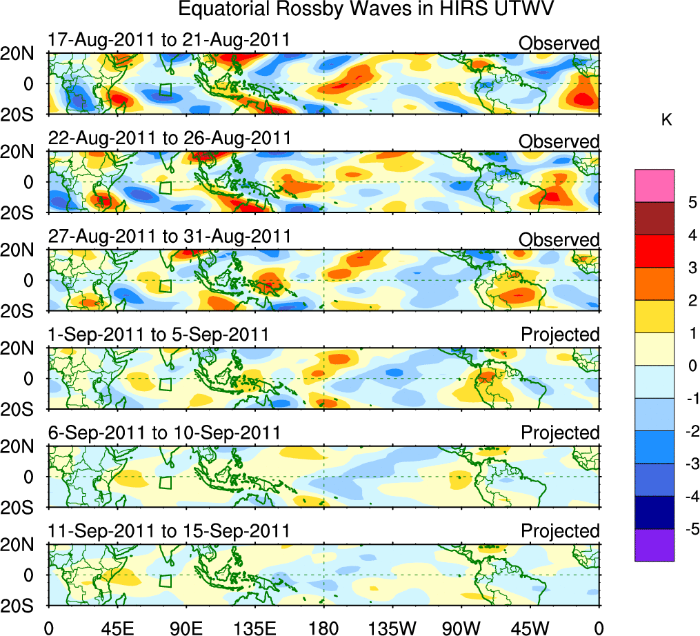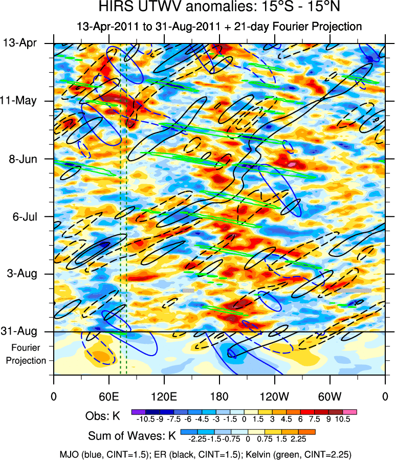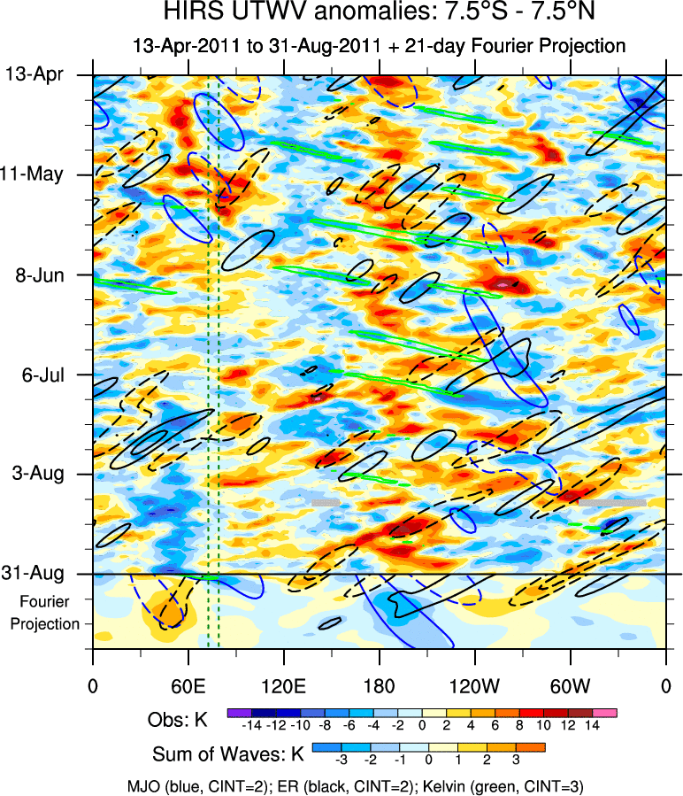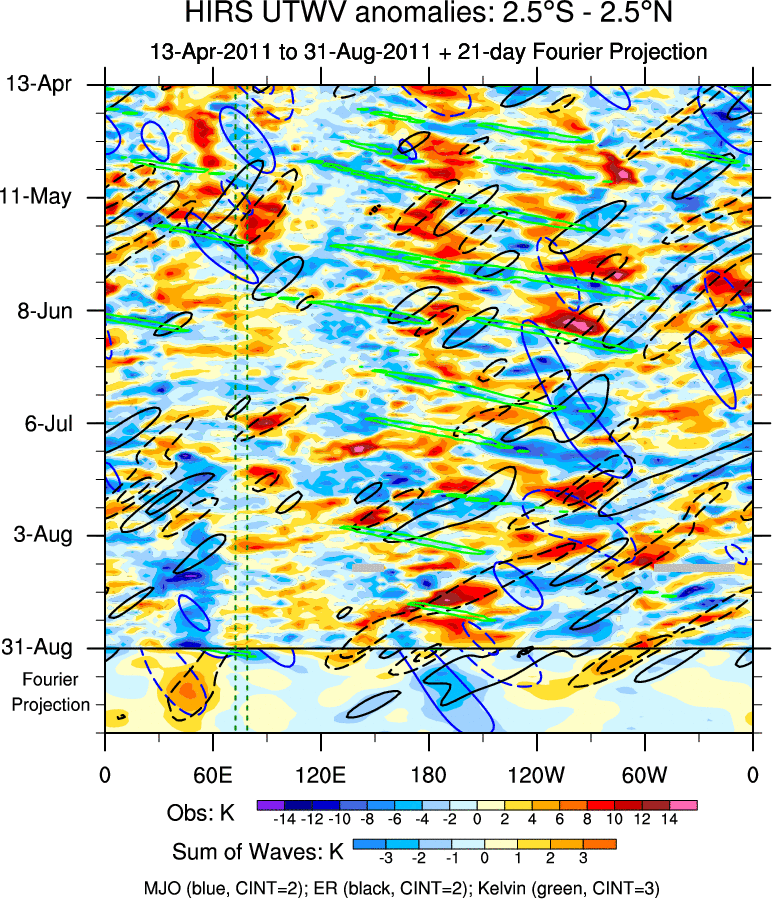 To identify tropical waves in near real-time, the OLR and UTWV data are filtered following Wheeler & Weickmann (2001 MWR). The daily anomalies are calculated using the first 3 harmonics of the seasonal cycle for 1979–2009. Missing values are then filled using linear interpolation in space and time. The most recent 365 days of anomalies are padded with 659 days of zeroes, and the result is filtered for each wave type.
