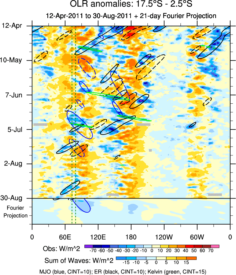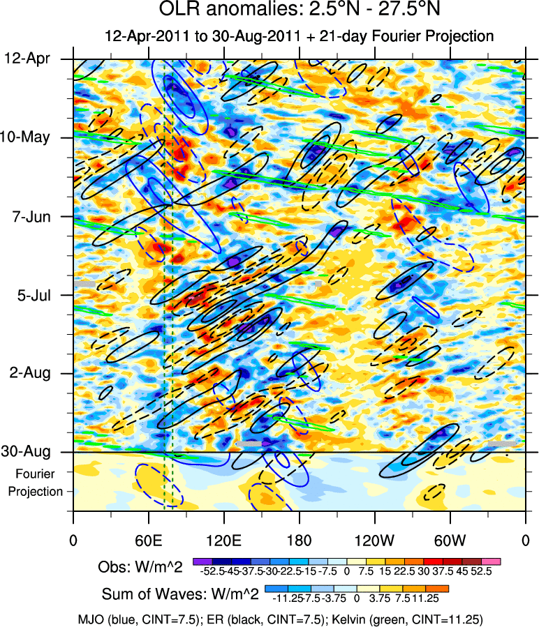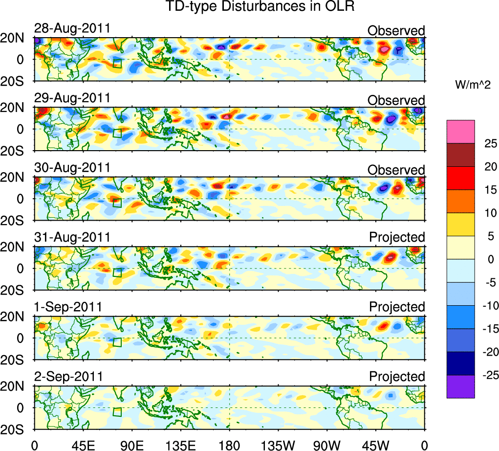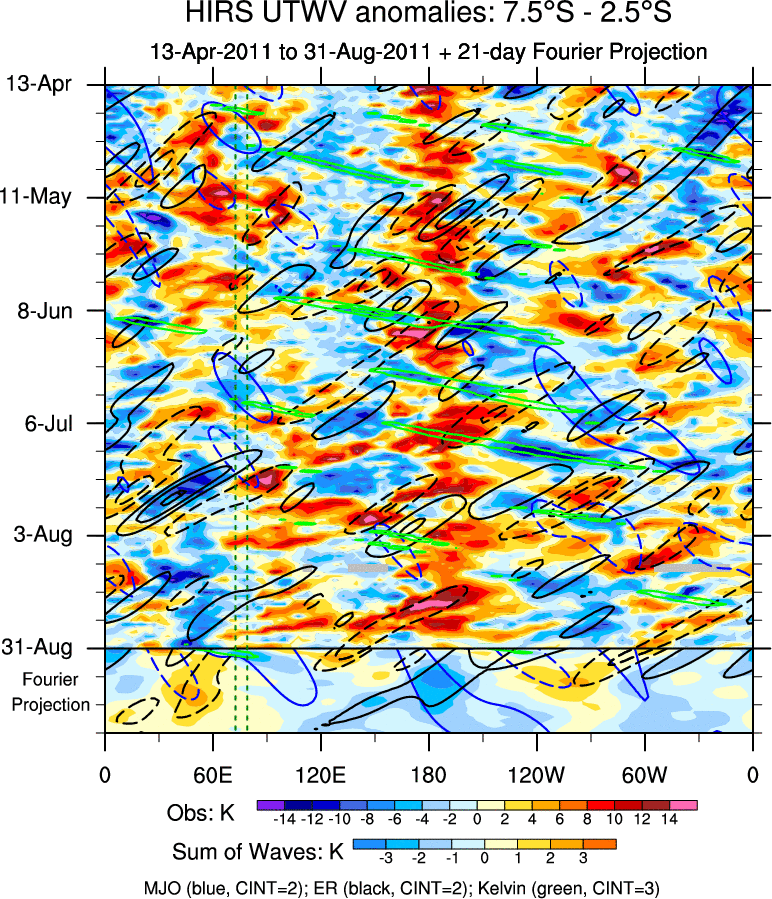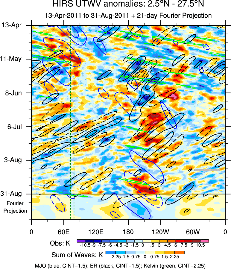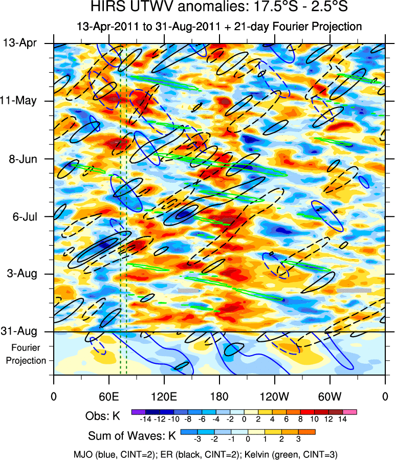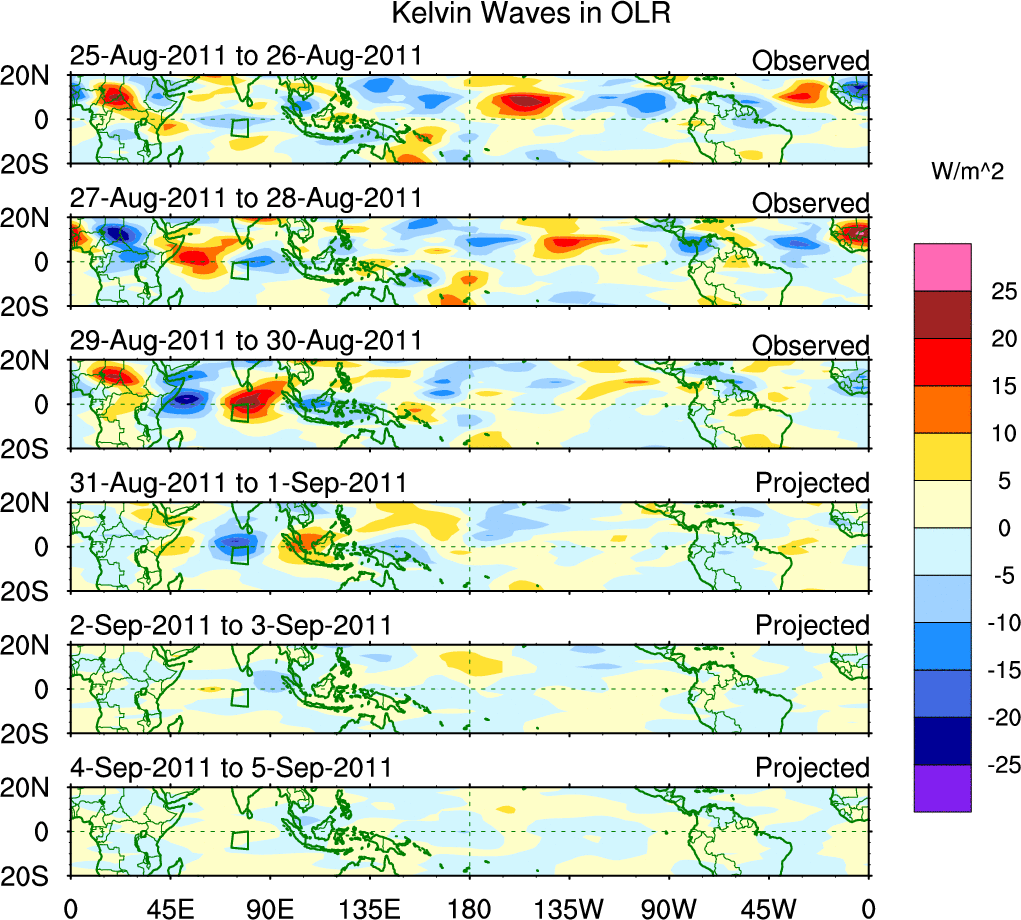 To identify tropical waves in near real-time, the OLR and UTWV data are filtered following Wheeler & Weickmann (2001 MWR). The daily anomalies are calculated using the first 3 harmonics of the seasonal cycle for 1979–2009. Missing values are then filled using linear interpolation in space and time. The most recent 365 days of anomalies are padded with 659 days of zeroes, and the result is filtered for each wave type.