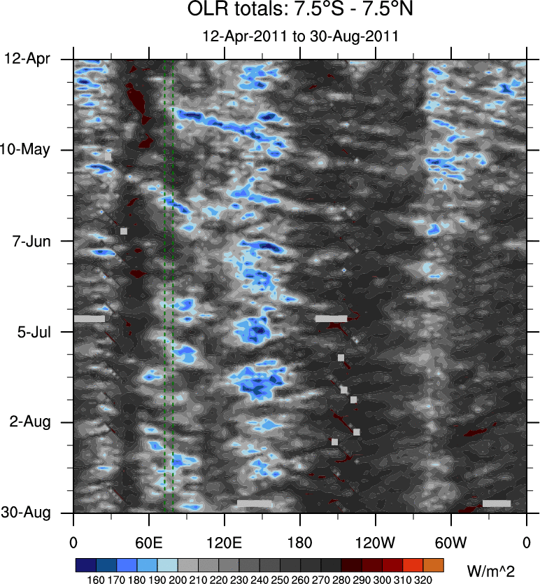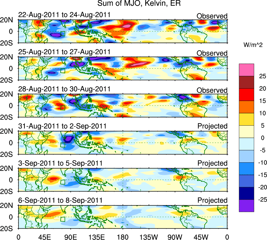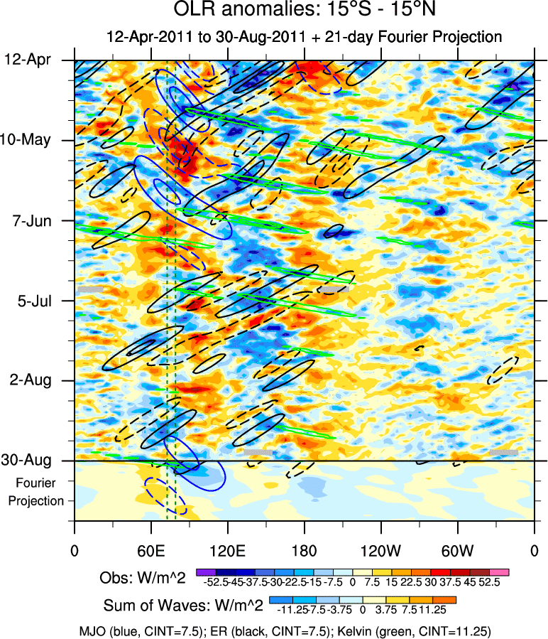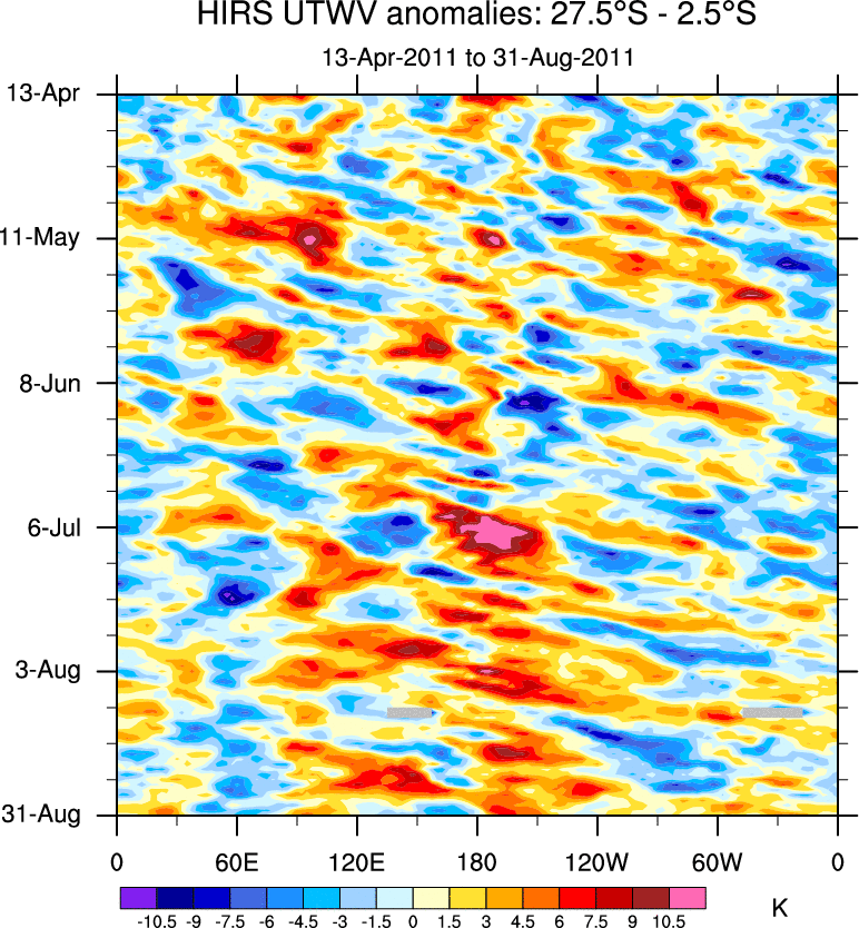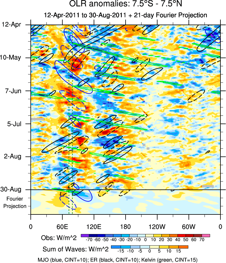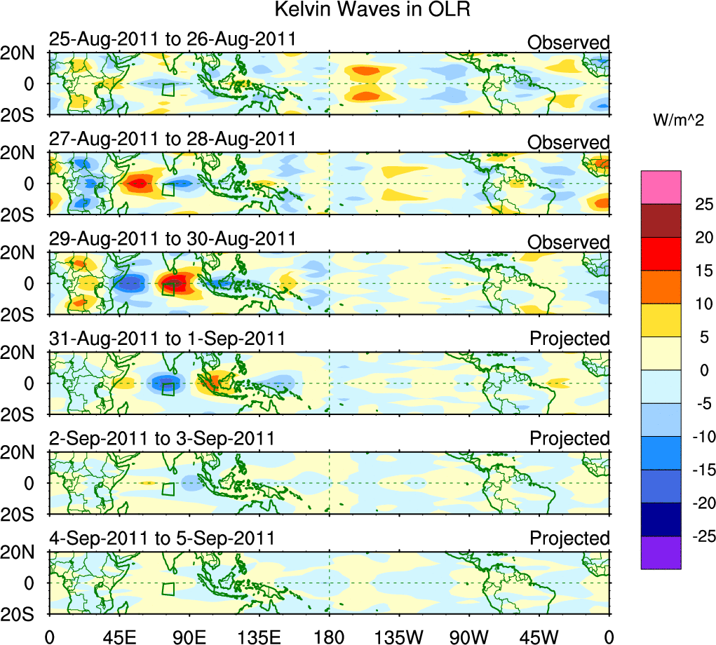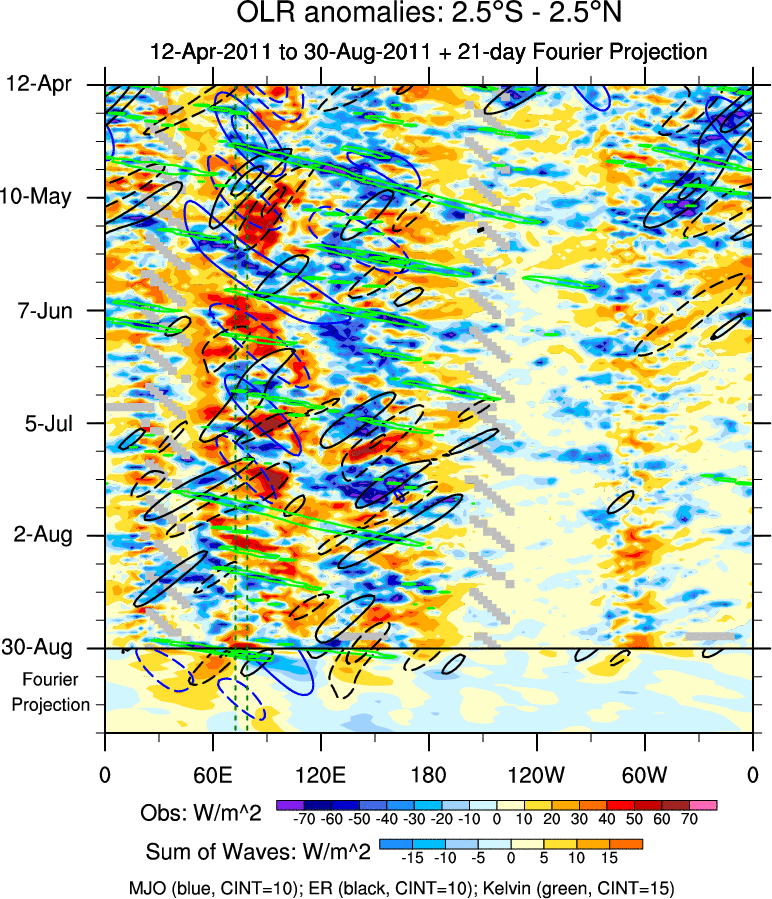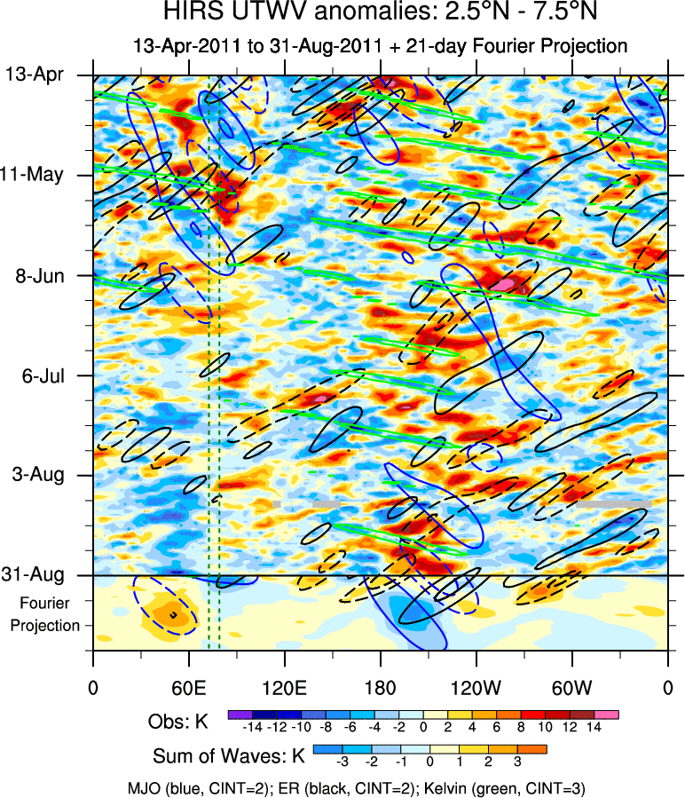 To identify tropical waves in near real-time, the OLR and UTWV data are filtered following Wheeler & Weickmann (2001 MWR). The daily anomalies are calculated using the first 3 harmonics of the seasonal cycle for 1979–2009. Missing values are then filled using linear interpolation in space and time. The most recent 365 days of anomalies are padded with 659 days of zeroes, and the result is filtered for each wave type.