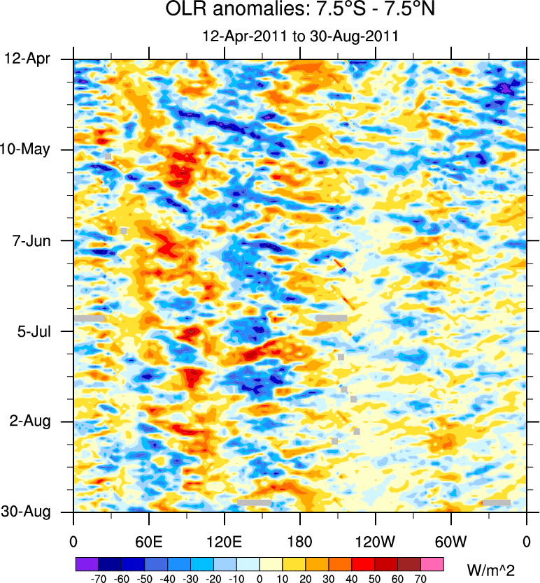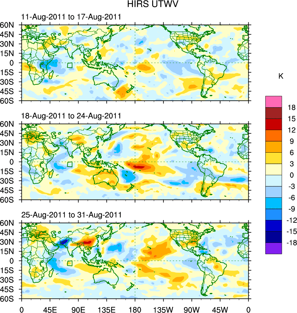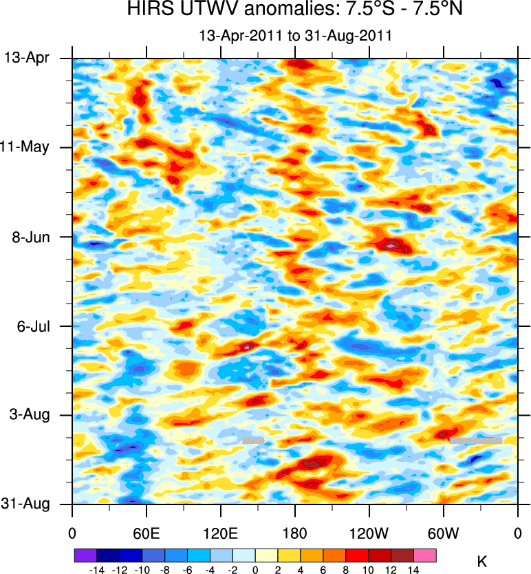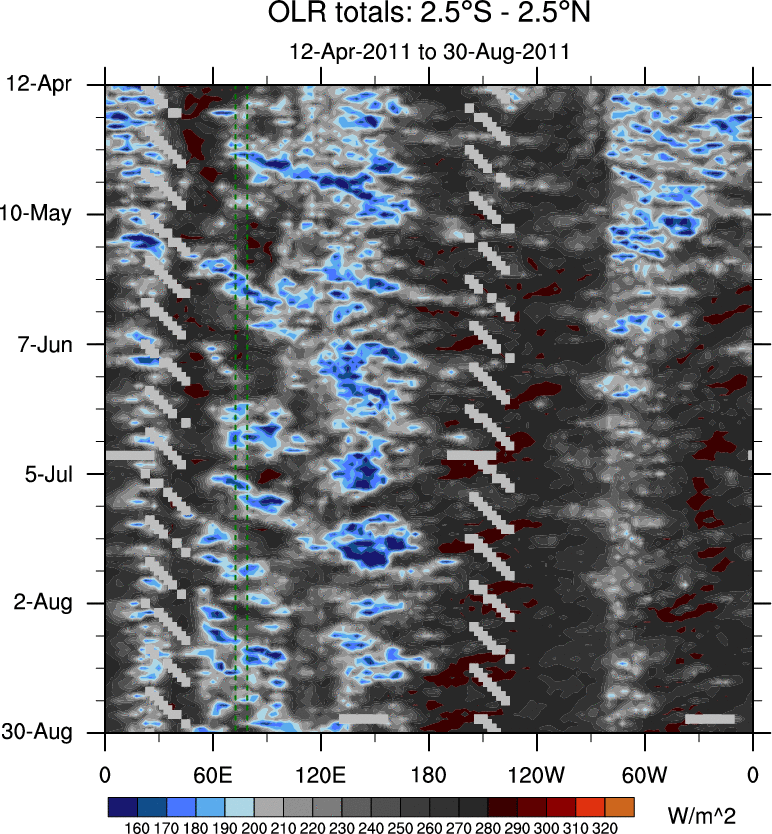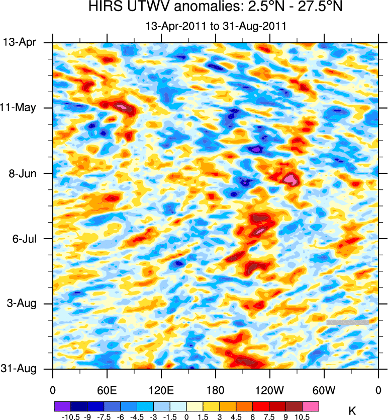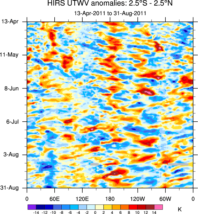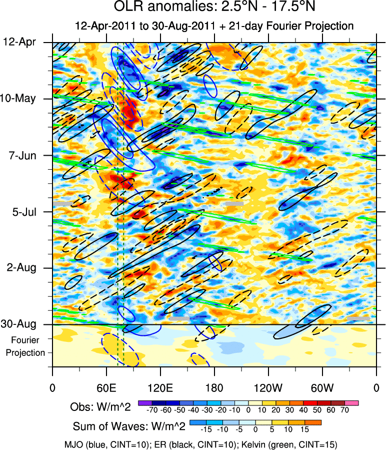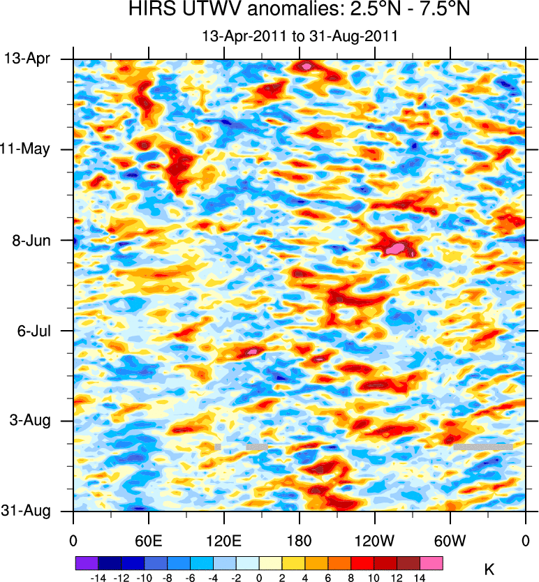 To identify tropical waves in near real-time, the OLR and UTWV data are filtered following Wheeler & Weickmann (2001 MWR). The daily anomalies are calculated using the first 3 harmonics of the seasonal cycle for 1979–2009. Missing values are then filled using linear interpolation in space and time. The most recent 365 days of anomalies are padded with 659 days of zeroes, and the result is filtered for each wave type.