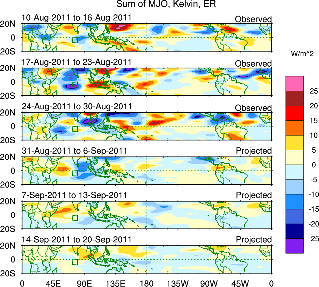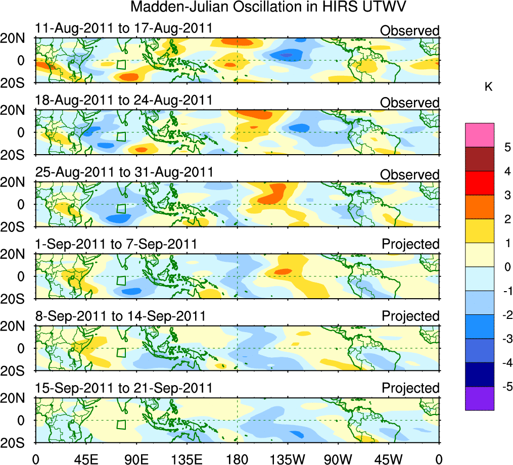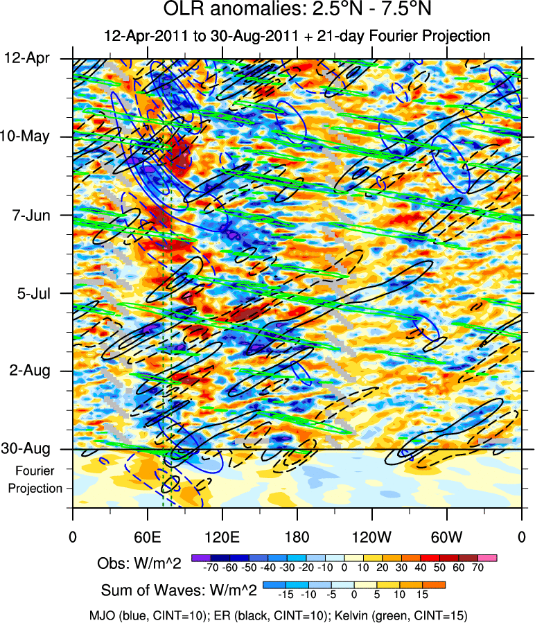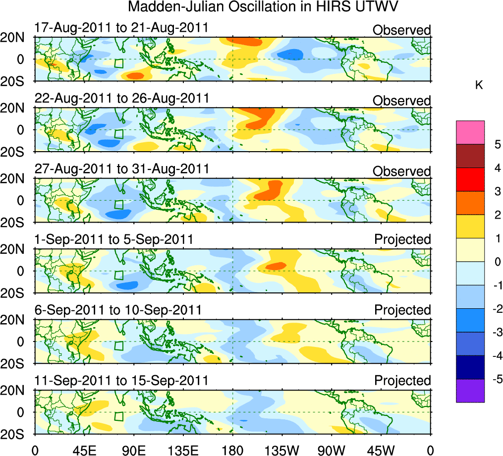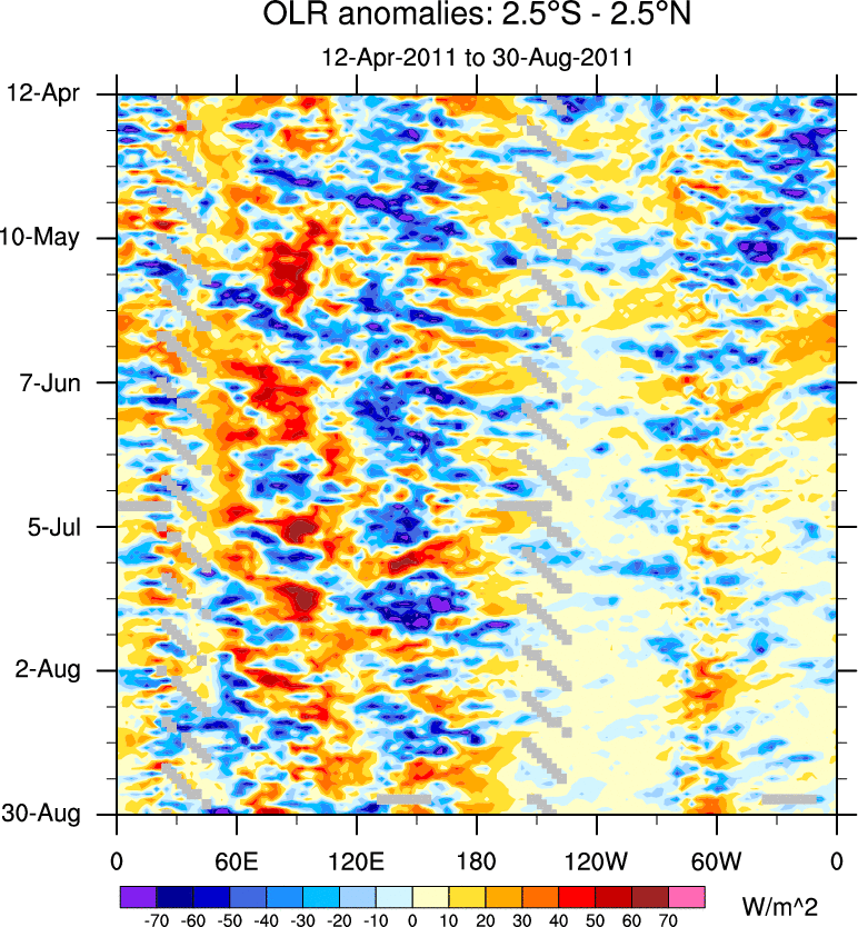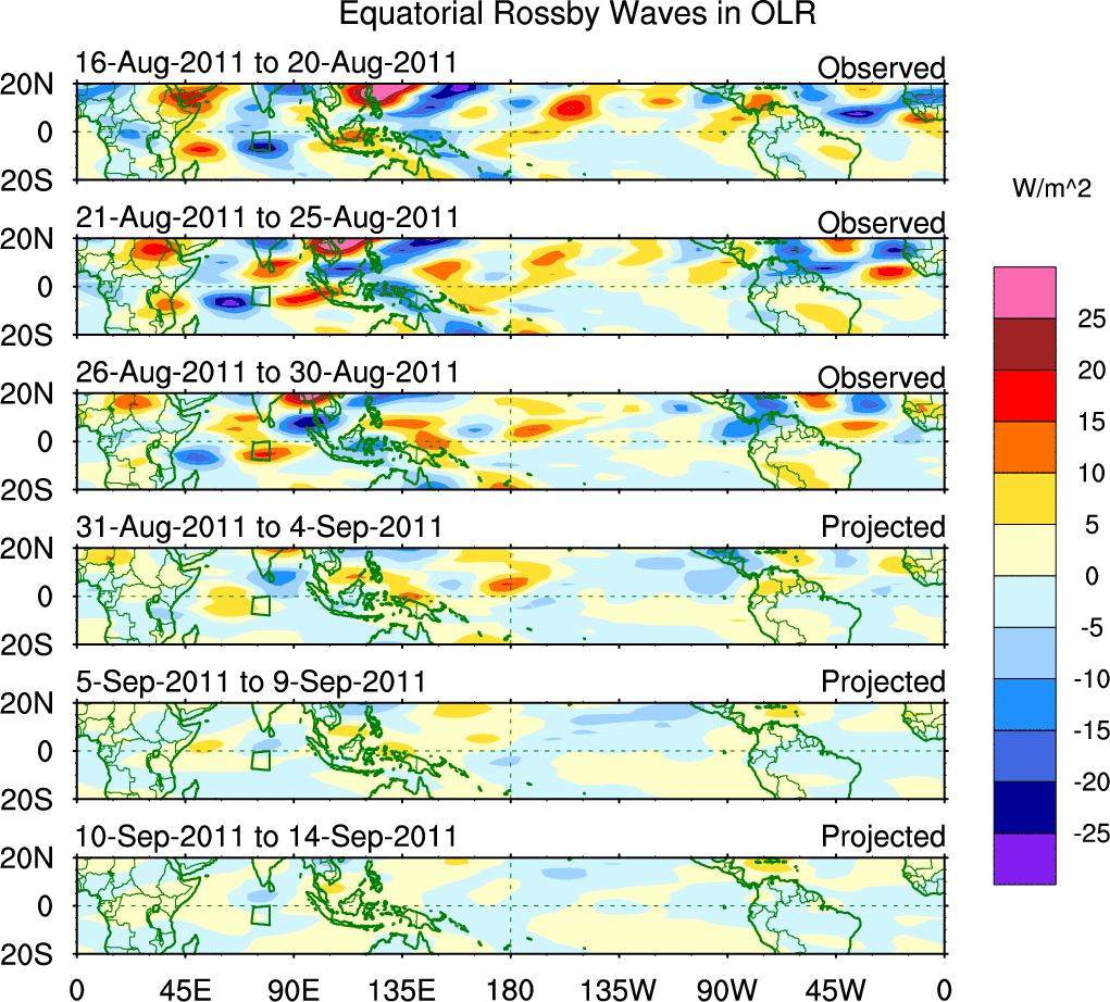 To identify tropical waves in near real-time, the OLR and UTWV data are filtered following Wheeler & Weickmann (2001 MWR). The daily anomalies are calculated using the first 3 harmonics of the seasonal cycle for 1979–2009. Missing values are then filled using linear interpolation in space and time. The most recent 365 days of anomalies are padded with 659 days of zeroes, and the result is filtered for each wave type.