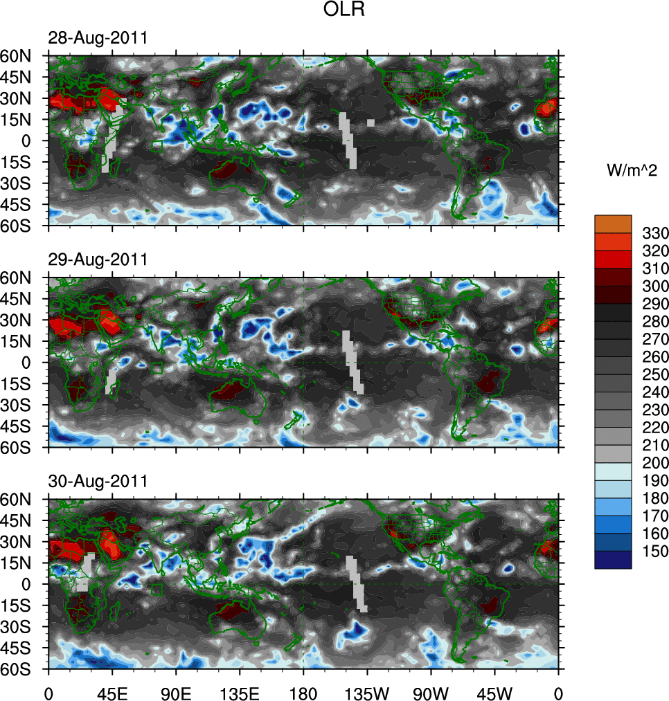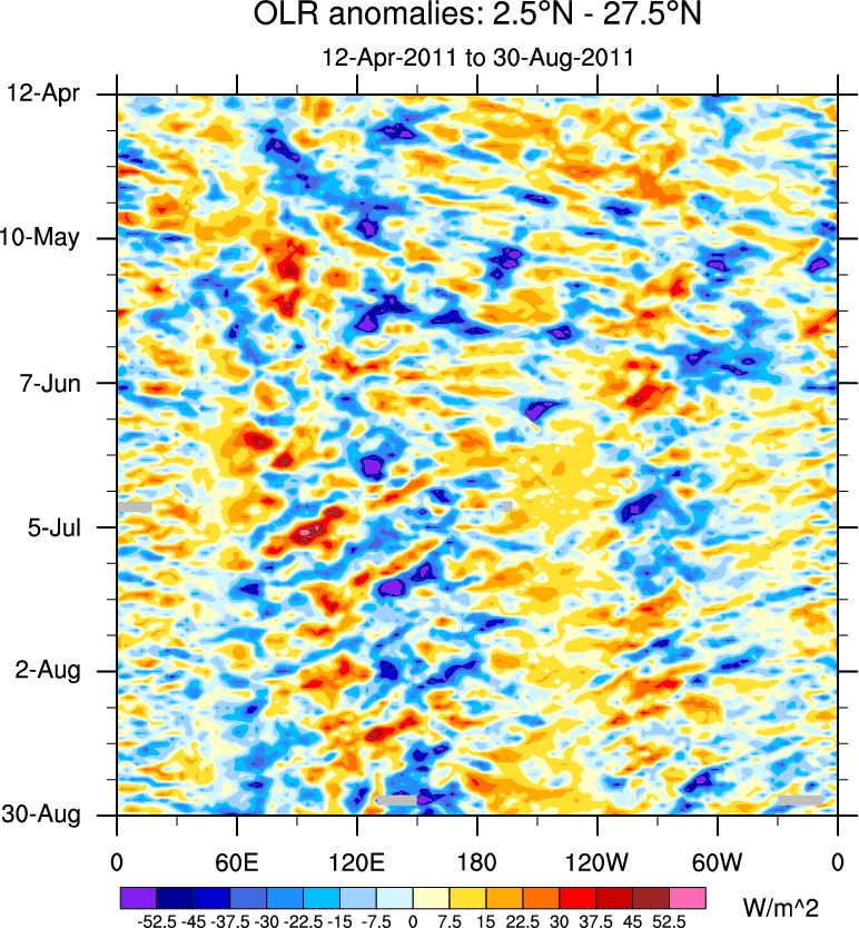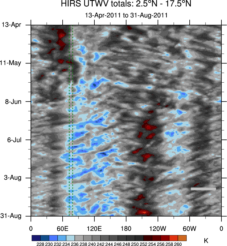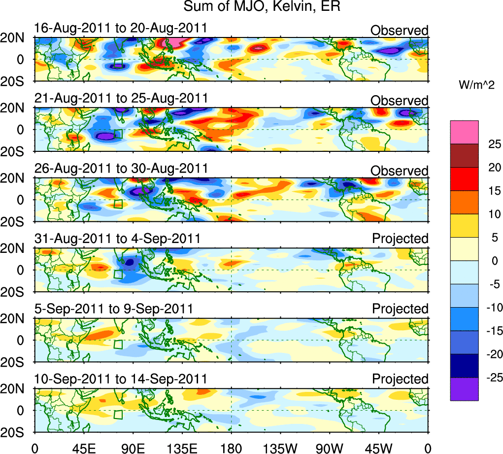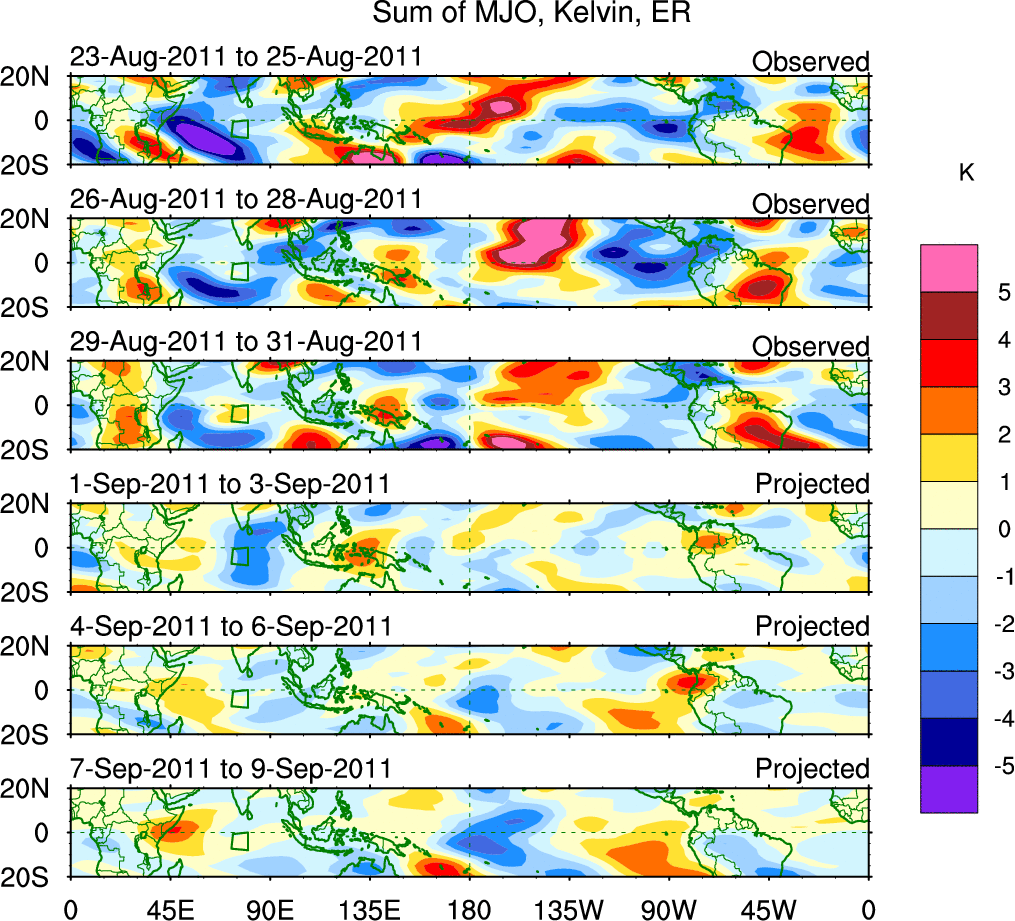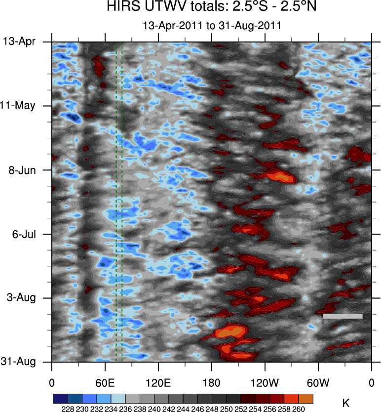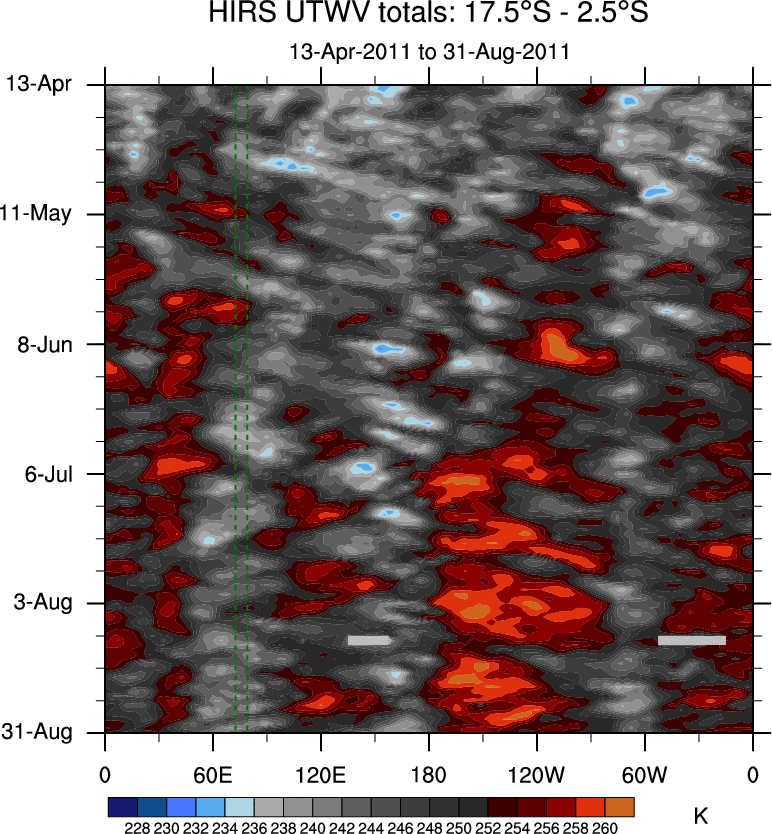 To identify tropical waves in near real-time, the OLR and UTWV data are filtered following Wheeler & Weickmann (2001 MWR). The daily anomalies are calculated using the first 3 harmonics of the seasonal cycle for 1979–2009. Missing values are then filled using linear interpolation in space and time. The most recent 365 days of anomalies are padded with 659 days of zeroes, and the result is filtered for each wave type.