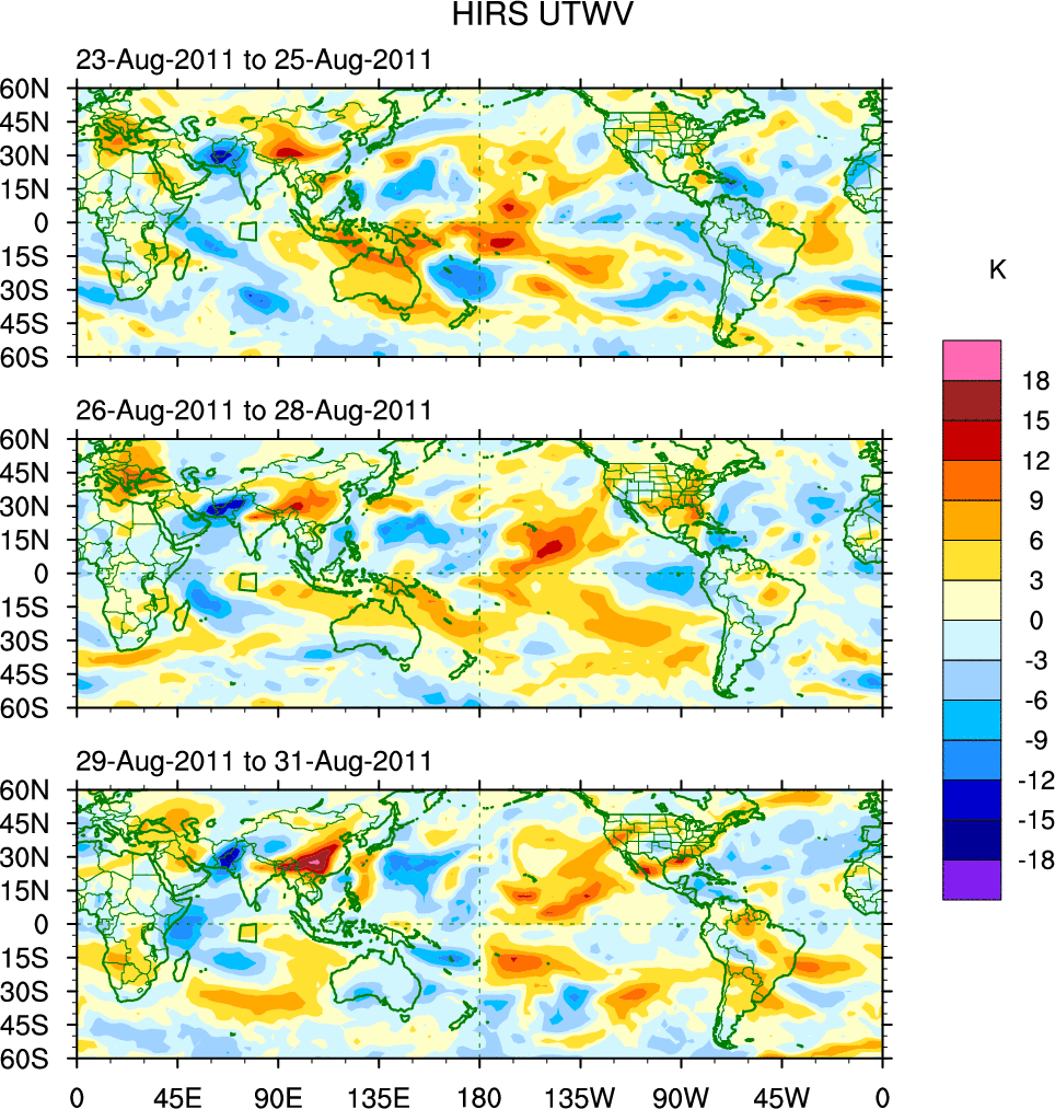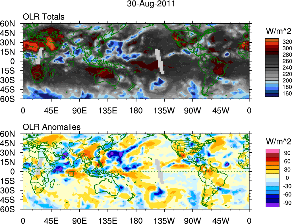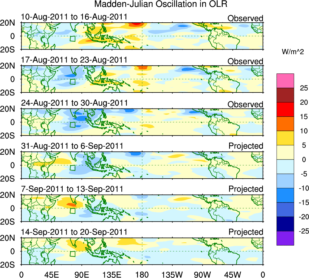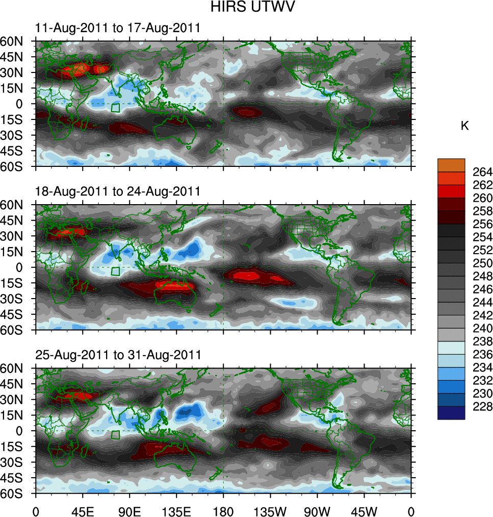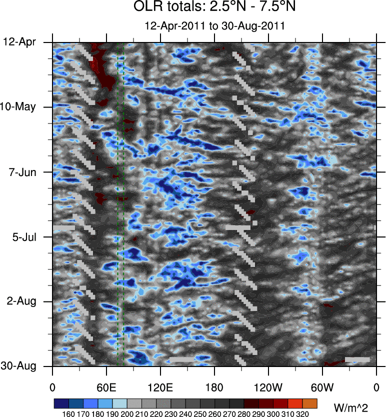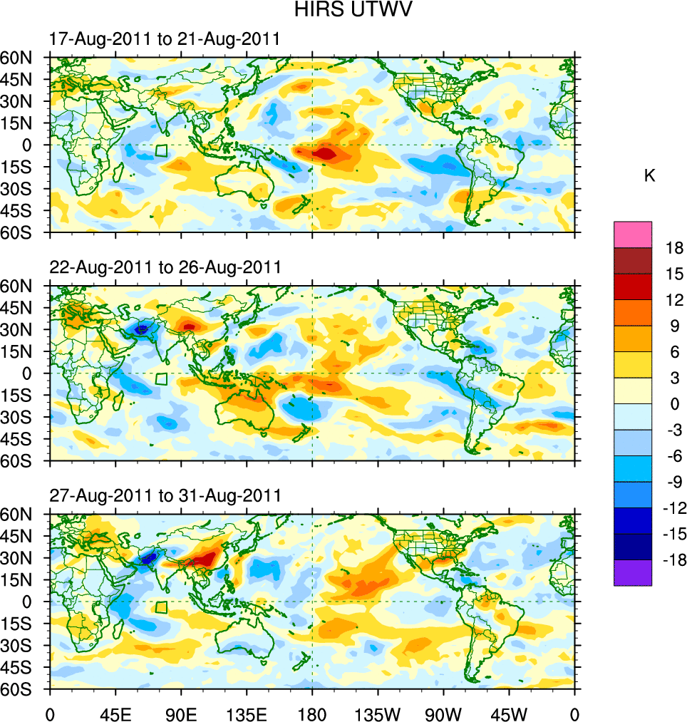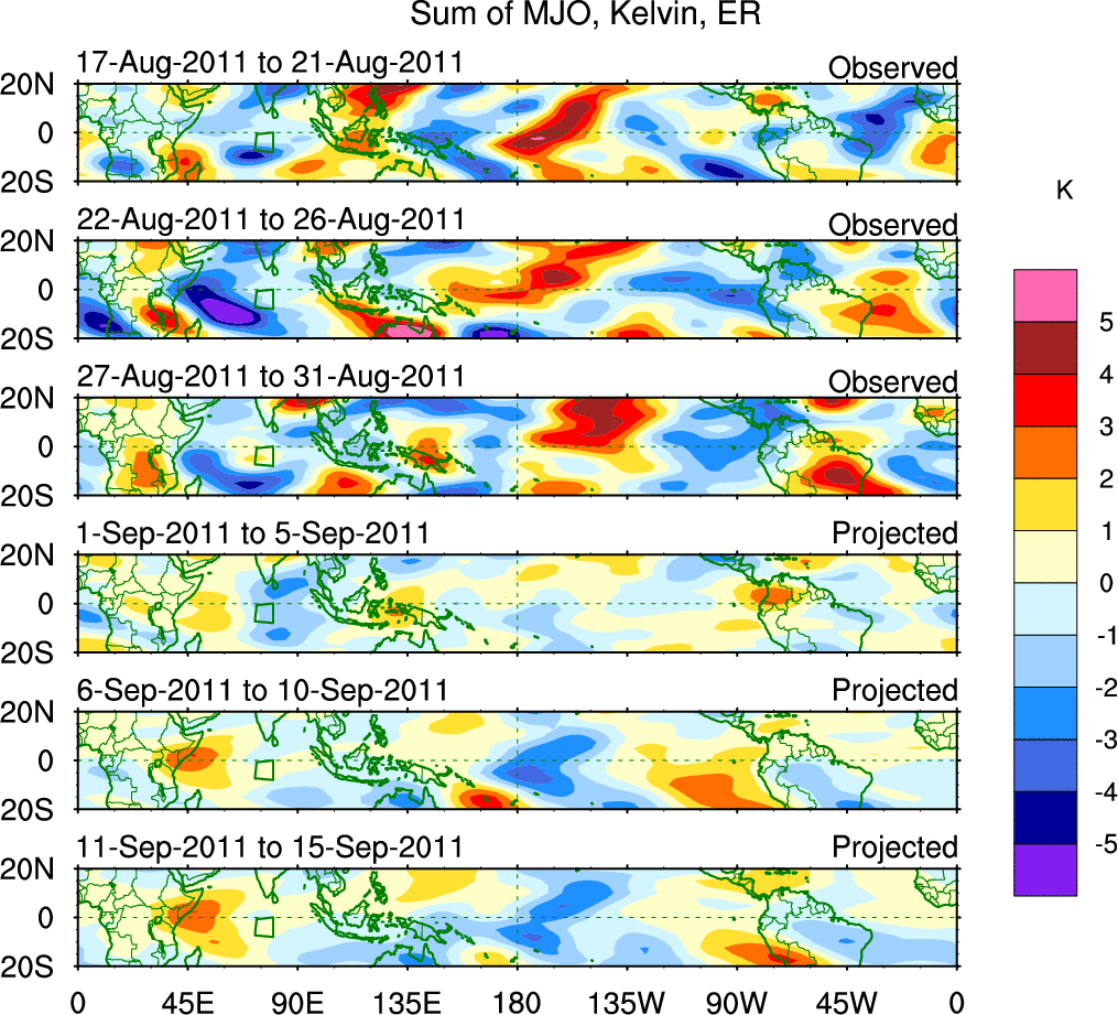 To identify tropical waves in near real-time, the OLR and UTWV data are filtered following Wheeler & Weickmann (2001 MWR). The daily anomalies are calculated using the first 3 harmonics of the seasonal cycle for 1979–2009. Missing values are then filled using linear interpolation in space and time. The most recent 365 days of anomalies are padded with 659 days of zeroes, and the result is filtered for each wave type.