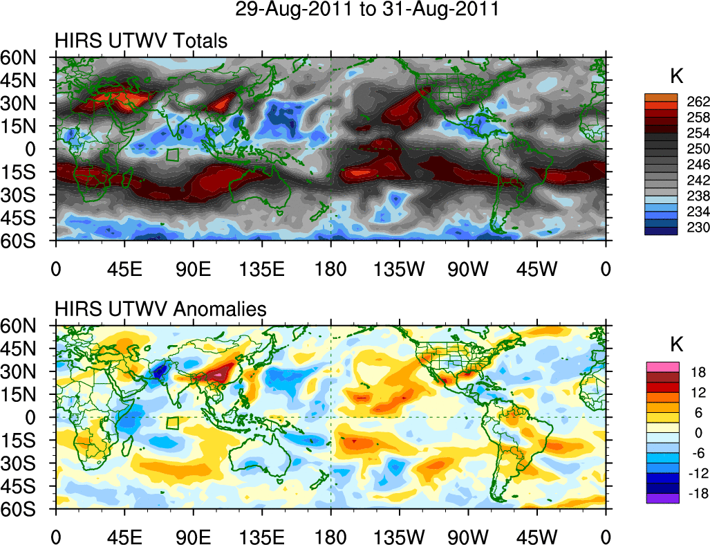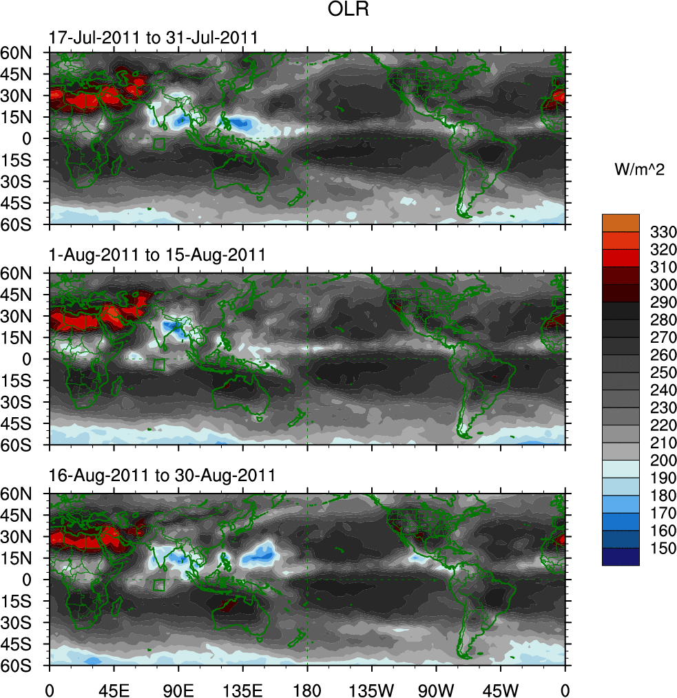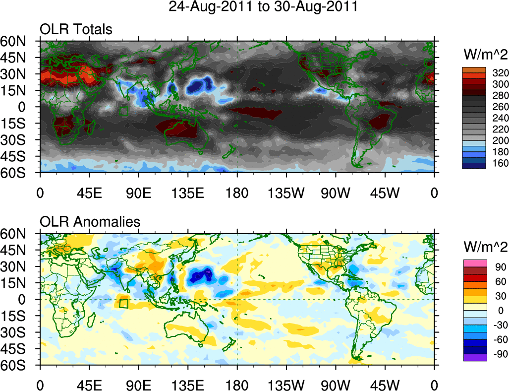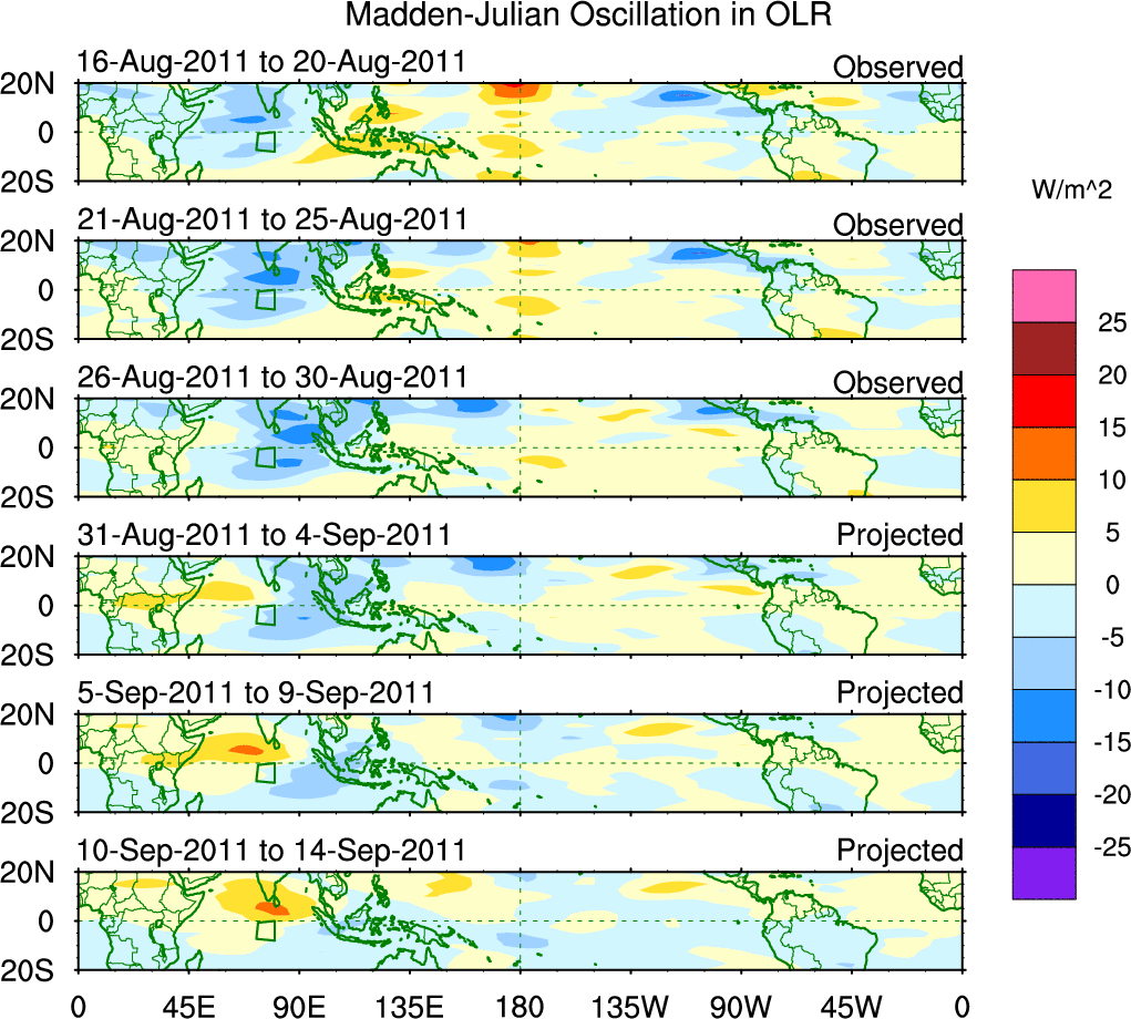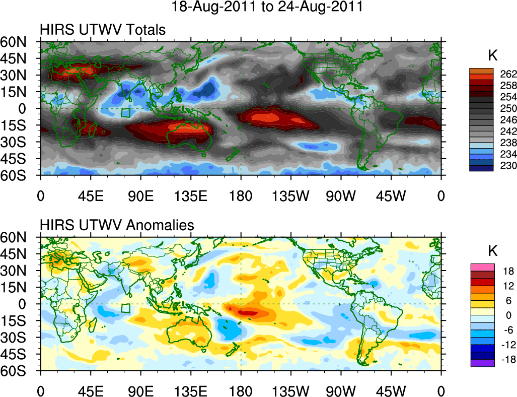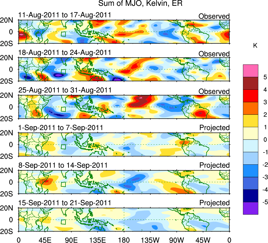 To identify tropical waves in near real-time, the OLR and UTWV data are filtered following Wheeler & Weickmann (2001 MWR). The daily anomalies are calculated using the first 3 harmonics of the seasonal cycle for 1979–2009. Missing values are then filled using linear interpolation in space and time. The most recent 365 days of anomalies are padded with 659 days of zeroes, and the result is filtered for each wave type.