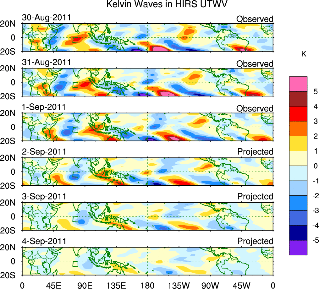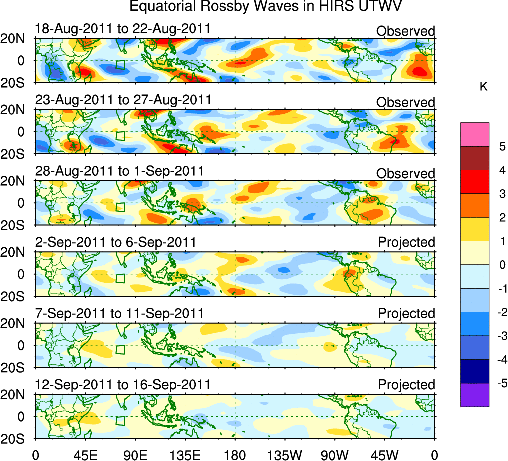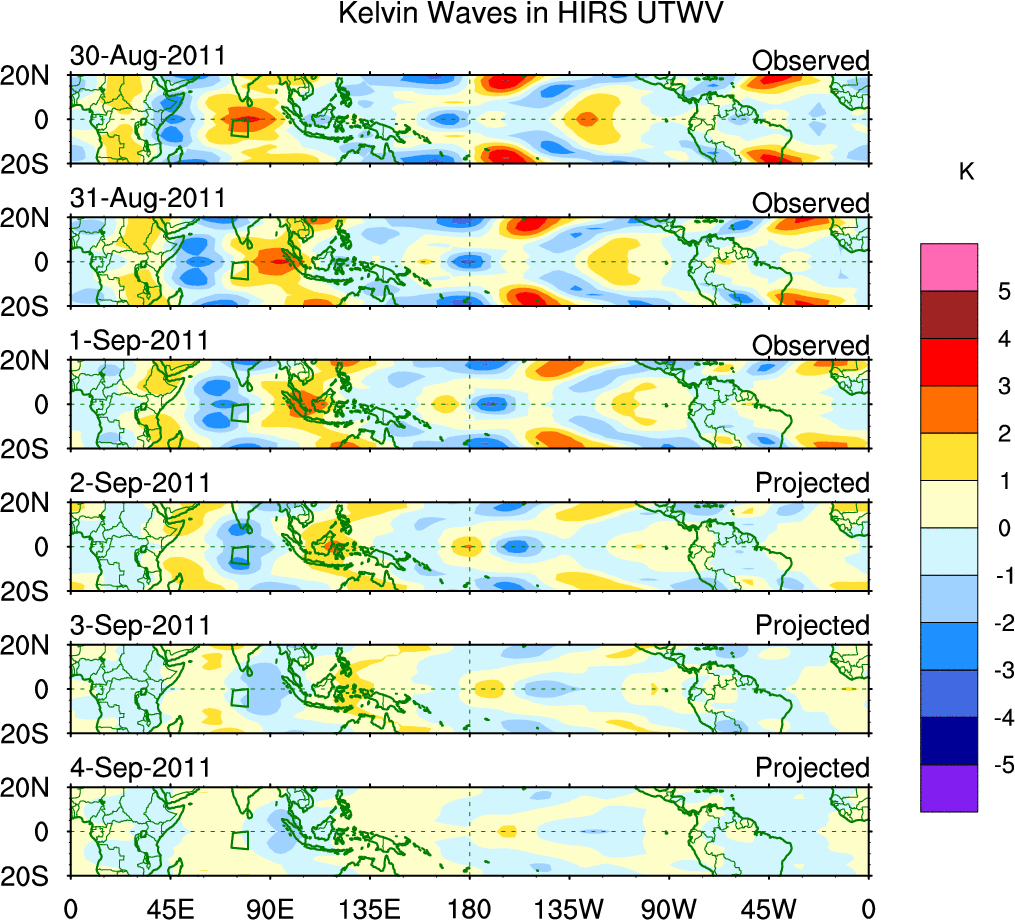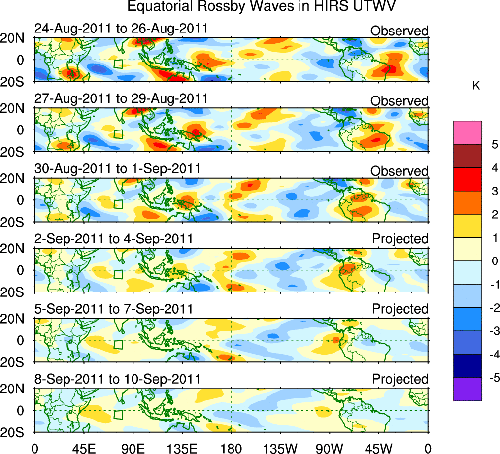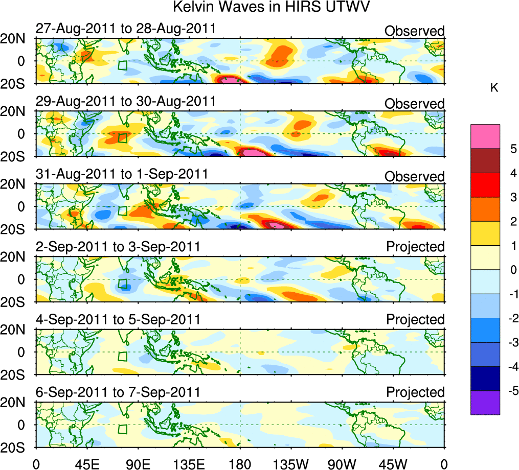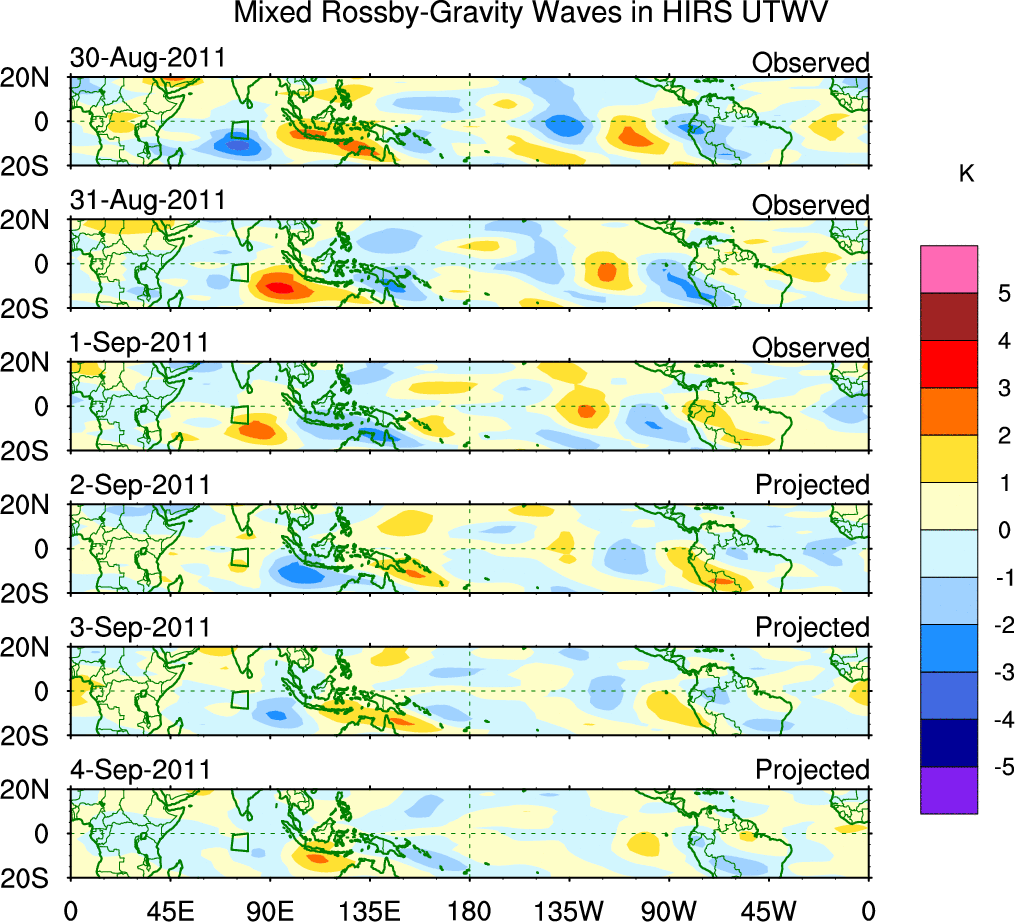 To identify tropical waves in near real-time, the OLR and UTWV data are filtered following Wheeler & Weickmann (2001 MWR). The daily anomalies are calculated using the first 3 harmonics of the seasonal cycle for 1979–2009. Missing values are then filled using linear interpolation in space and time. The most recent 365 days of anomalies are padded with 659 days of zeroes, and the result is filtered for each wave type.