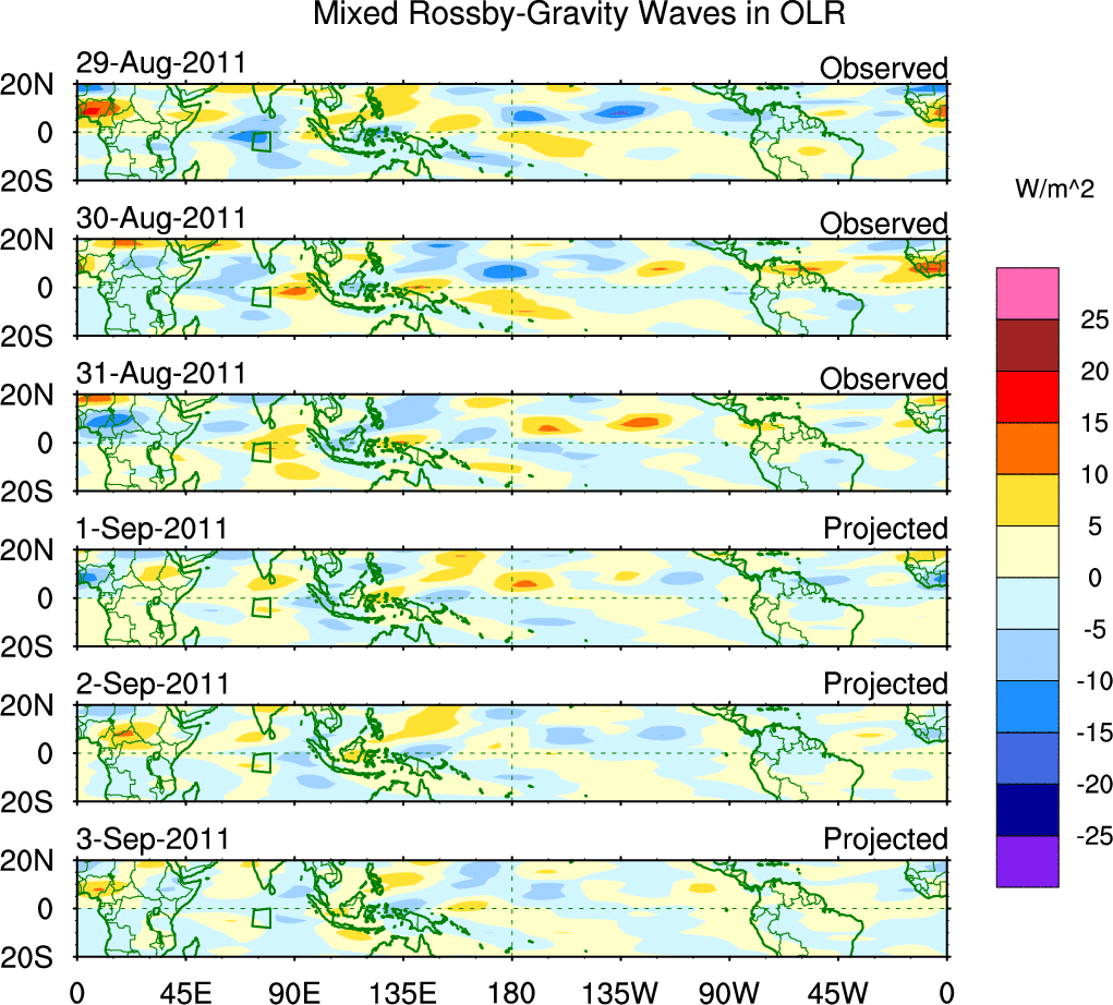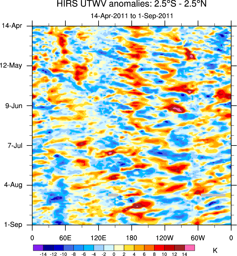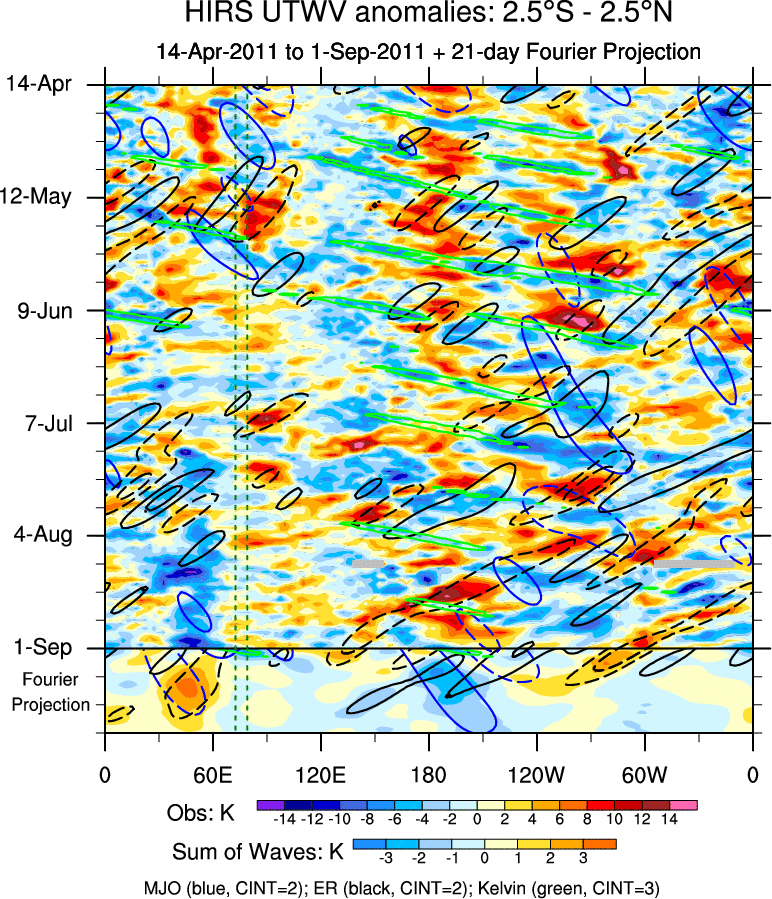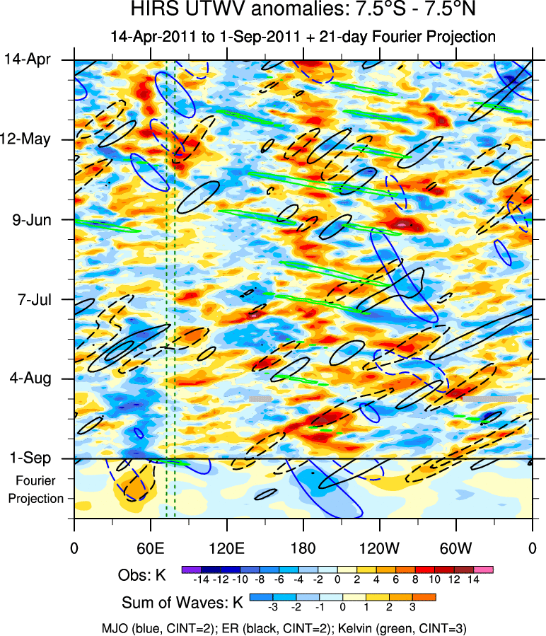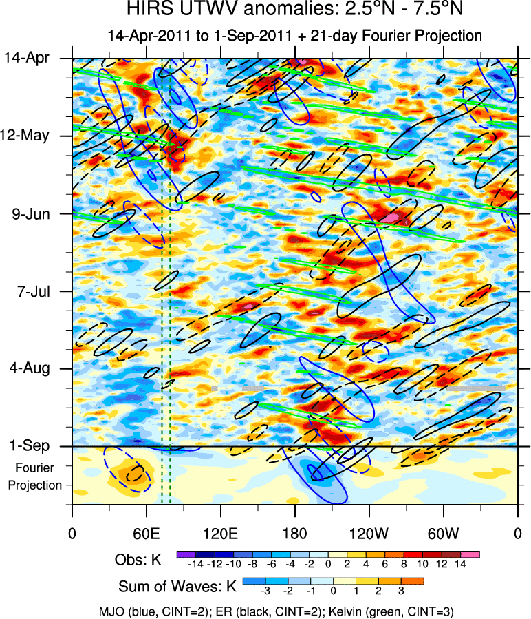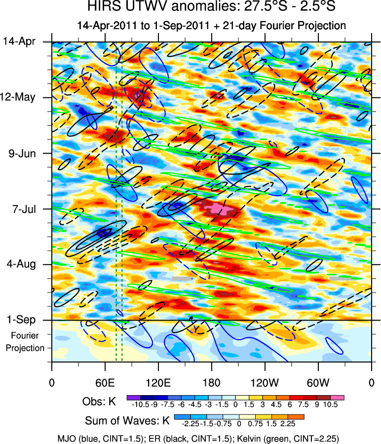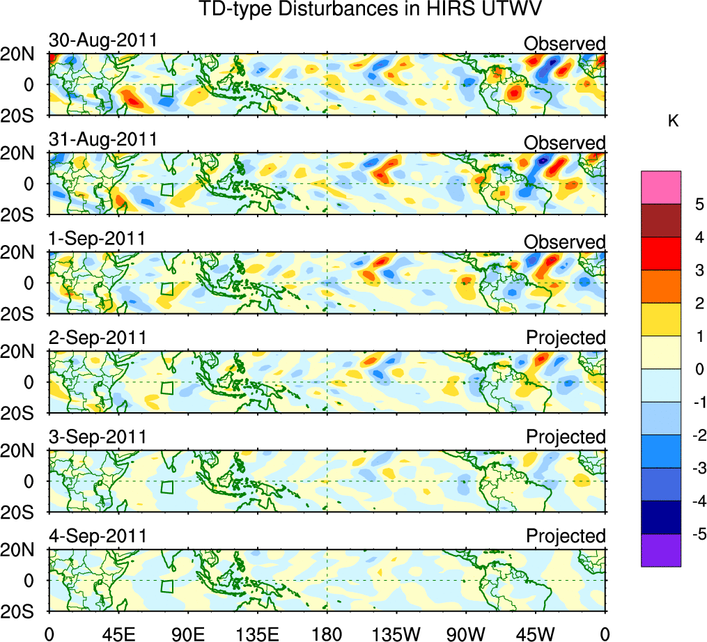 To identify tropical waves in near real-time, the OLR and UTWV data are filtered following Wheeler & Weickmann (2001 MWR). The daily anomalies are calculated using the first 3 harmonics of the seasonal cycle for 1979–2009. Missing values are then filled using linear interpolation in space and time. The most recent 365 days of anomalies are padded with 659 days of zeroes, and the result is filtered for each wave type.