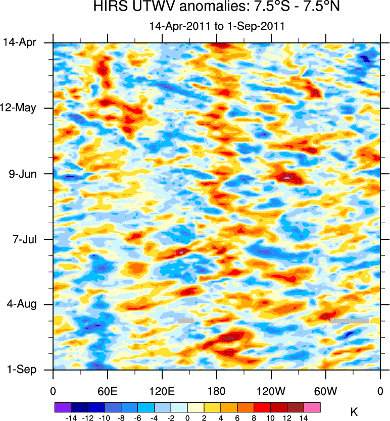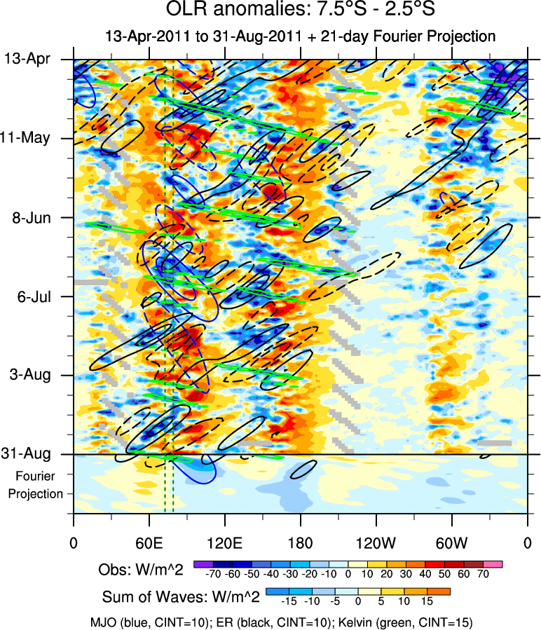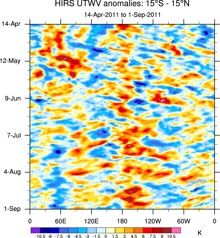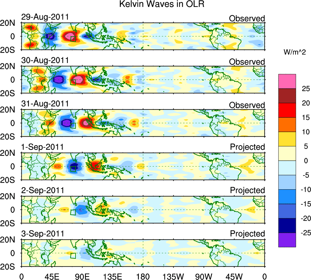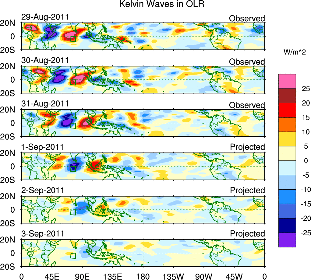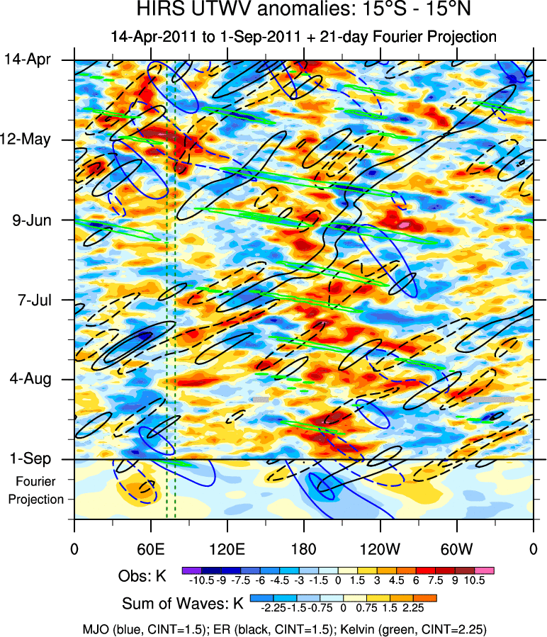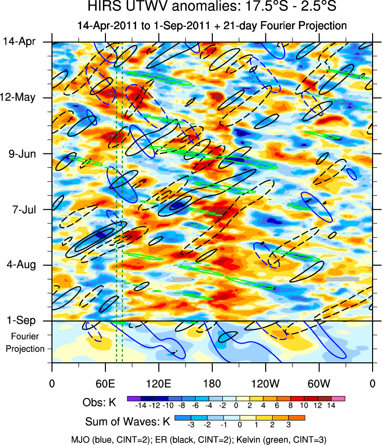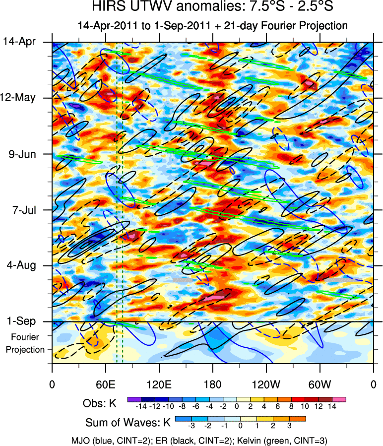 To identify tropical waves in near real-time, the OLR and UTWV data are filtered following Wheeler & Weickmann (2001 MWR). The daily anomalies are calculated using the first 3 harmonics of the seasonal cycle for 1979–2009. Missing values are then filled using linear interpolation in space and time. The most recent 365 days of anomalies are padded with 659 days of zeroes, and the result is filtered for each wave type.